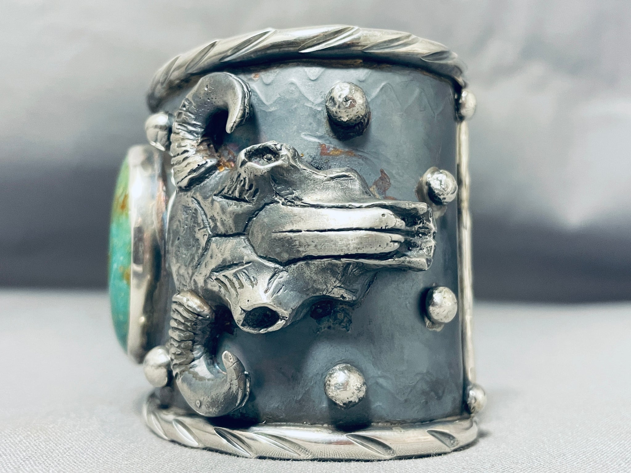 This is a magnificent Native American large very wide cuff single stone silver cuff bracelet. This phenomenal bracelet contains a beautiful large chunky center Royston turquoise stone. Accenting the stone are two impeccable large hand carved silver skull patterns that are 3D. Also located throughout the wide silver cuff are amazing large silver raindrops. Bordering the cuff are superior protruding edges with accenting deep wave works. Located on the inside of the very wide cuff are wonderful internal silver plant stampings. The center stone measures around 1-3/8" x 1-1/4". The width of the bracelet measures around 2-1/4". Signed by artist, Jake Troncos . Sterling silver, marked. Cir. 1980's+. The inside end to end measures around 6" with an additional 1-1/4" gap. Sturdy 140 grams.