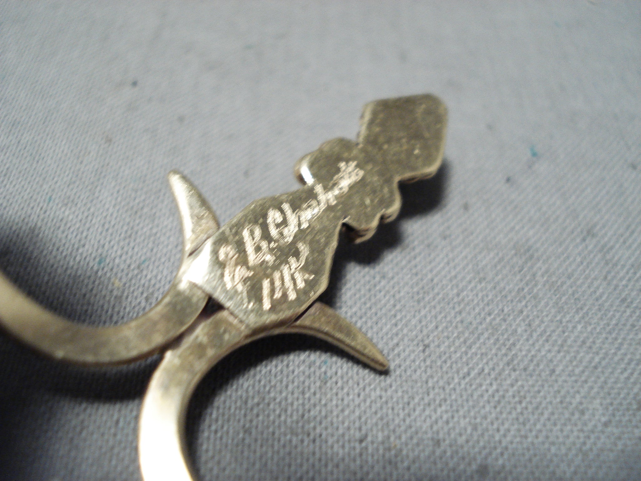 This is a marvelous vintage Navajo solid 14k gold bracelet. This bracelet is absolutely incredible and rare as it consists of solid 14k gold. Located on the beautifully unique shaped gold cuff are superior inlaid Sleeping Beauty turquoise stones. The width of the bracelet measures around 1-3/8". Signed by Navajo artist, EB Ghahate. 14k marked. Cir. 1970's+. The inside end to end measures around 5" with an additional 7/8" gap. Sturdy 8 grams.