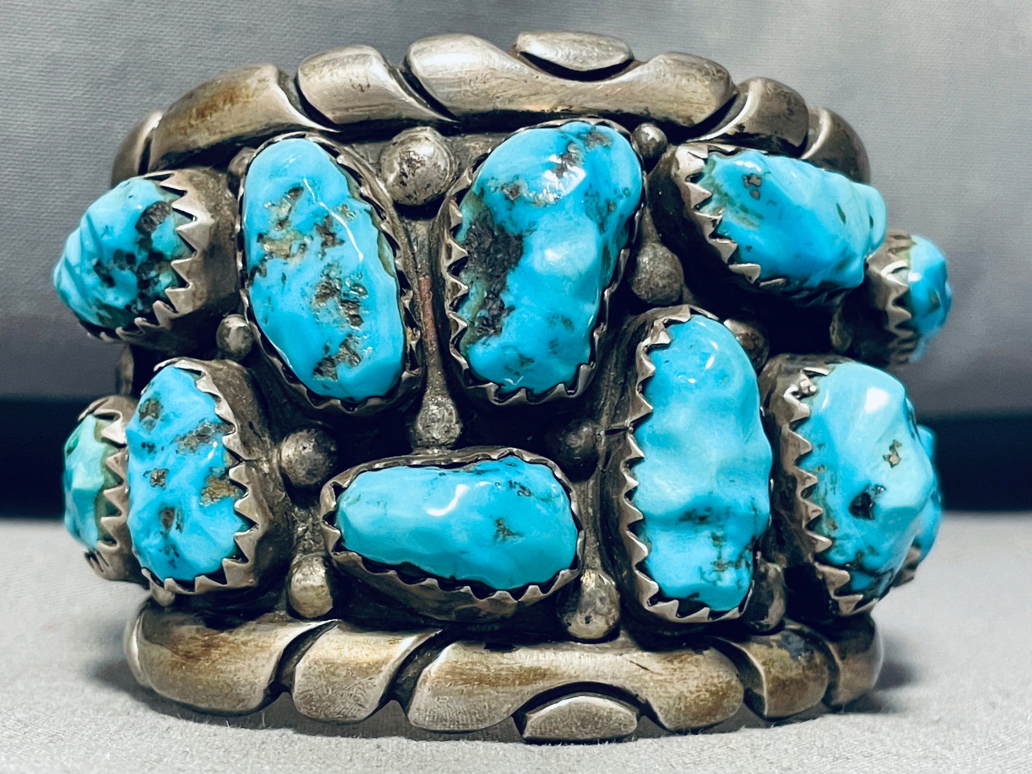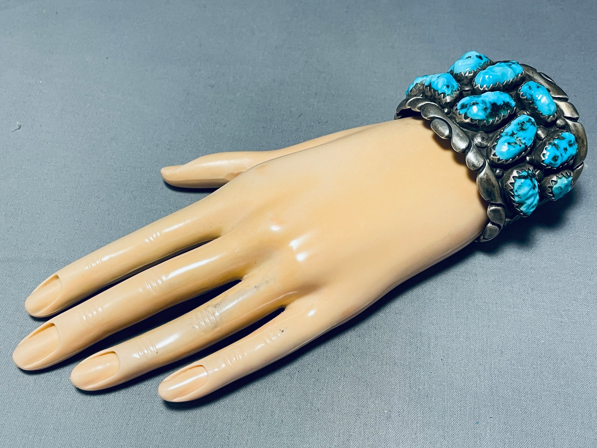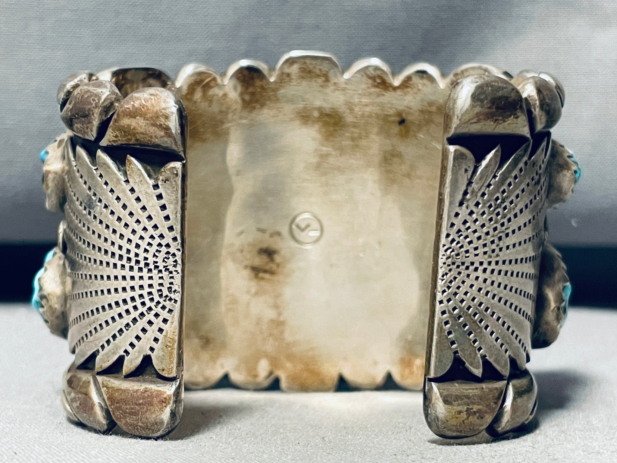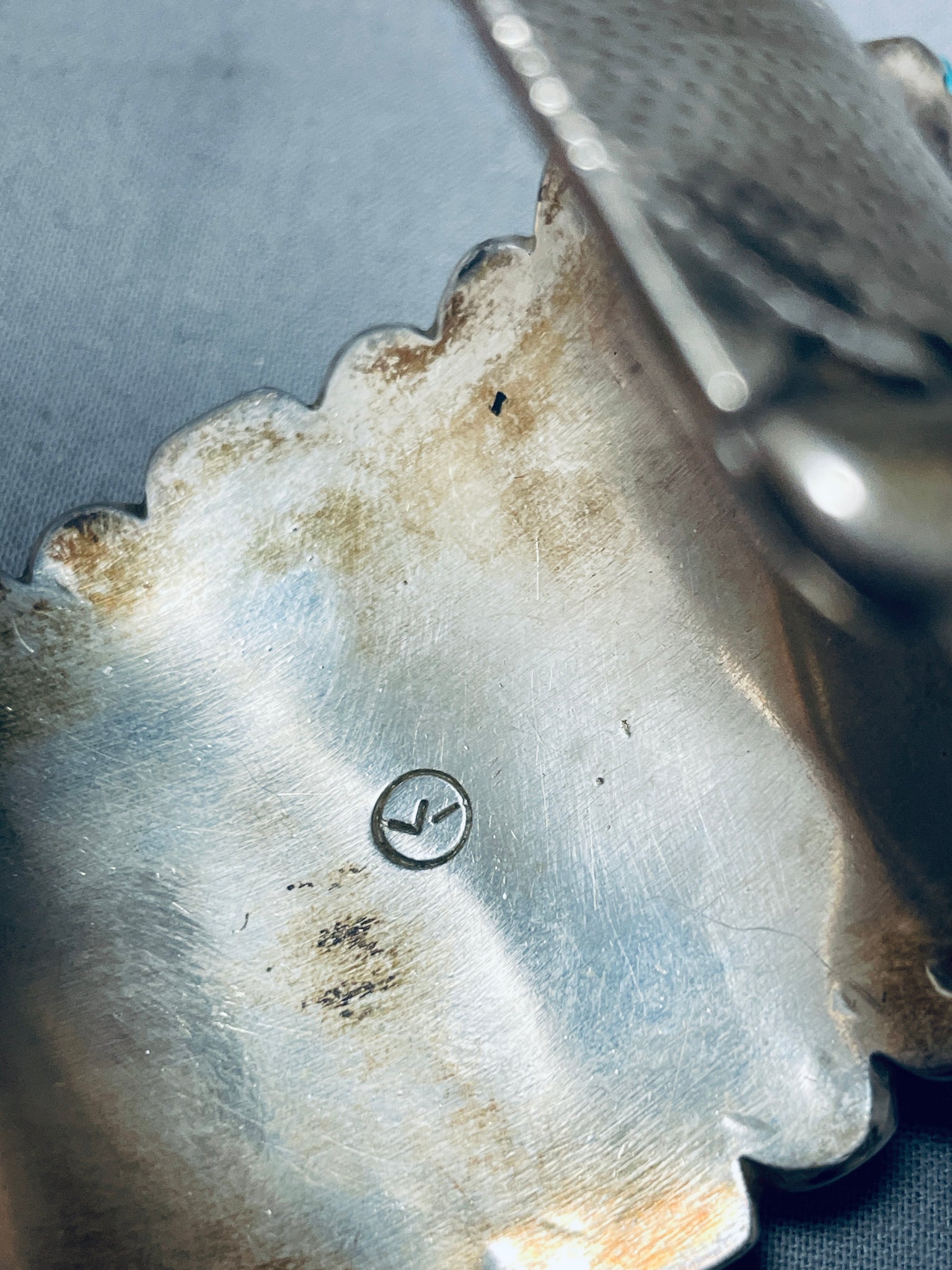 This is an impressive vintage Navajo very large and wide thick silver cuff bracelet. This impeccable bracelet contains a plethora of hand cut and hand carved Blue Gem turquoise stones, a total of 11 chunky stones. Situated throughout all of the stones are phenomenal silver raindrops with end accenting sun bursting stamped silver flanks. Bordering the protruding edges of the thick silver cuff are fascinating deep silver wave works. I absolutely love this mind blowing large silver cuff bracelet, getting rare to come across such large and gigantic silver cuff bracelets. The stones measure around 3/4" x 1/2". The width of the bracelet measures around 2". Signed by Navajo artist, V. Sterling silver. Cir. 1970's+. The inside end to end measures around 5-1/4" with an additional 1" gap. Sturdy 155 grams.