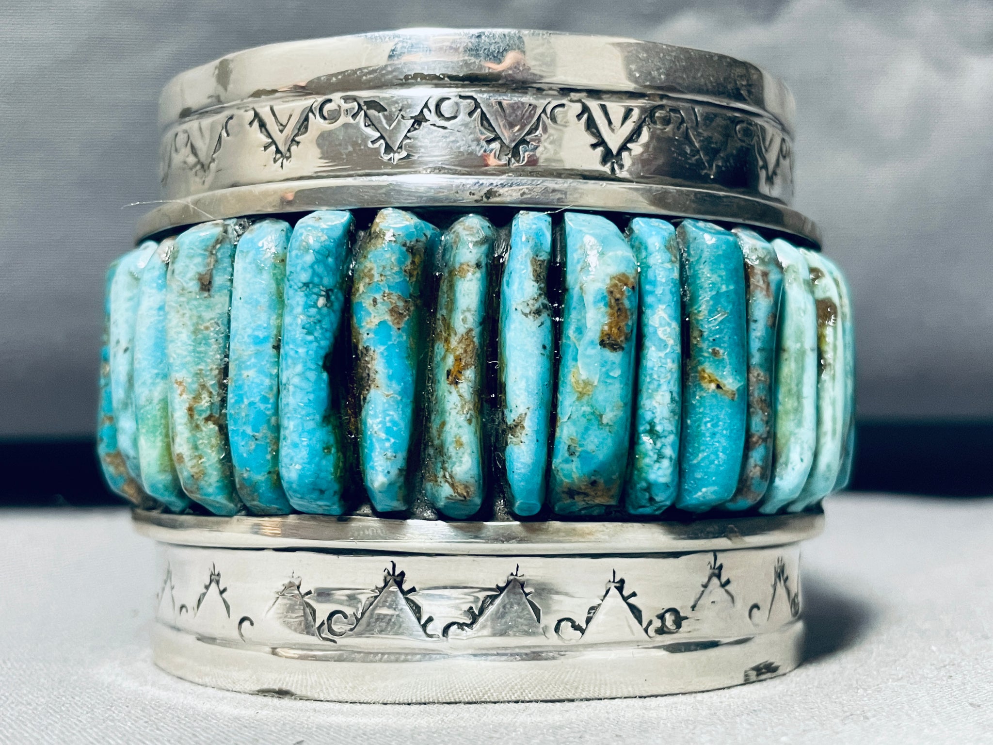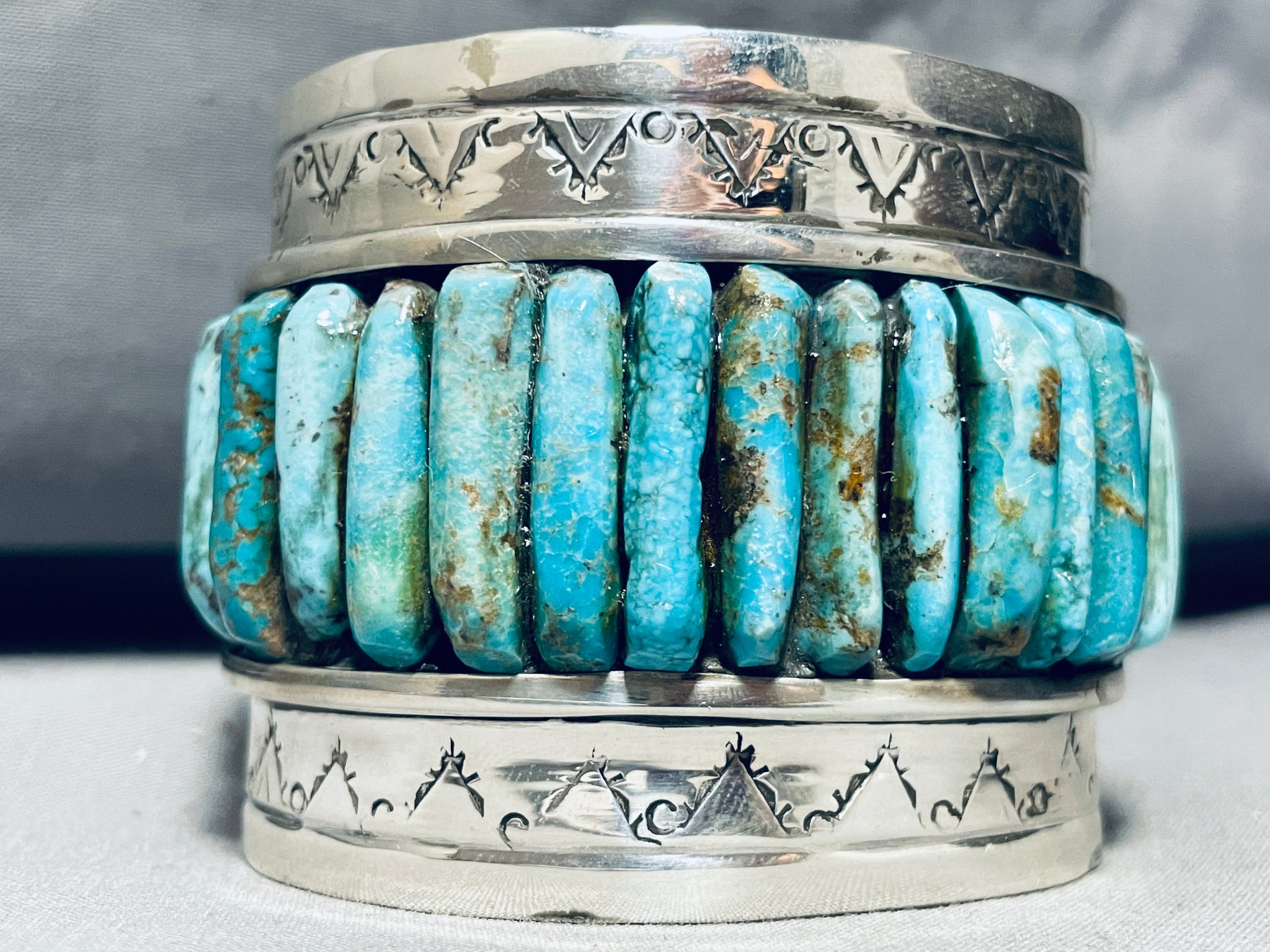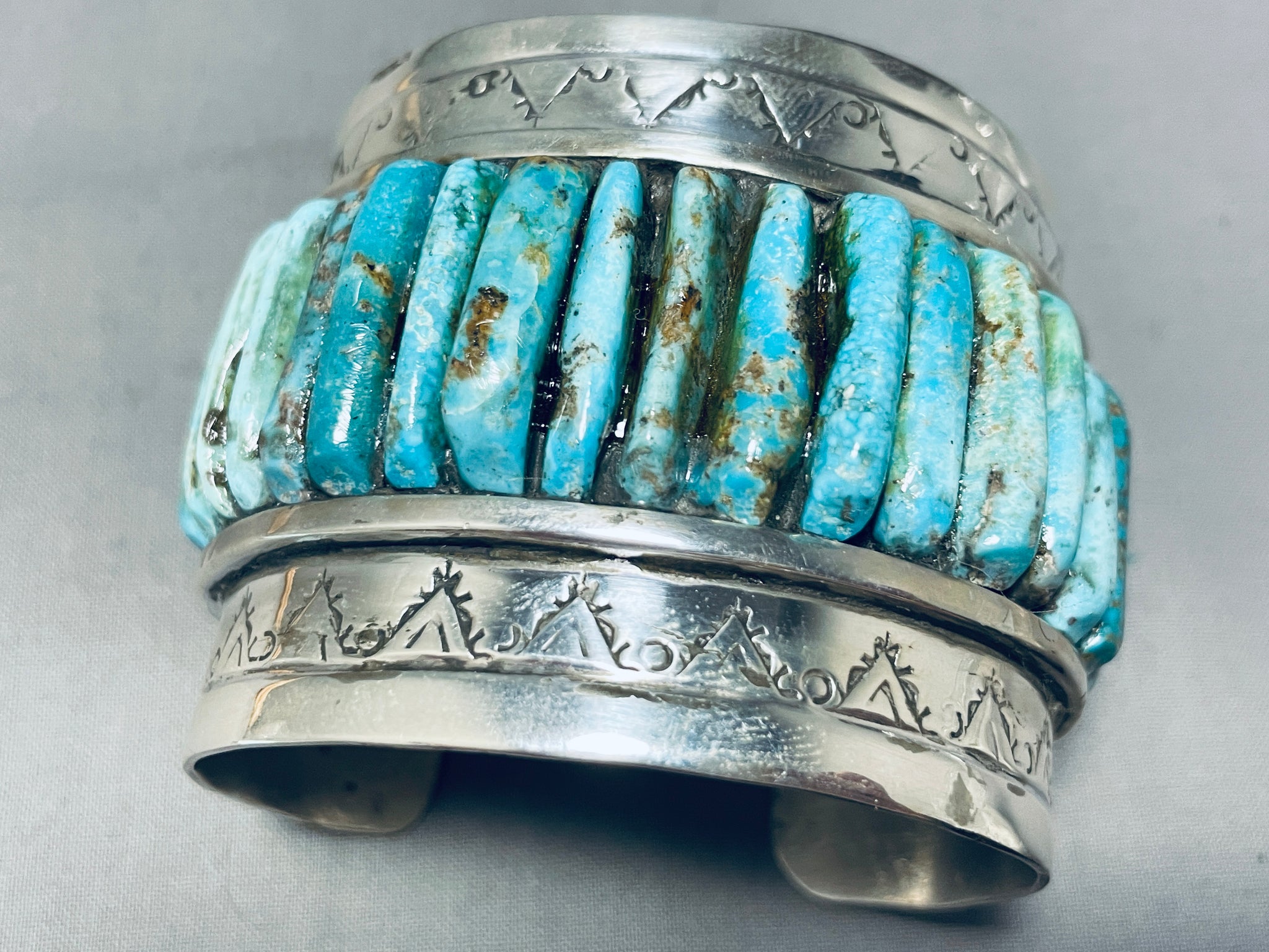 This is a breathtaking vintage Navajo very large and thick inlaid silver cuff bracelet. This outstanding bracelet contains a beautiful row of inlaid turquoise stones that protrude out from the cuff. The turquoise appears to be from the stunning Royston turquoise mine. Bordering the edges of the cuff are superior hand carved teepee patterns and dotted works. Such a remarkable large and thick wide silver cuff bracelet. The stones measure around 1" x 1/4". The width of the bracelet measures around 2-1/8". Sterling silver, marked. The inside end to end measures around 5-3/4" with an additional 1-1/4" gap. Sturdy 158 grams.
