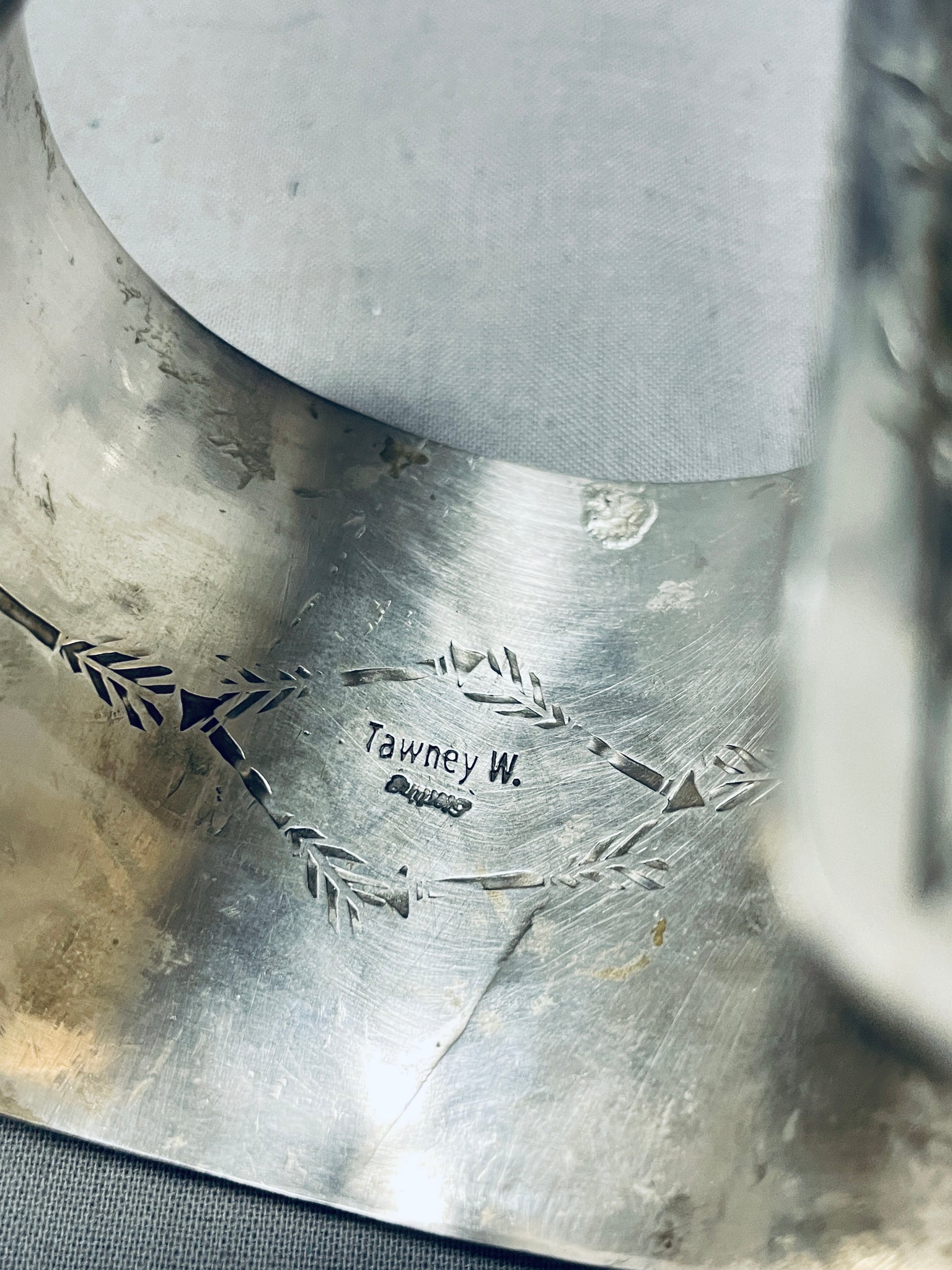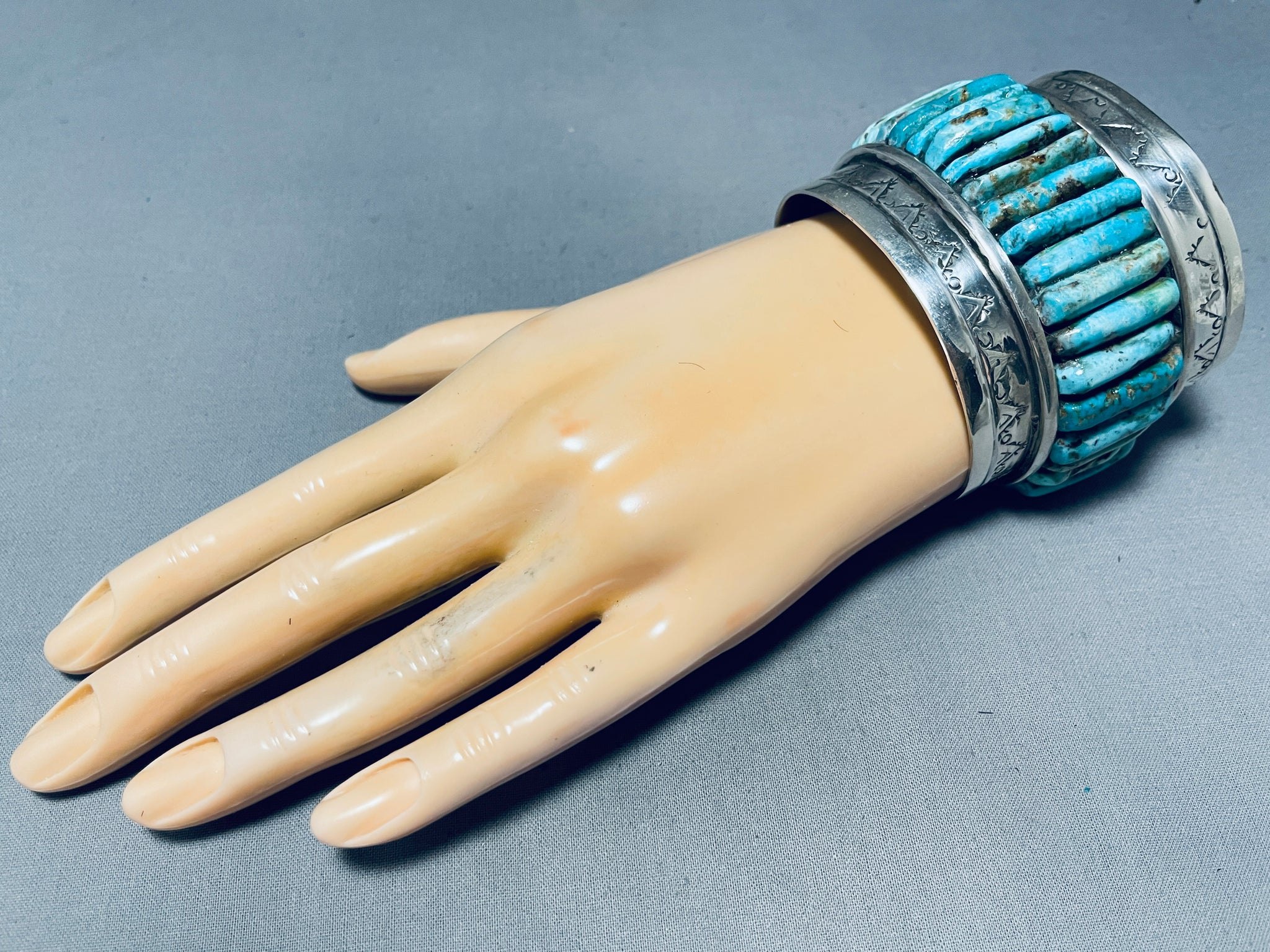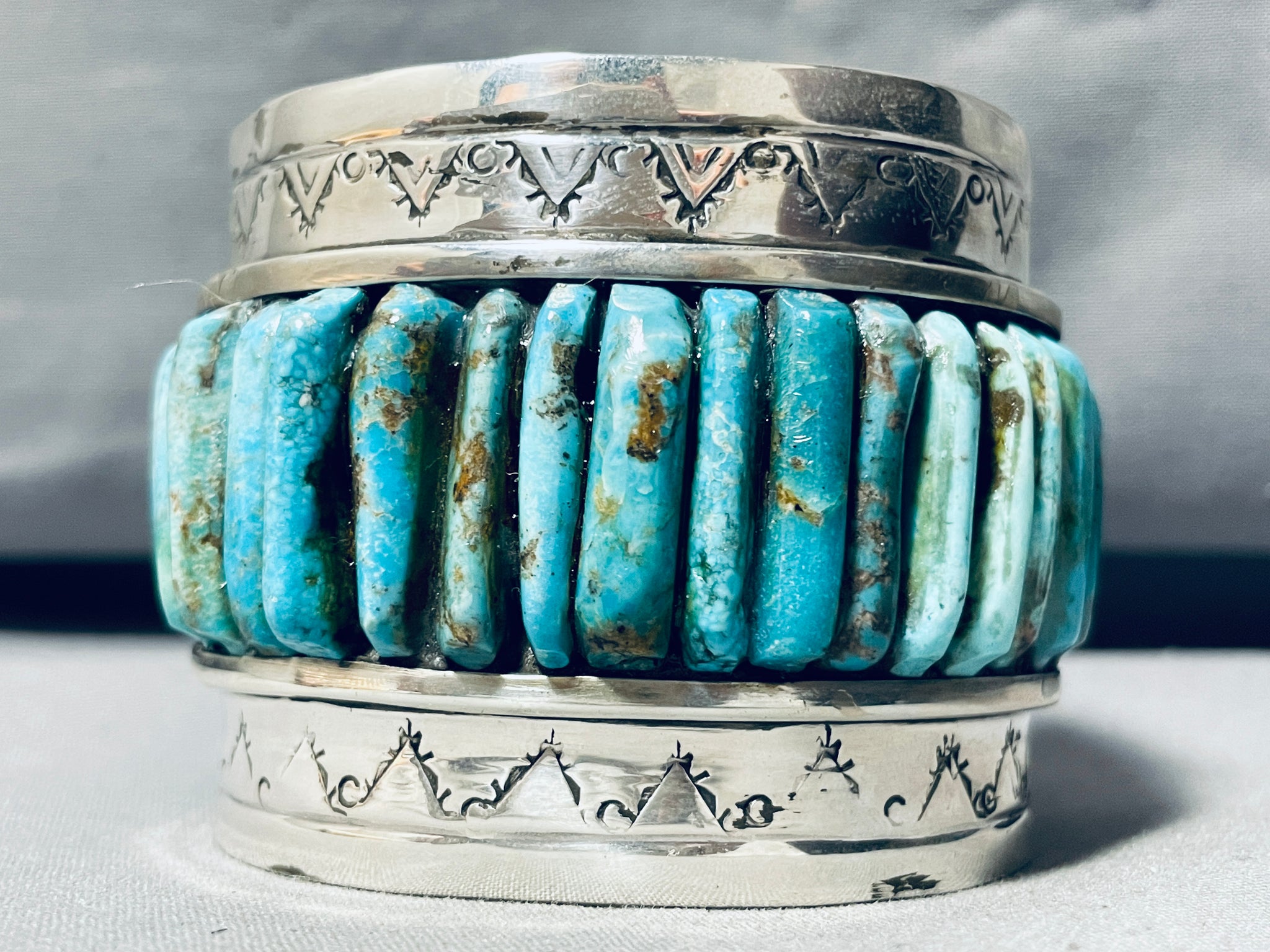 This is a breathtaking vintage Navajo very large and thick inlaid silver cuff bracelet. This outstanding bracelet contains a beautiful row of inlaid turquoise stones that protrude out from the cuff. The turquoise appears to be from the stunning Royston turquoise mine. Bordering the edges of the cuff are superior hand carved teepee patterns and dotted works. Such a remarkable large and thick wide silver cuff bracelet. The stones measure around 1" x 1/4". The width of the bracelet measures around 2-1/8". Sterling silver, marked. The inside end to end measures around 5-3/4" with an additional 1-1/4" gap. Sturdy 158 grams.