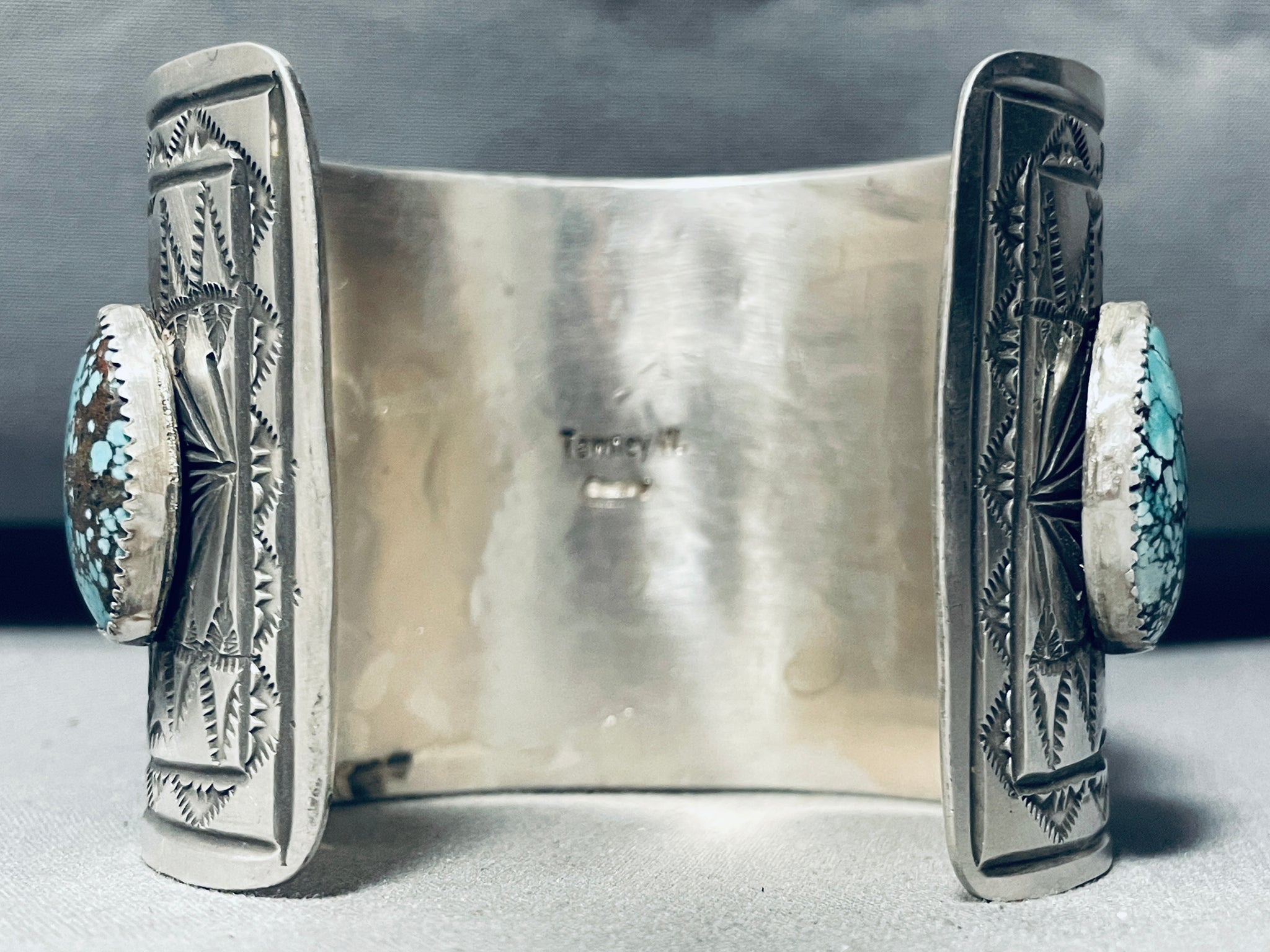 This is a magnificent vintage Navajo very large 3D silver horse cuff bracelet. This fascinating bracelet contains a center hand carved 3D silver horse head that is situated on an oval silver medallion. The medallion measures around 2" X 1-1/4". This remarkable bracelet contains four outstanding large chunky teardrop shaped green to blue colored turquoise stones. Running down both ends of the cuff are outstanding stamp works that consist of teepee patterns, line segments and sun works. I absolutely love this fascinating thick and wide silver cuff bracelet. The stones measure around 7/8" x 3/4". The width of the bracelet measures around 2-1/8". Sterling silver, marked. Cir. 1970's+. The inside end to end measures around 6" with an additional 1-1/2" gap. Sturdy 167 grams.