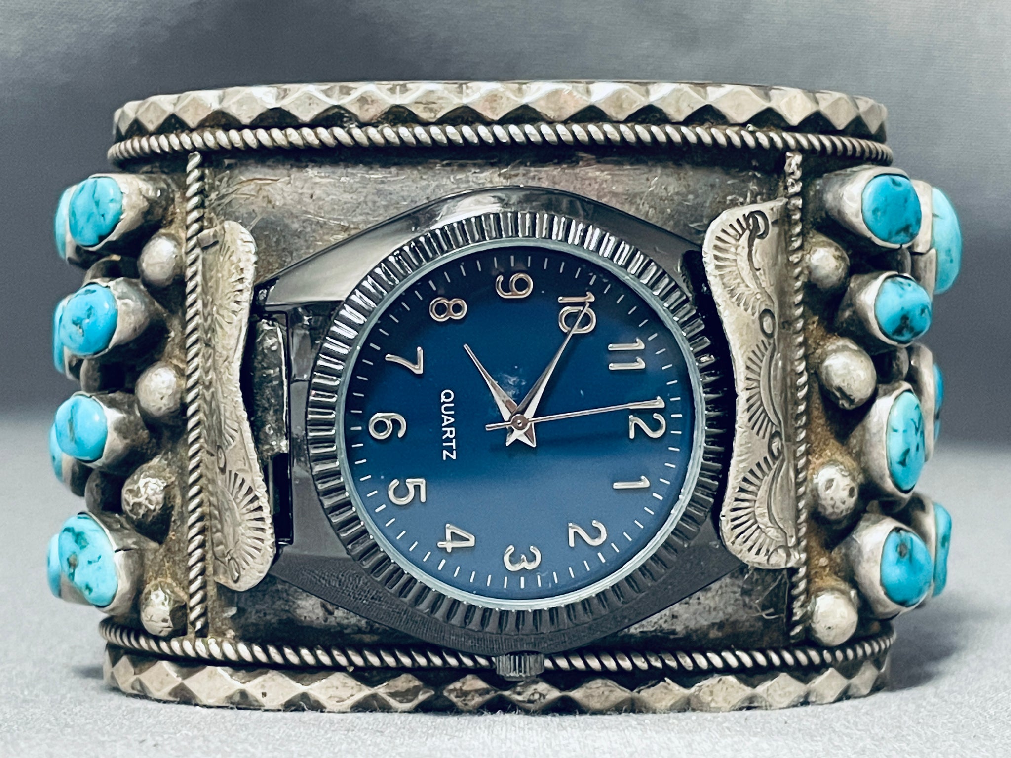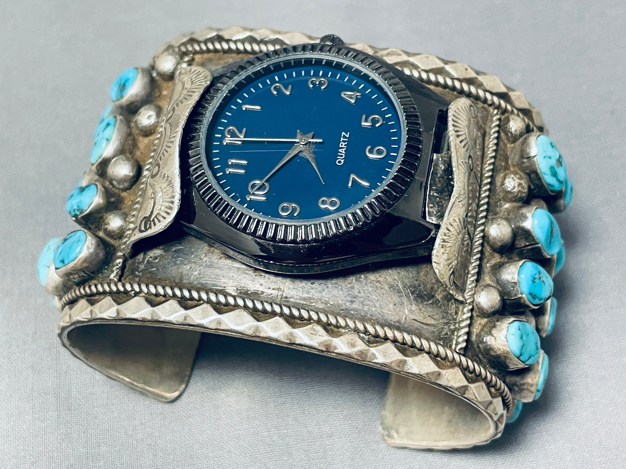 We are proud to offer this remarkable vintage Navajo silver watch bracelet having a quartz watch with handstamped silver flanks, silver beads, silver rope and 32 Morenci turquoise stones on the sides of the large handcarved solid silver cuff with handcarved silver borders! Truly Phenomenal! The largest stone measures around 3/8" x 1/4". The width of the bracelet measures around 2". Sterling silver. The inside end to end measures around 5-3/4" with an additional 1-3/8" gap. Sturdy 174 grams.