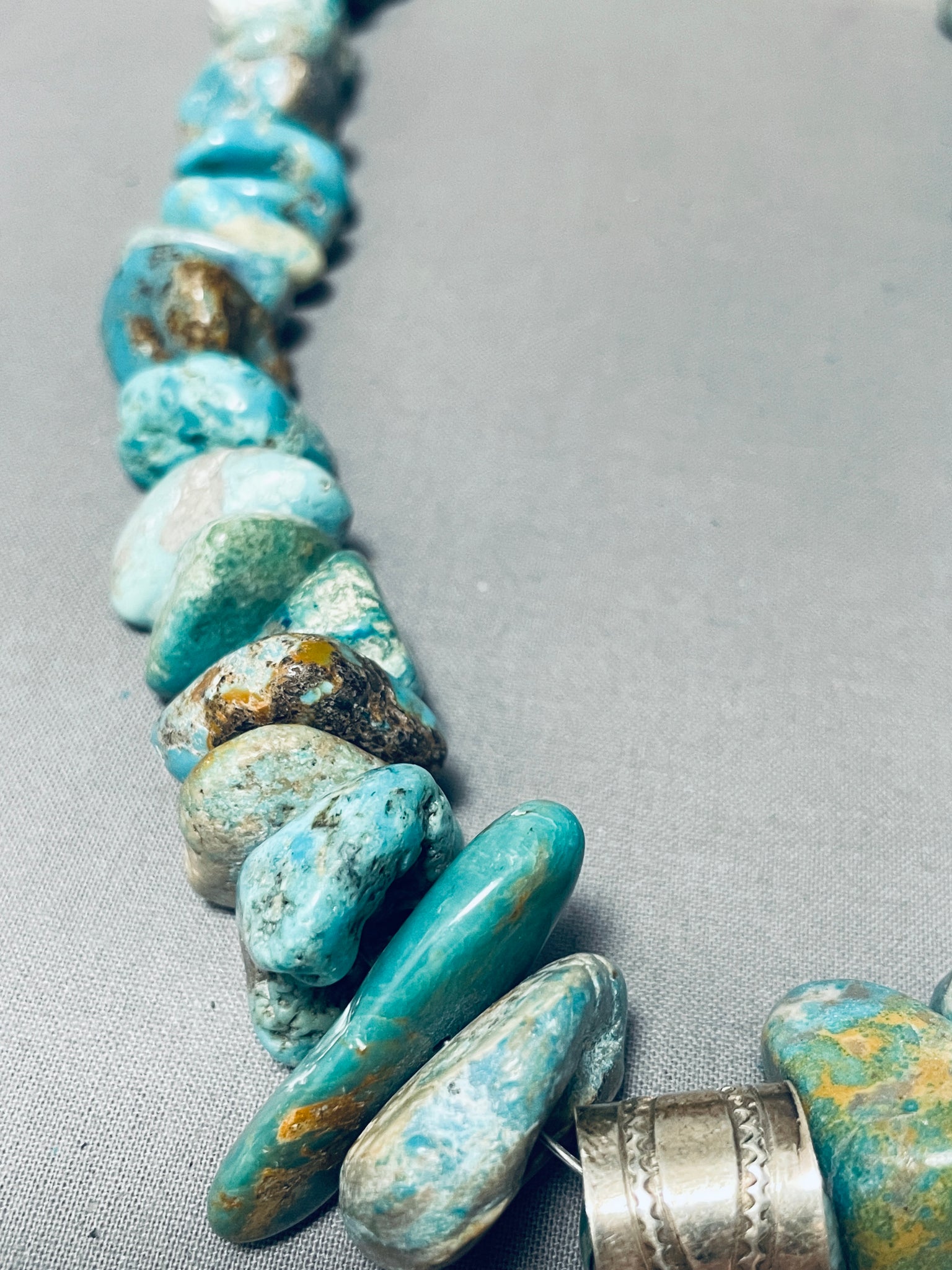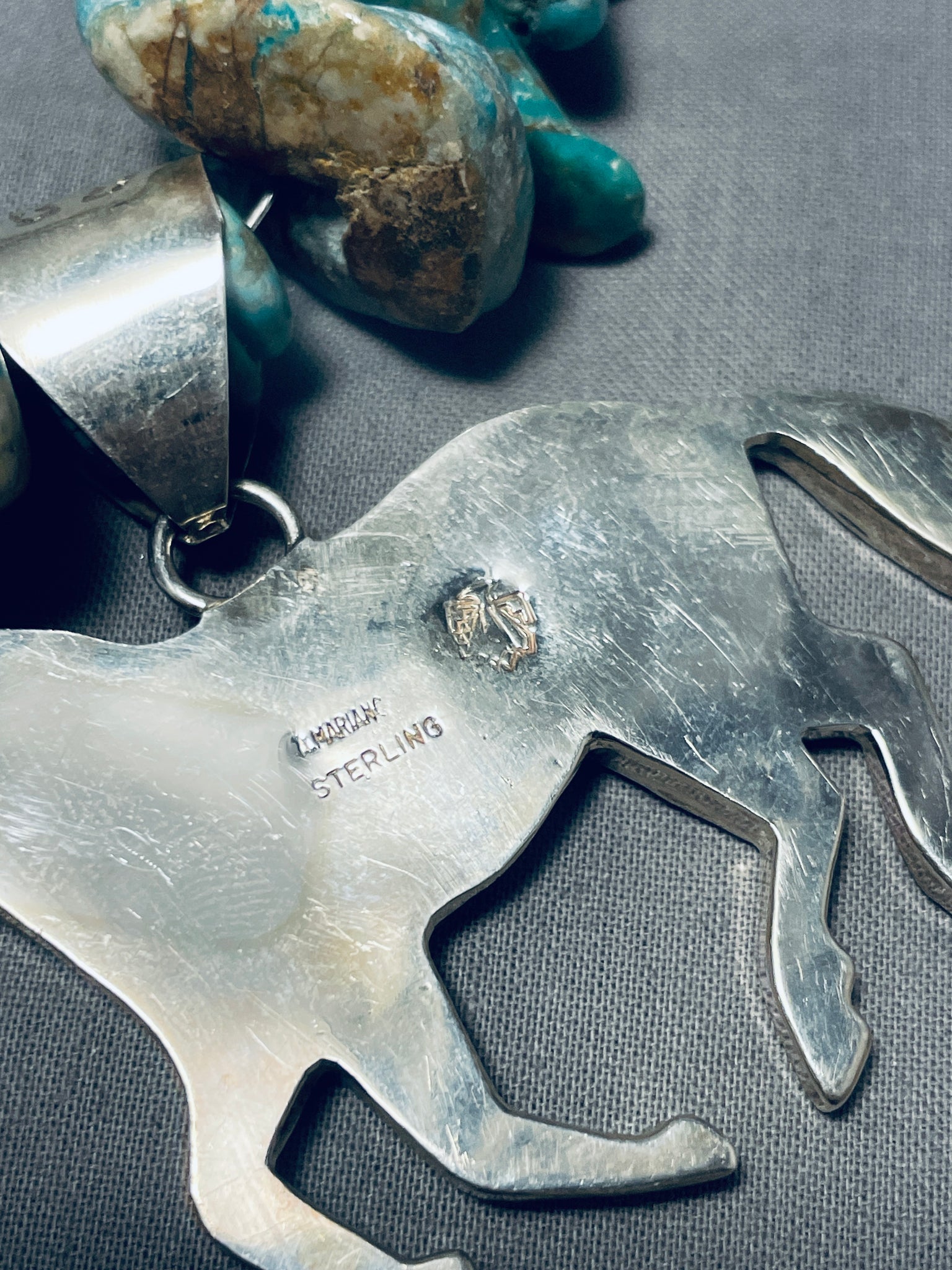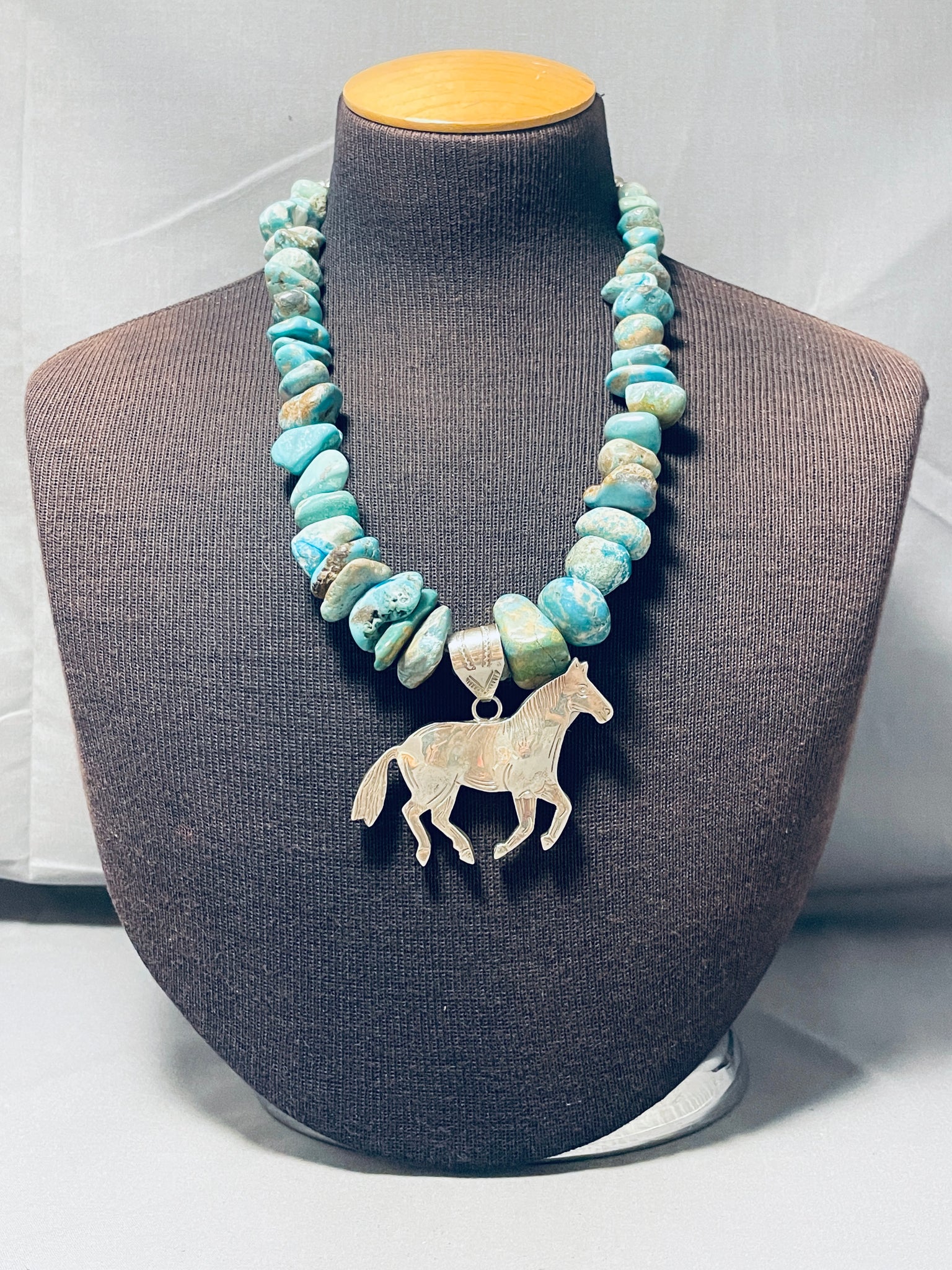 This is a breathtaking Navajo chunky turquoise silver pendant necklace. This outstanding necklace contains a bottom handmade large detailed silver galluping horse pendnat that measures around 3" X 2-1/4" including the very large stamped silver bail. The horse contains incredible silver stamp works giving the horse such a realistic look. The rest of the necklace is comprised of very large chunky graduating Royston turquoise nuggets with the largest measuring around 1-1/4" X 1/2", WOW! Located near the ends of the necklace are stunning round silver beads with a traditional silver clasp. Such a remarkable and beautiful necklace with so much character. Sterling silver, marked. Signed by Navajo artist, Alonzo Mariano. The length of the necklace measures around 24". Sturdy 176 grams.