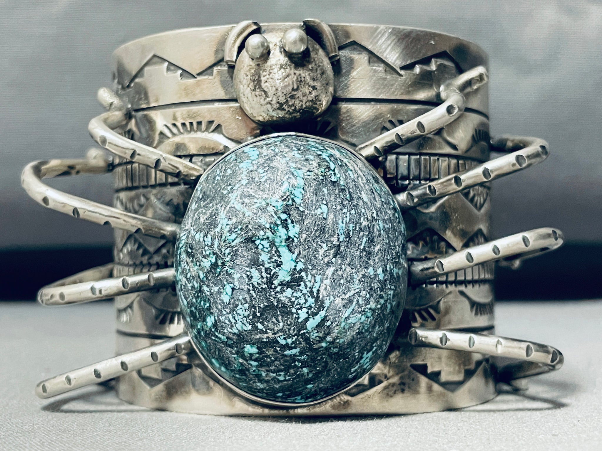 This is a magnificent Navajo large single stone silver spider cuff bracelet. This phenomenal bracelet contains a large detailed 3D silver spider. This fascinating spider measures a whopping 2-1/8" X 2-3/4". Located on the back of the spider is a beautiful blue turquoise stone. The detailing of the spider is just amazing. Running down both ends of the thick and wide silver cuff bracelet are impeccable stamp works that consist of teepee patterns, sun works, line segments and channel patterns. I absolutely love the detailing of this beautiful bracelet. The center stone measures around 1-1/2" x 1-3/8". The width of the bracelet measures around 2-1/8". Sterling silver. The inside end to end measures around 5-3/4" with an additional 1" gap. Sturdy 181 grams.