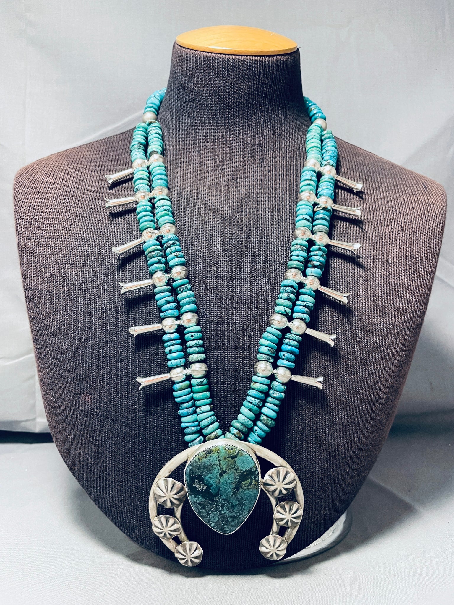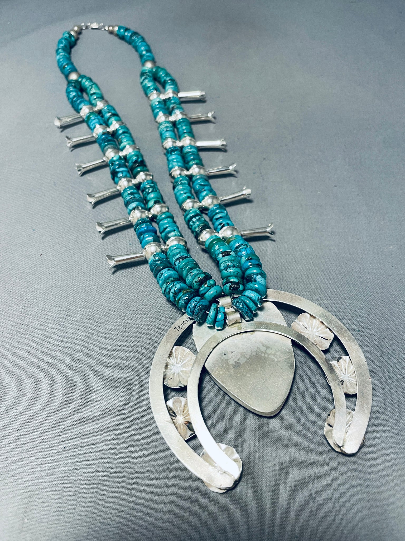 190+ Gram Native American Navajo Pilot Mountain Turquoise Sterling Silver Squashblossom Necklace