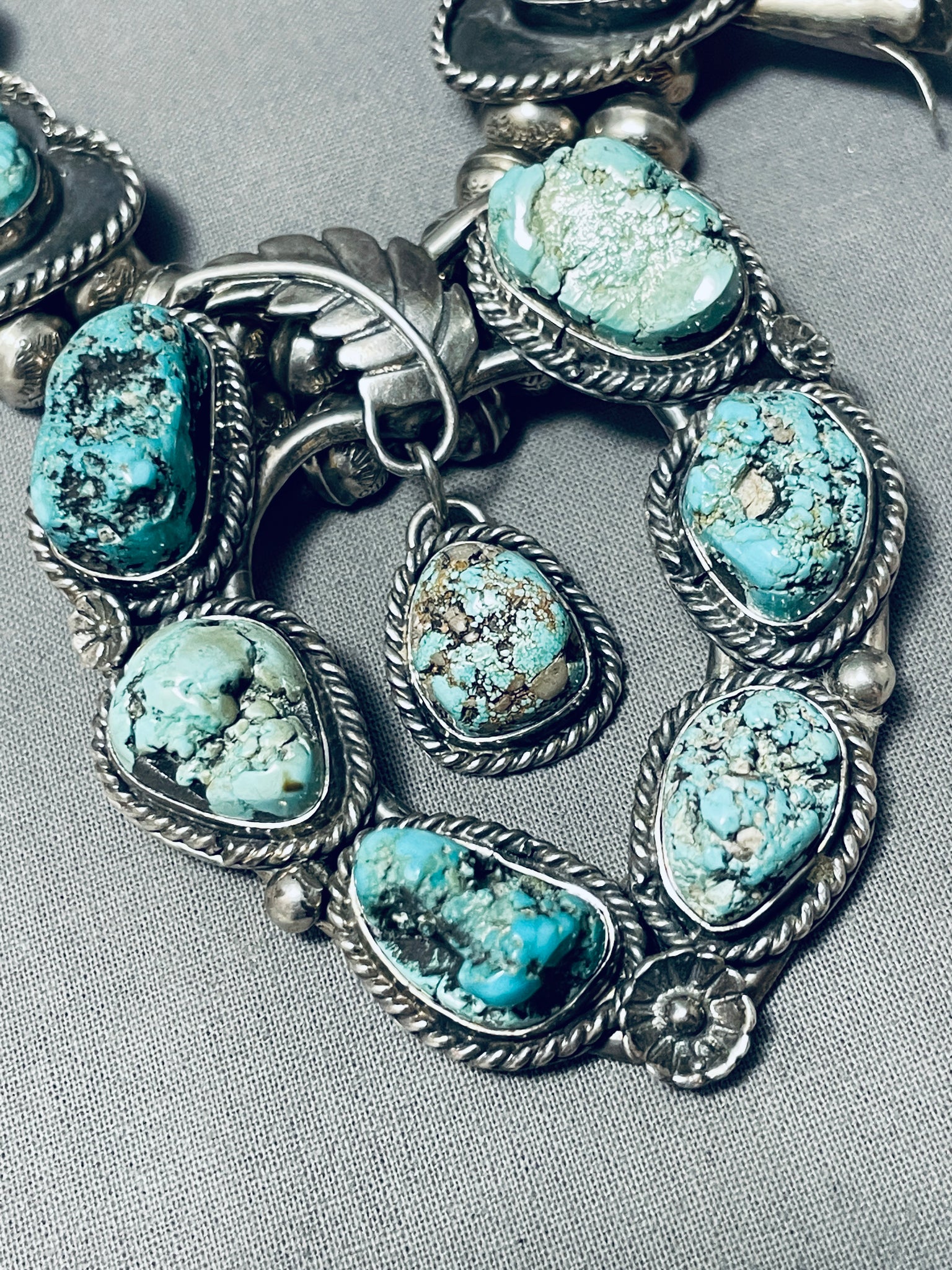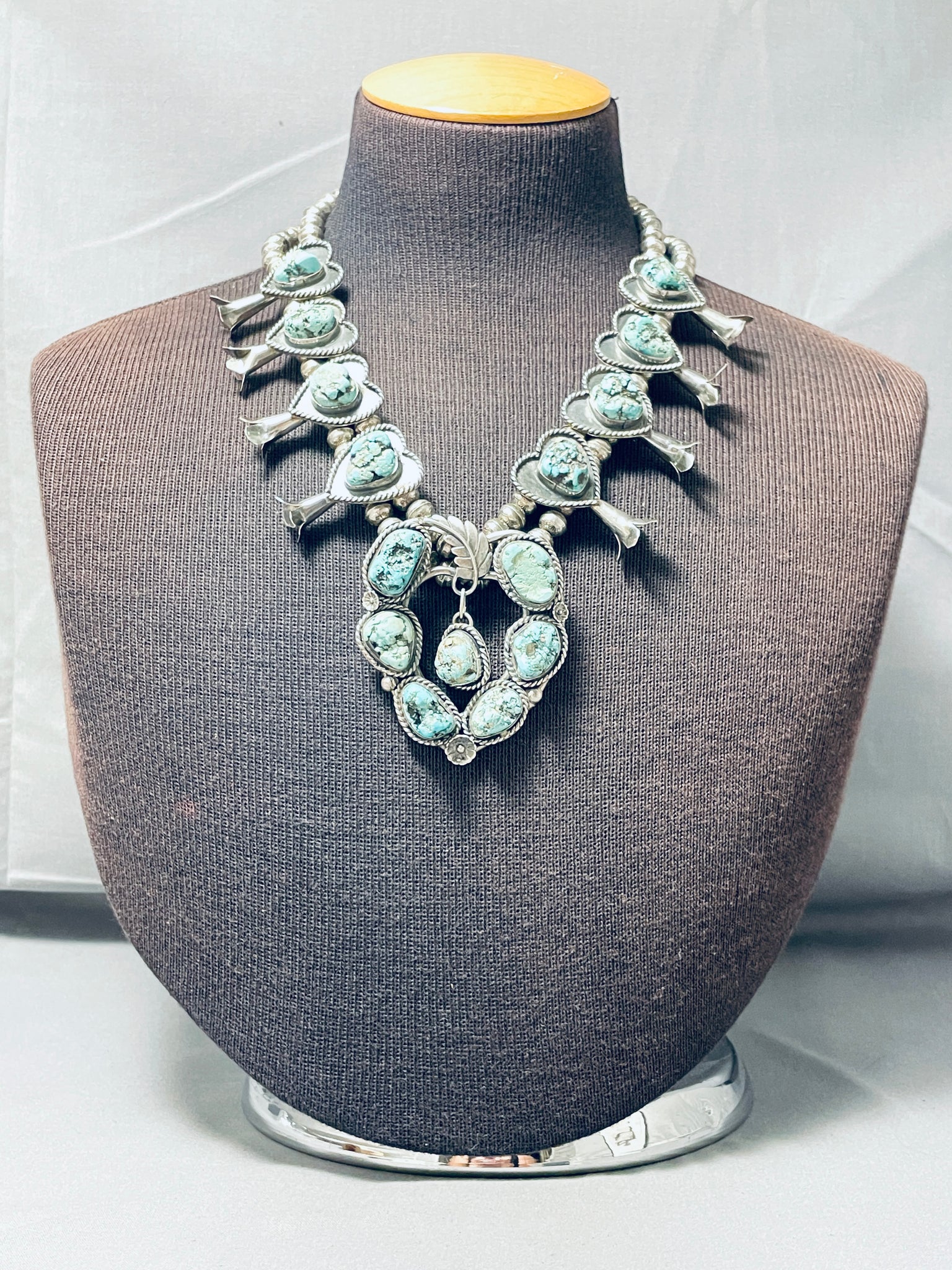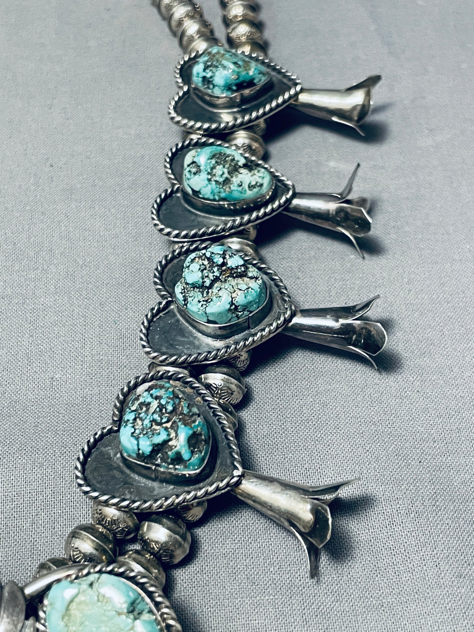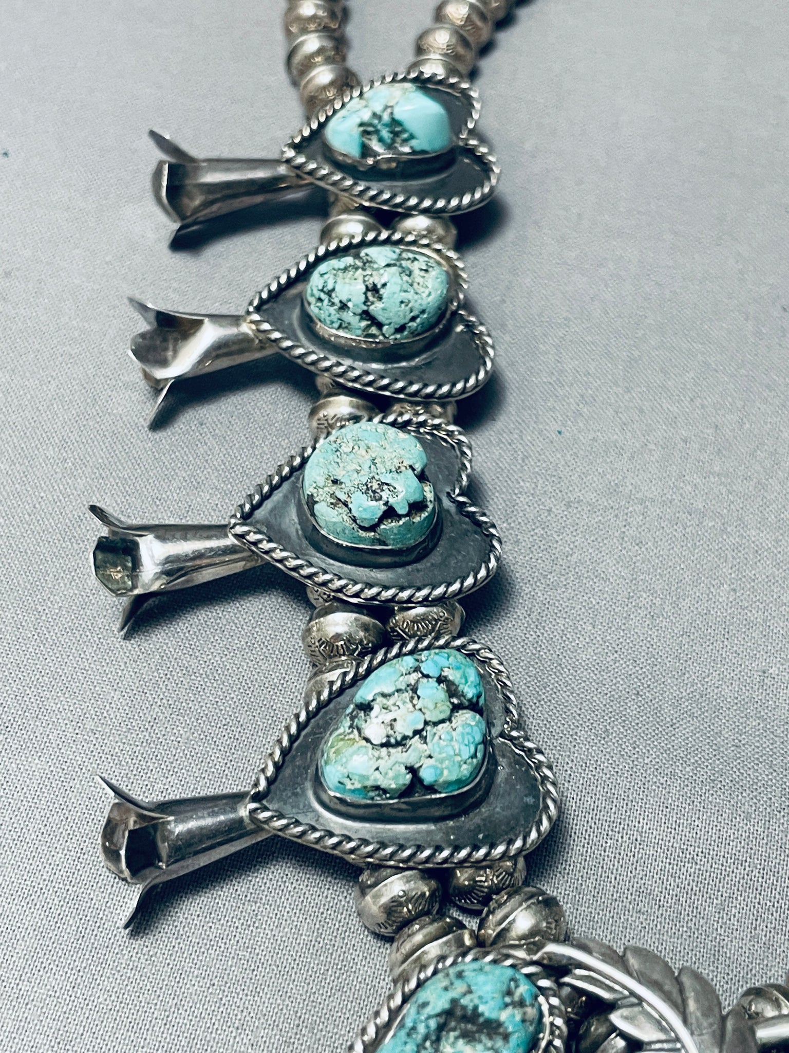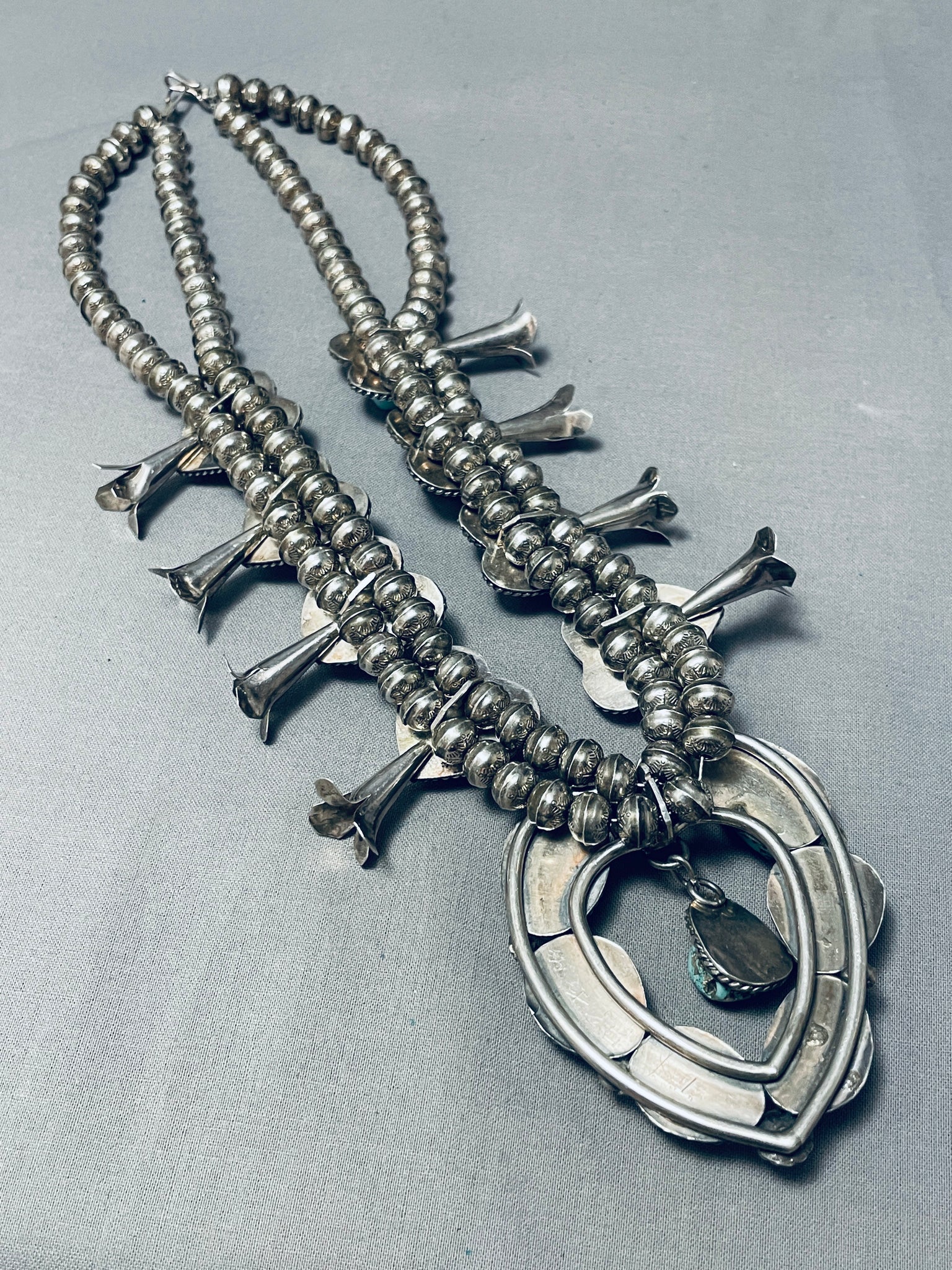 191 Gram Vintage Native American Navajo Turquoise Sterling Silver Squash Blossom Necklace