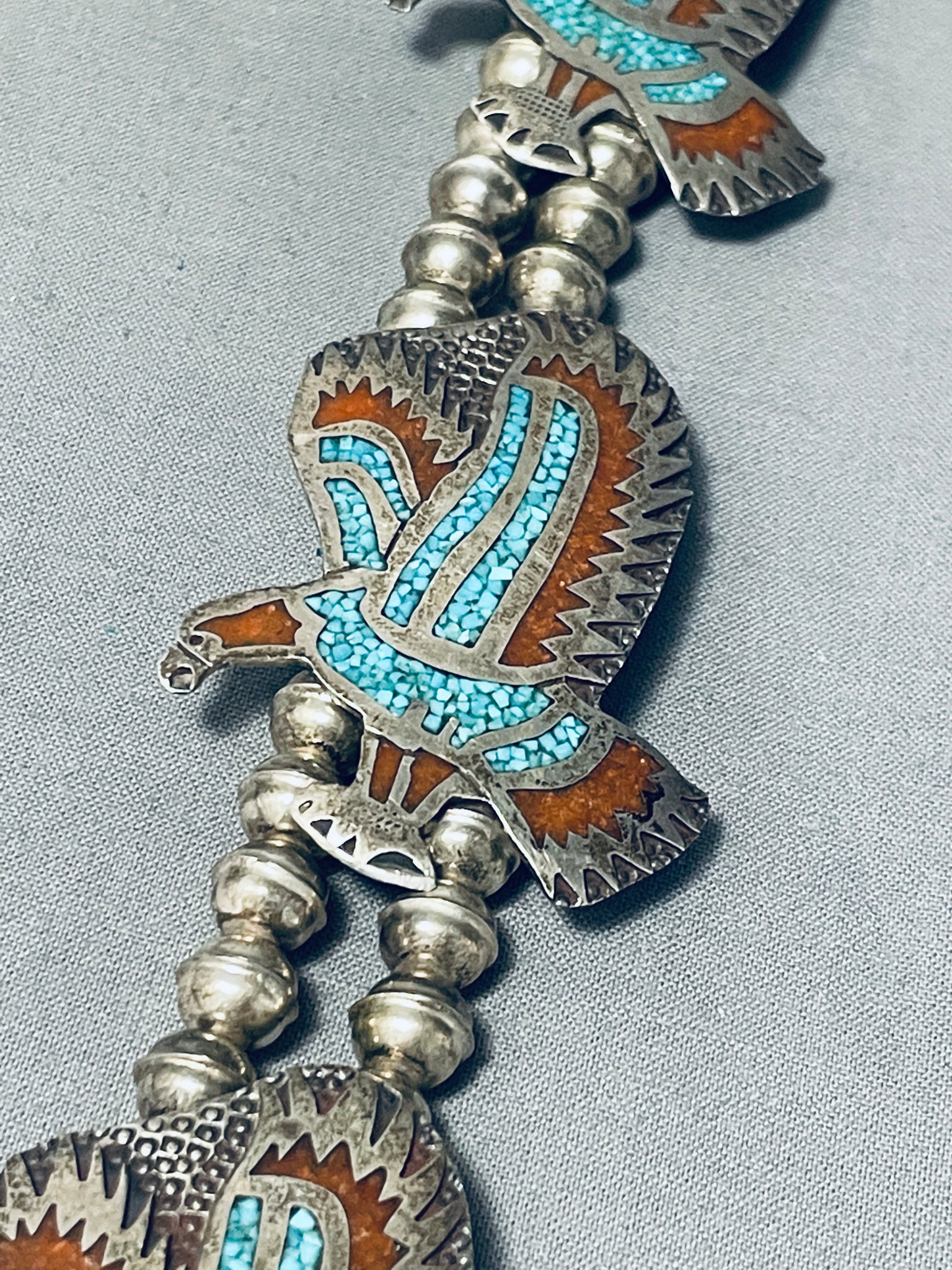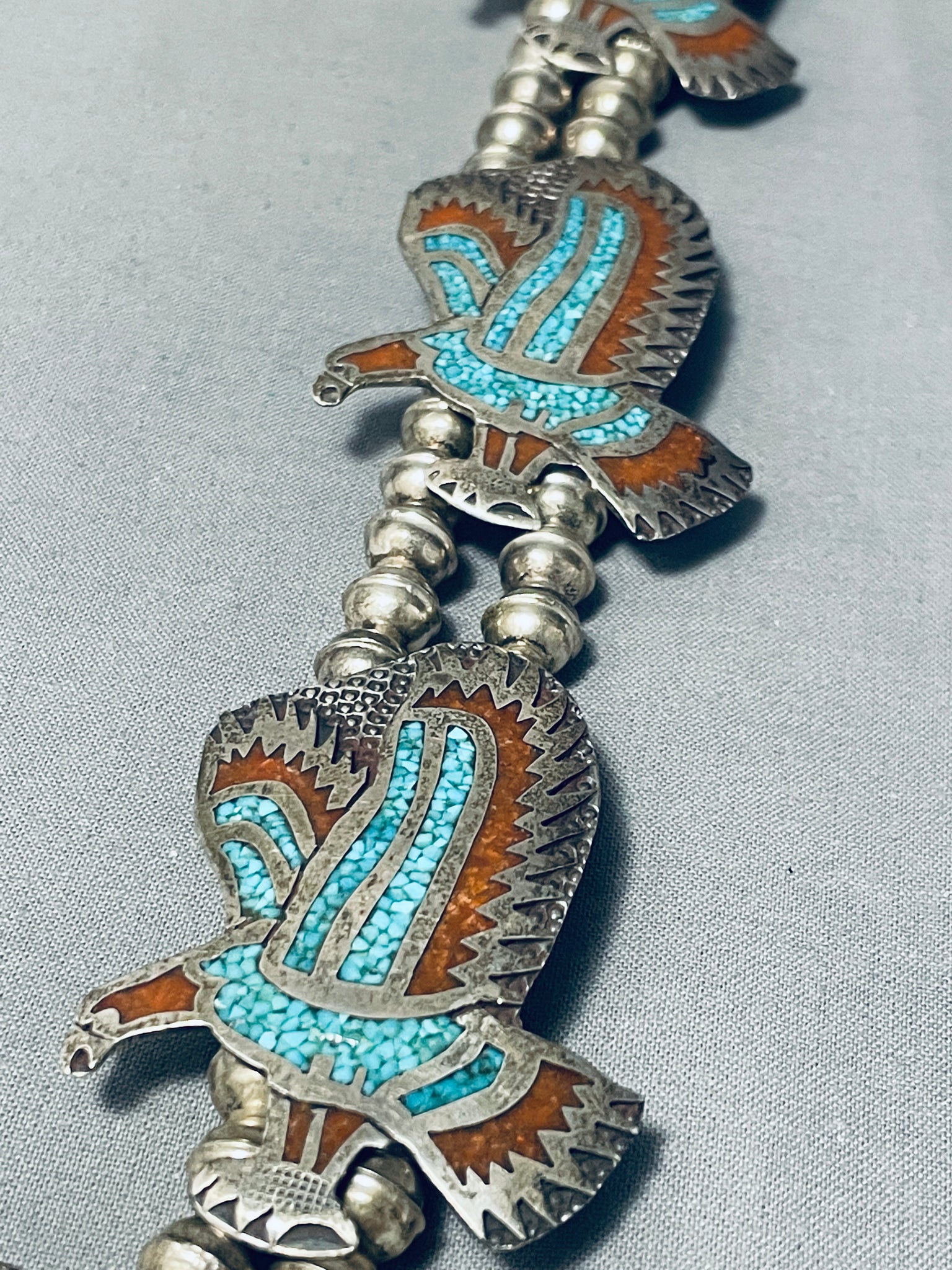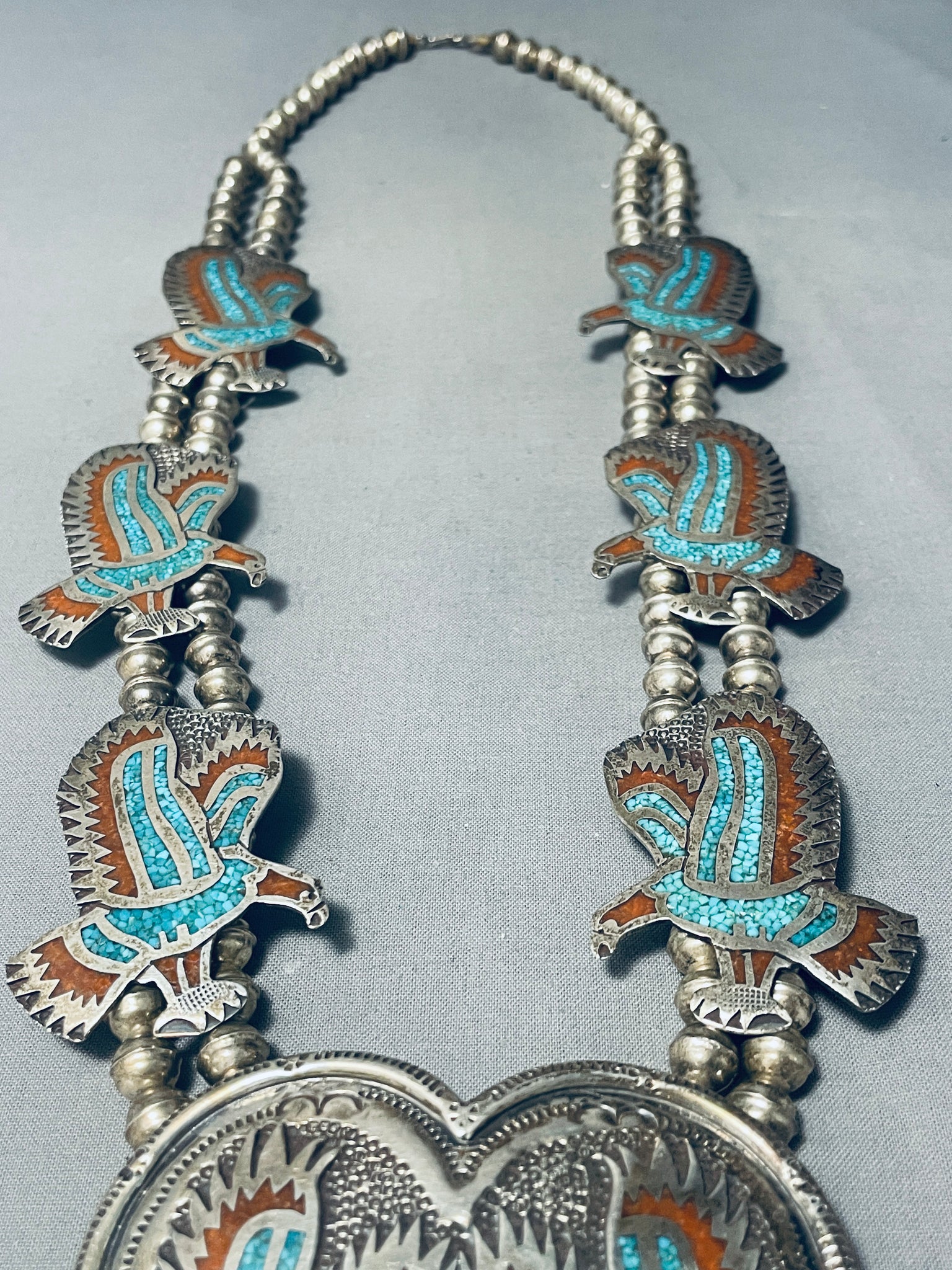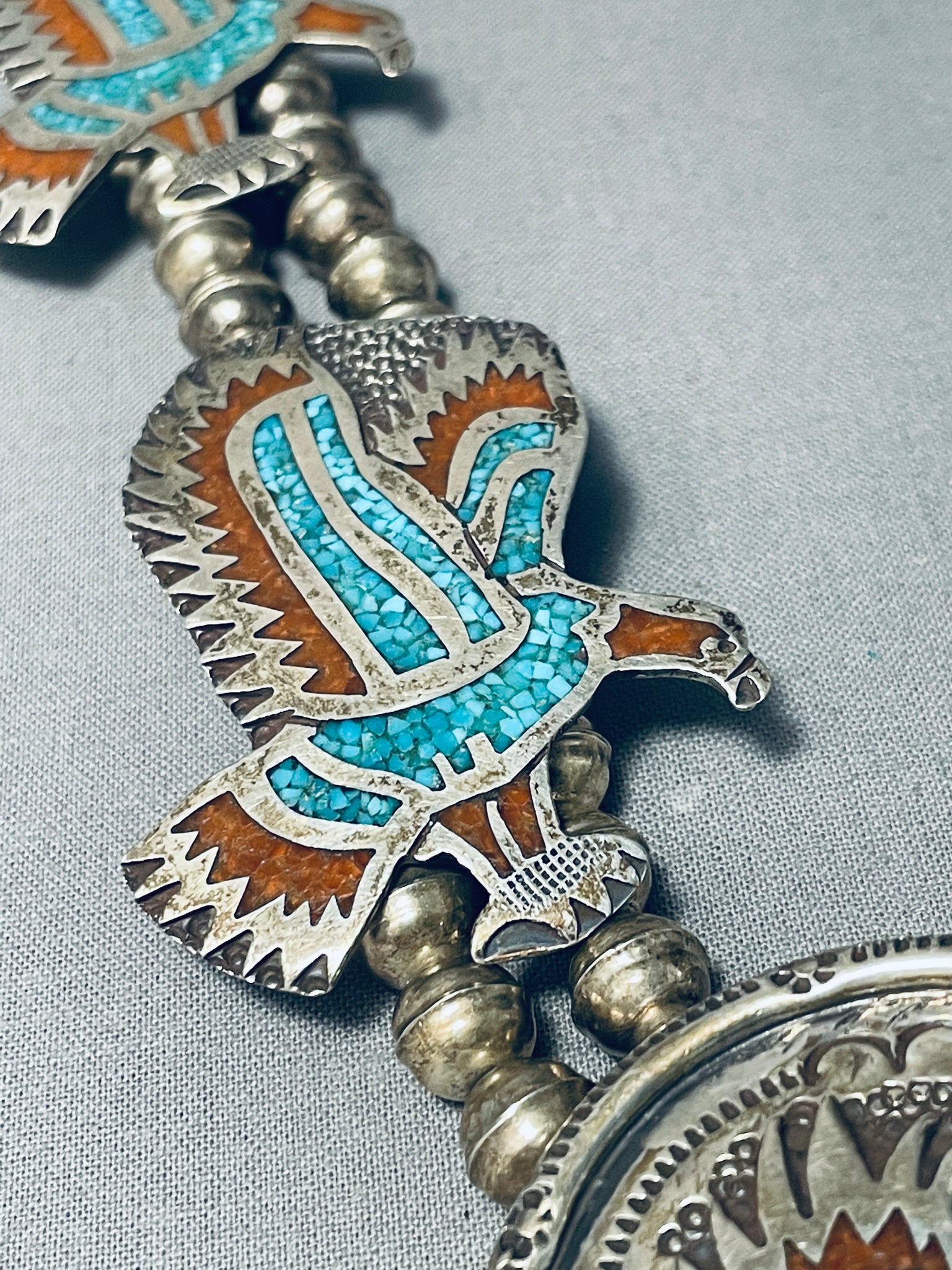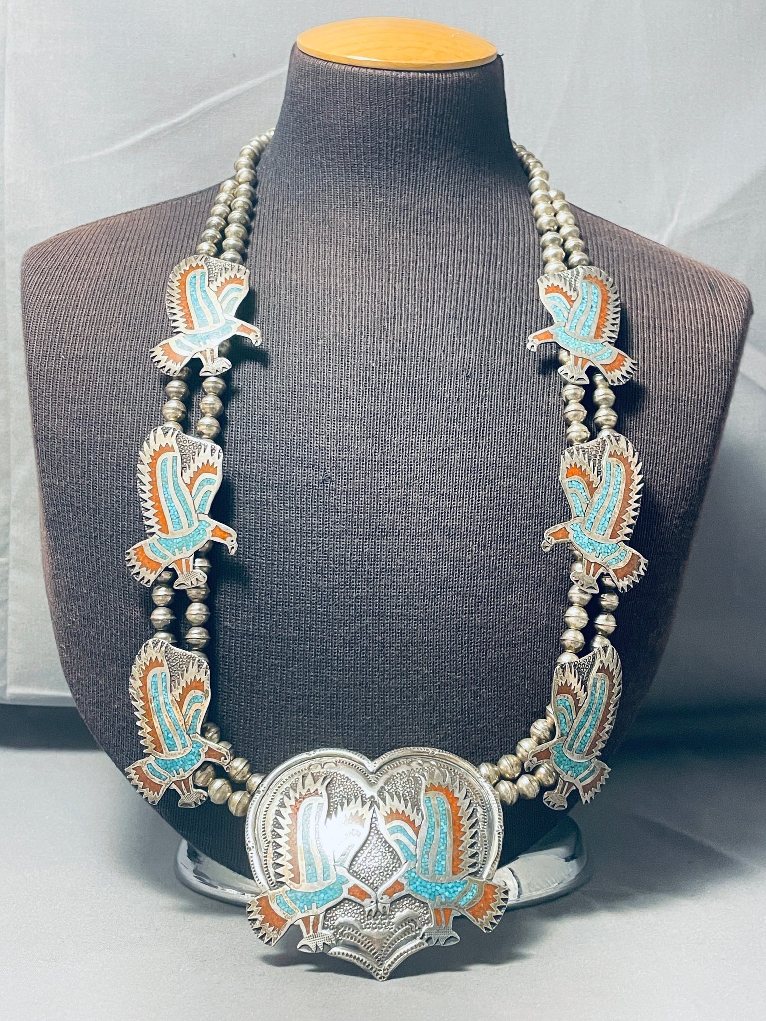 This is a museum quality vintage Navajo large inlaid silver eagle squash blossom necklace. This incredible necklace contains 6 outstanding large inlaid silver eagle pendants that each measure around 2-1/4" X 1-3/4". The bottom inlaid double eagle silver naja pendant measures a whopping 3-1/4" X 3". The inlay includes beautiful chip inlaid turquoise and coral stones. Situated throughout the stones are phenomenal silver dotted works, sun stampings, cloud patterns and criss cross patterns. Resting throughout the majority of the necklace are fascinating large handmade round silver beads with old natural patina and a traditional silver clasp. This necklace is just so phenomenal. Sterling silver. Cir. 1970's+. Signed by Navajo artist, famous Will Singer. The length of the necklace measures around 33". Sturdy 199 grams.