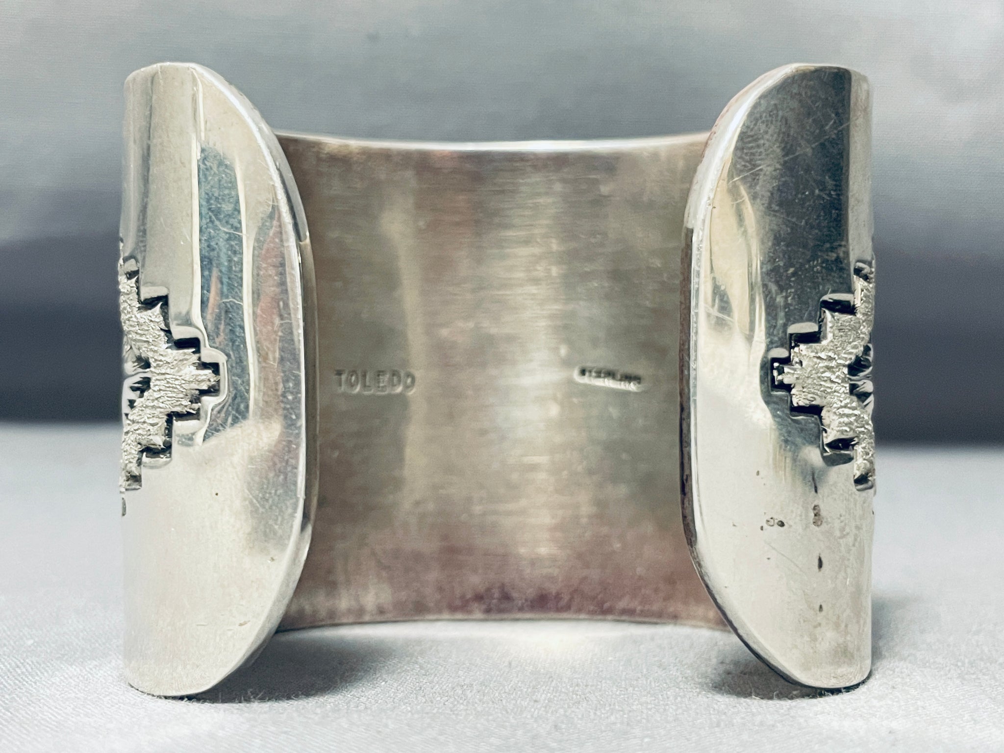 This is a tremendous Navajo all silver very thick and wide silver cuff bracelet. This impeccable bracelet contains a mind blowing rug pattern that runs from one end to the other with wonderful pueblo patterns. I absolutely love how thick and sturdy this bracelet is with amazing different textures. The width of the bracelet measures around 2". Signed by Navajo artist, Herb Toledo. Sterling silver, marked. Cir. 1970's+. The inside end to end measures around 5-3/4" with an additional 1" gap. Sturdy 192 grams.