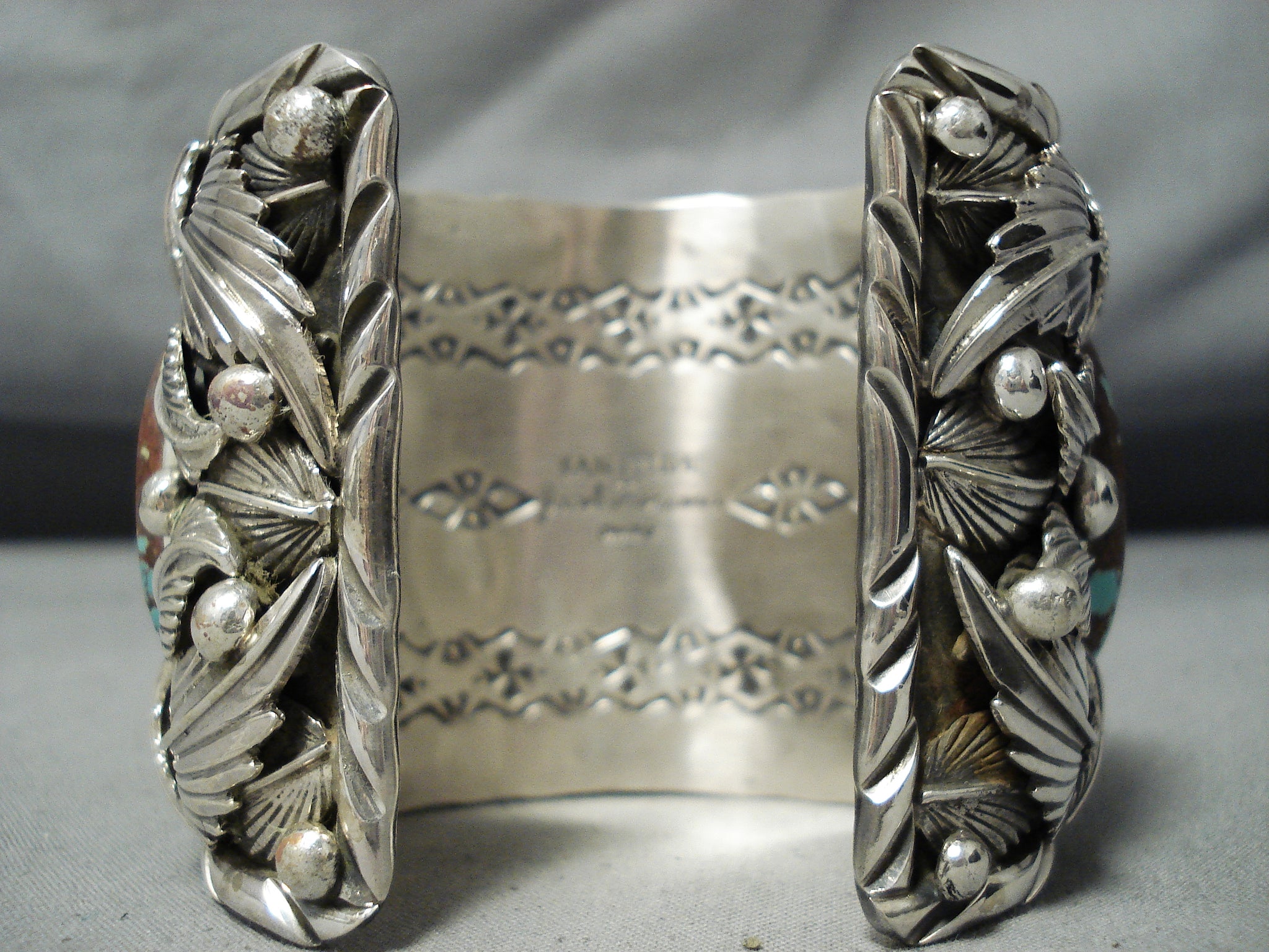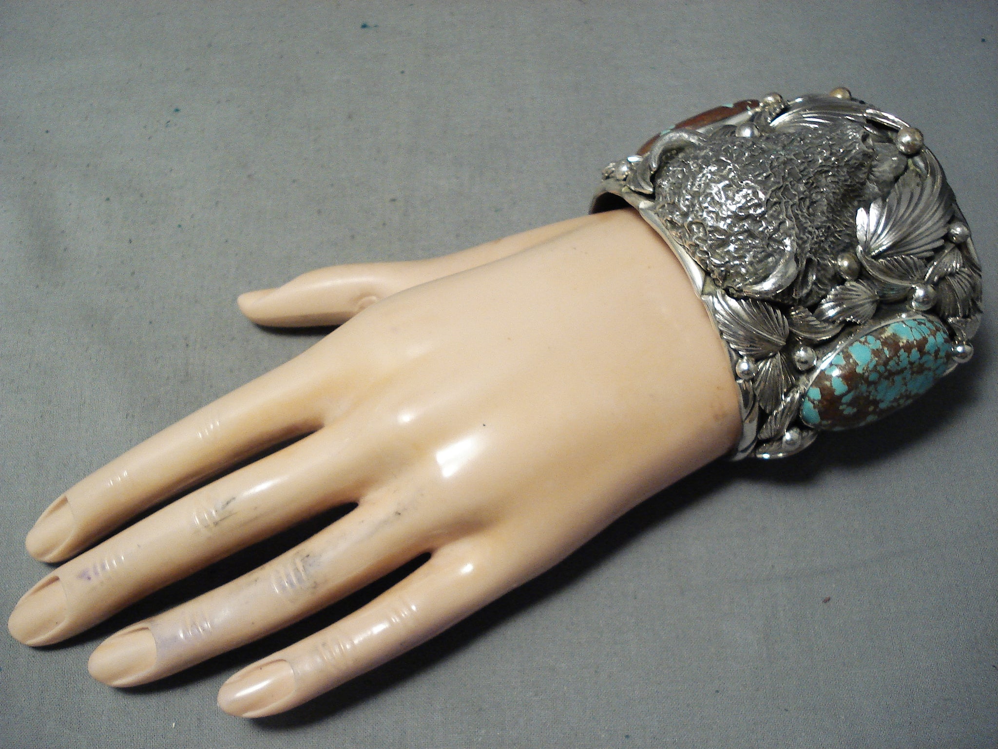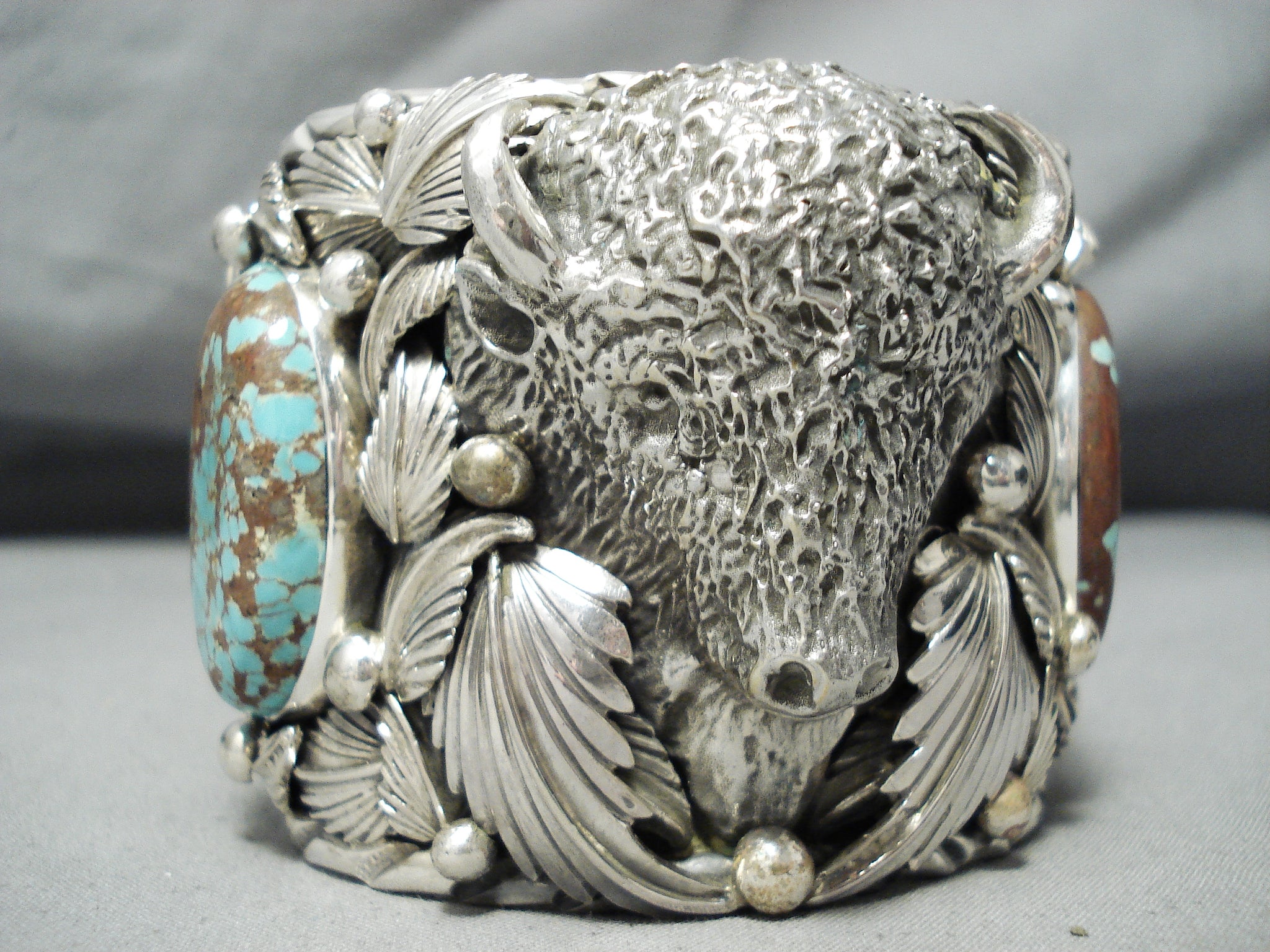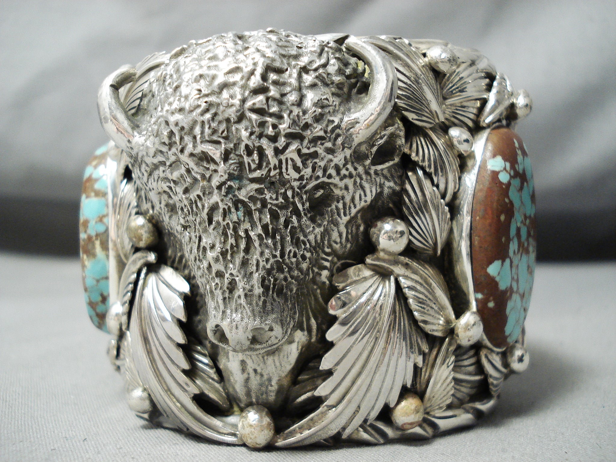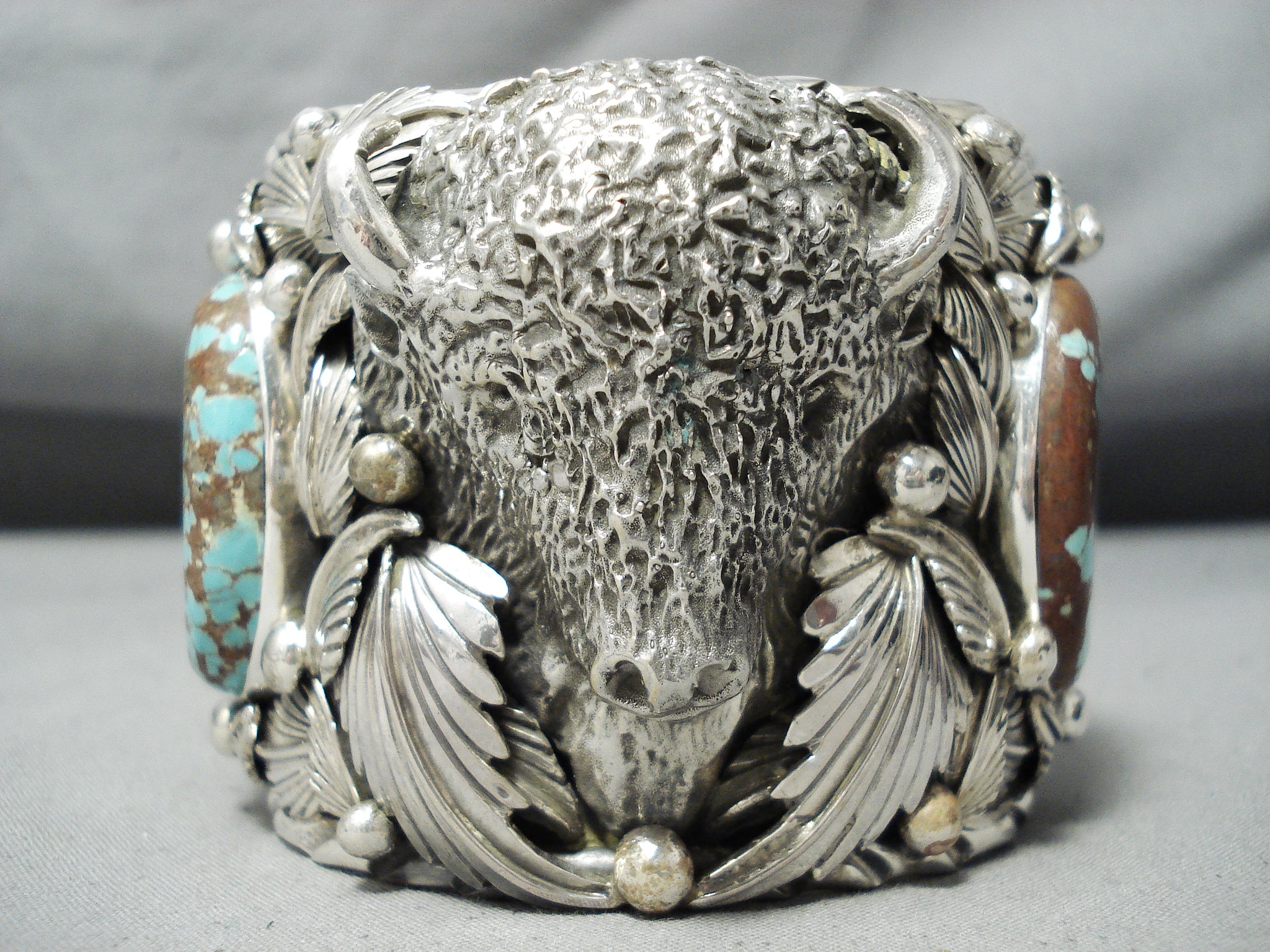 230 Grams Huge Native American Buffalo #8 Turquoise Sterling Silver Bracelet