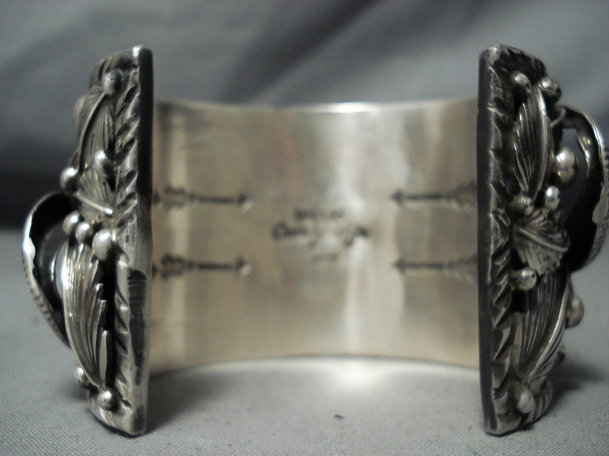 This is a giant Navajo silver bracelet. Slithering among a sea of silver leaves and berries, these 2 realistic geckos are guarding the treasure at the center – the huge magnificent #8 turquoise stone! The center stone measures around 1-1/2" x 1-1/8". The width of the bracelet measures around 2". Signed by Navajo artist, Curtis John. Sterling silver, marked. The inside end to end measures around 5-7/8" with an additional 1-5/8" gap. Sturdy 234 grams.
