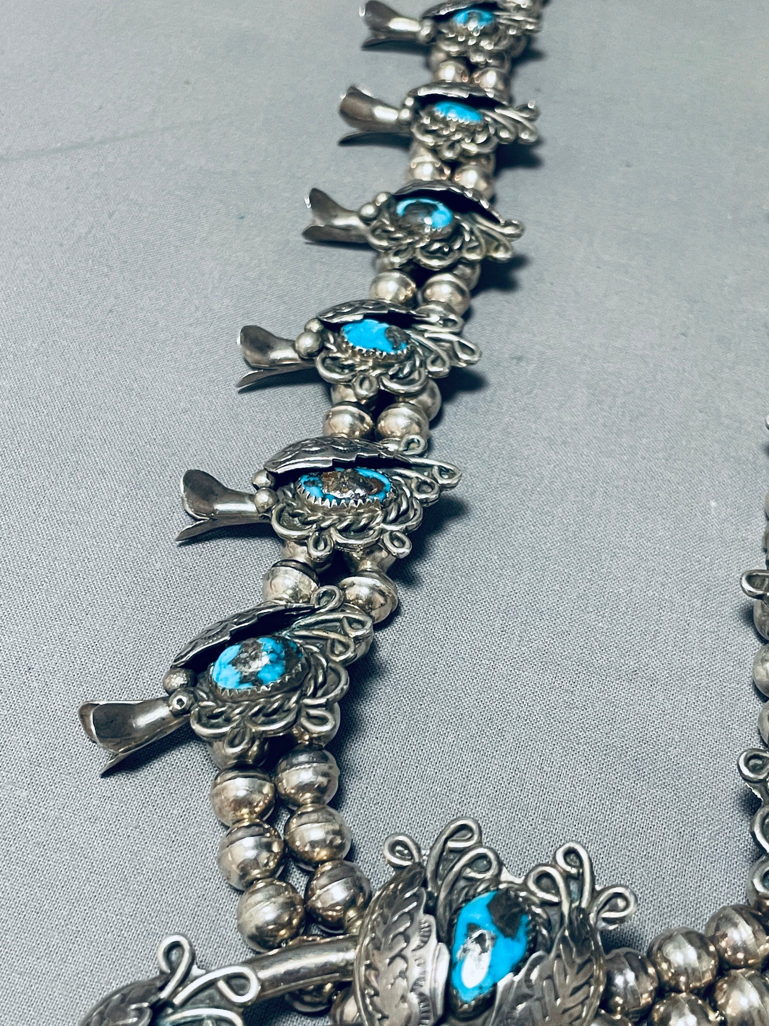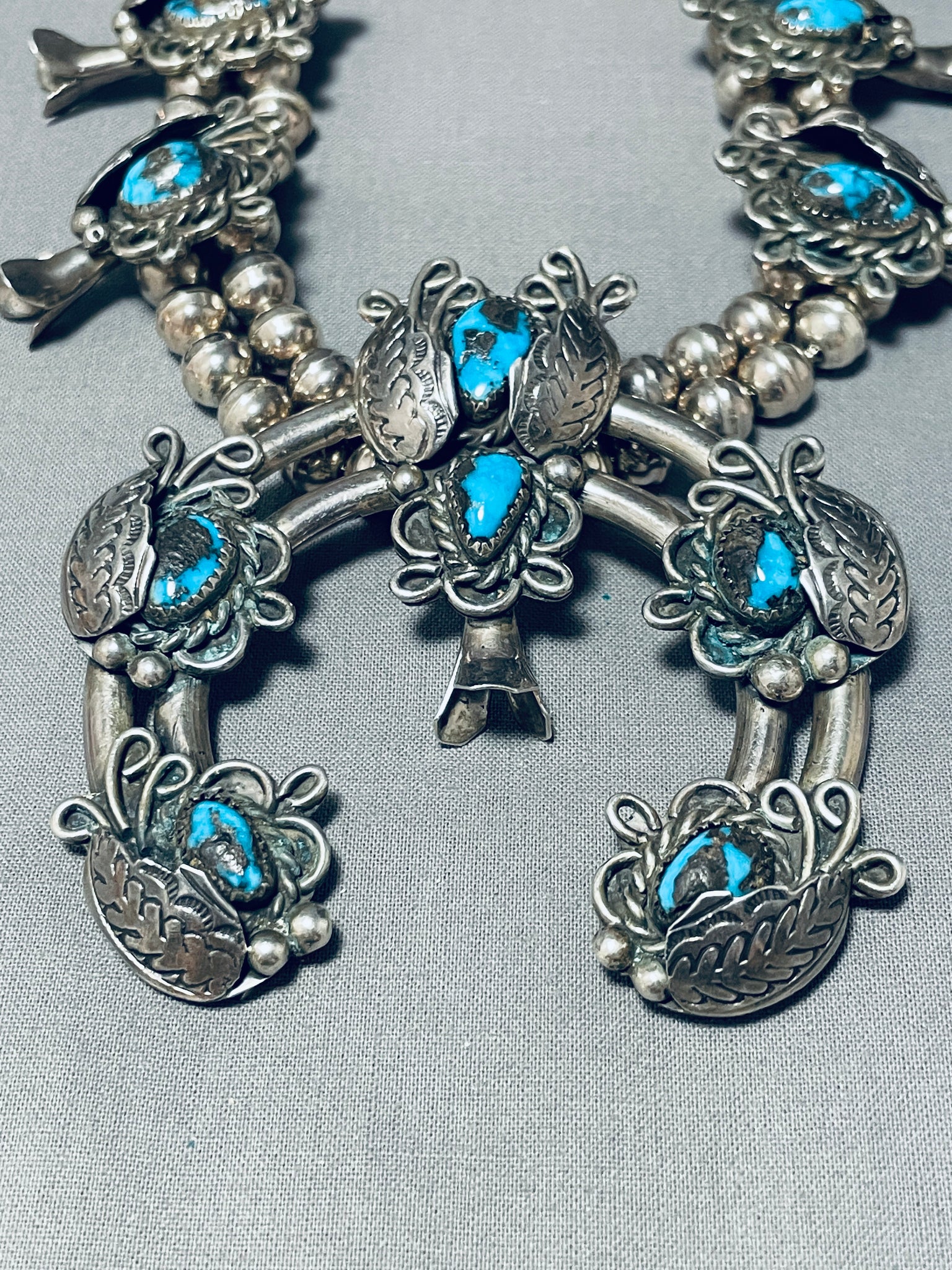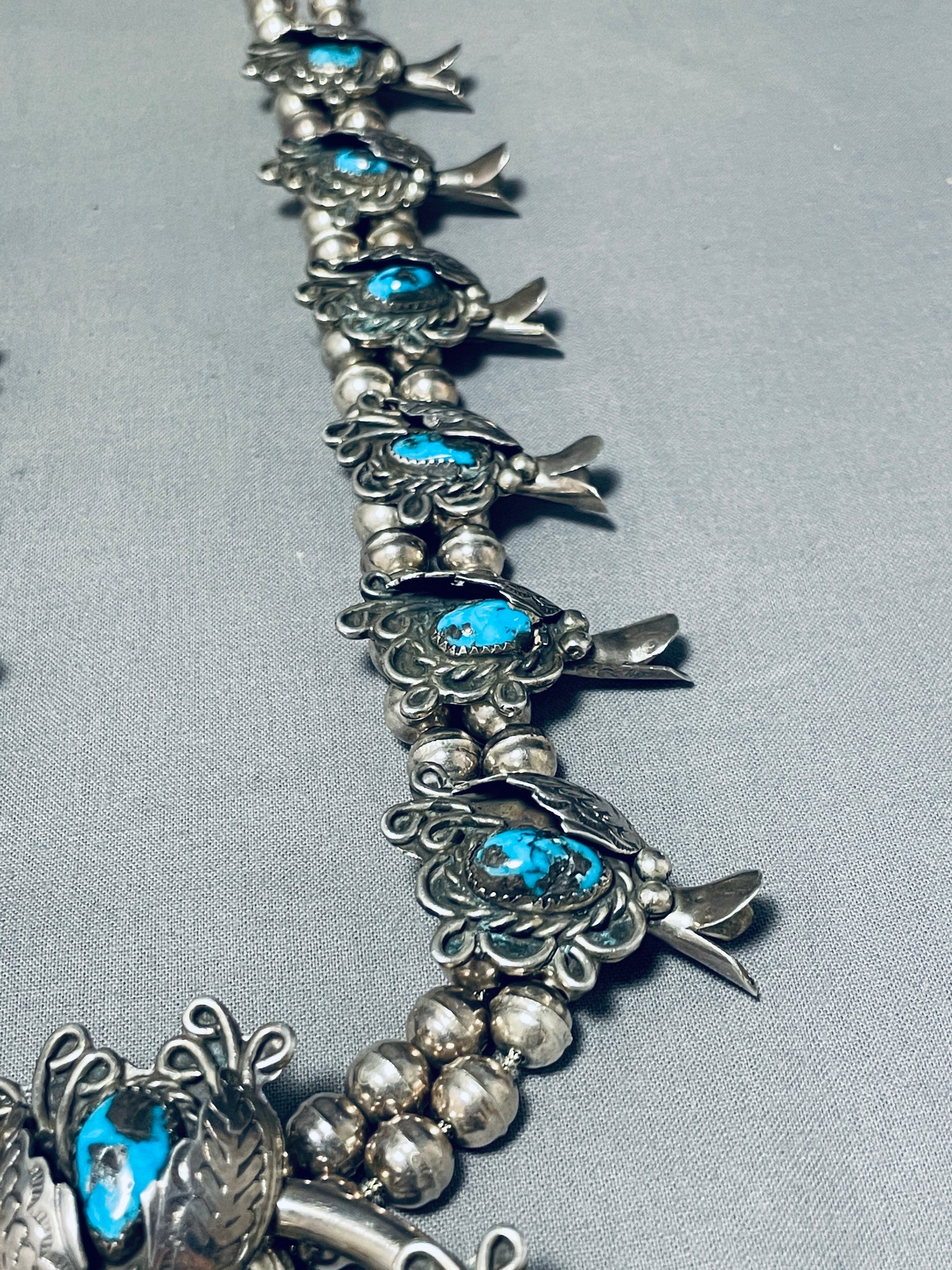 247 Gram Bisbee Turquoise Vintage Native American Navajo Sterling Silver Suqash Blossom Necklace