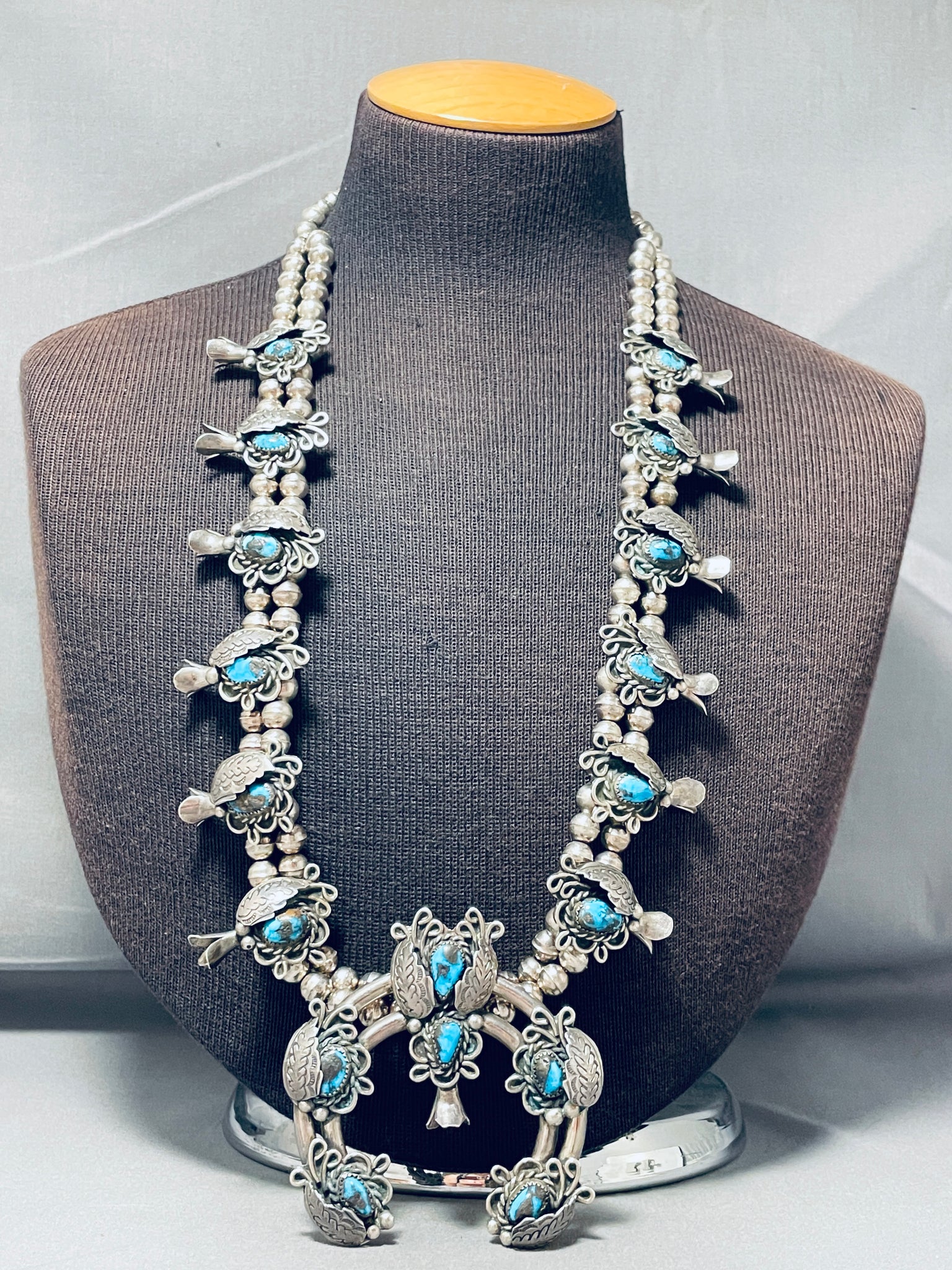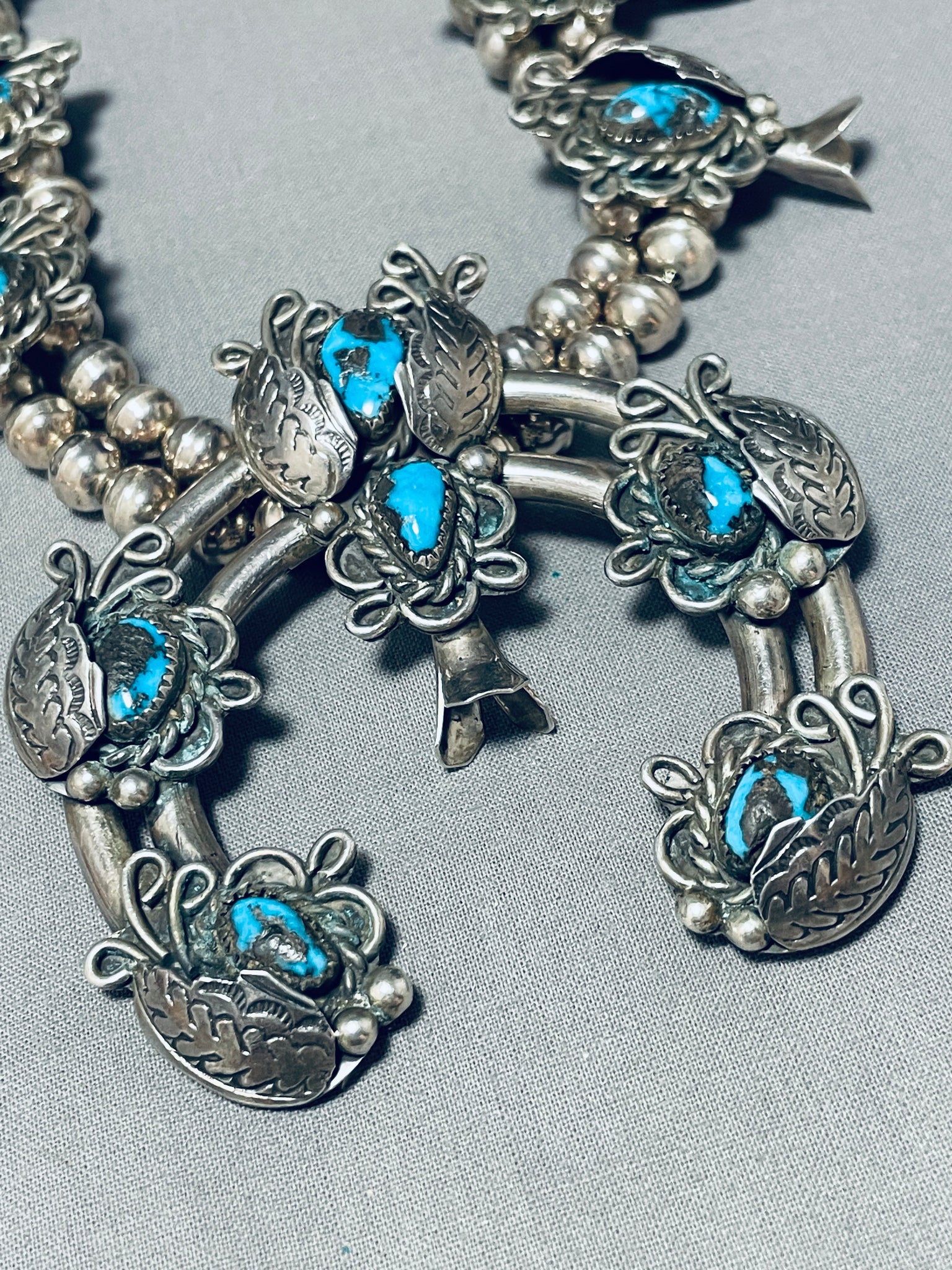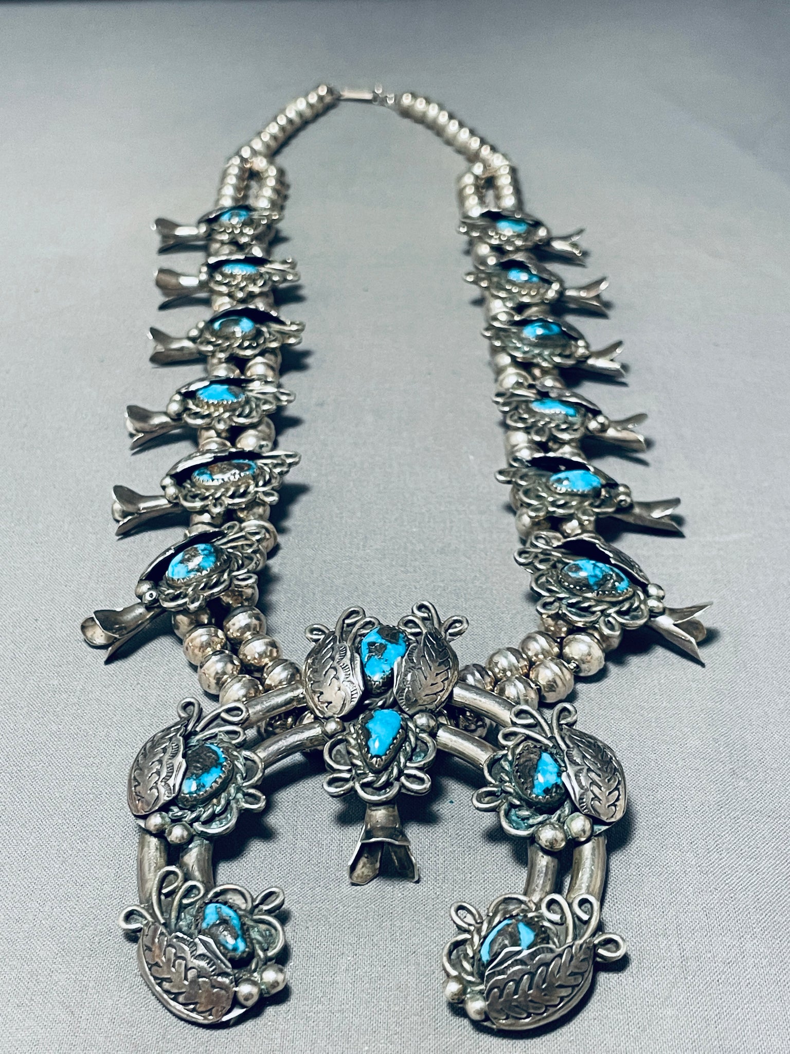 247 Gram Bisbee Turquoise Vintage Native American Navajo Sterling Silver Suqash Blossom Necklace