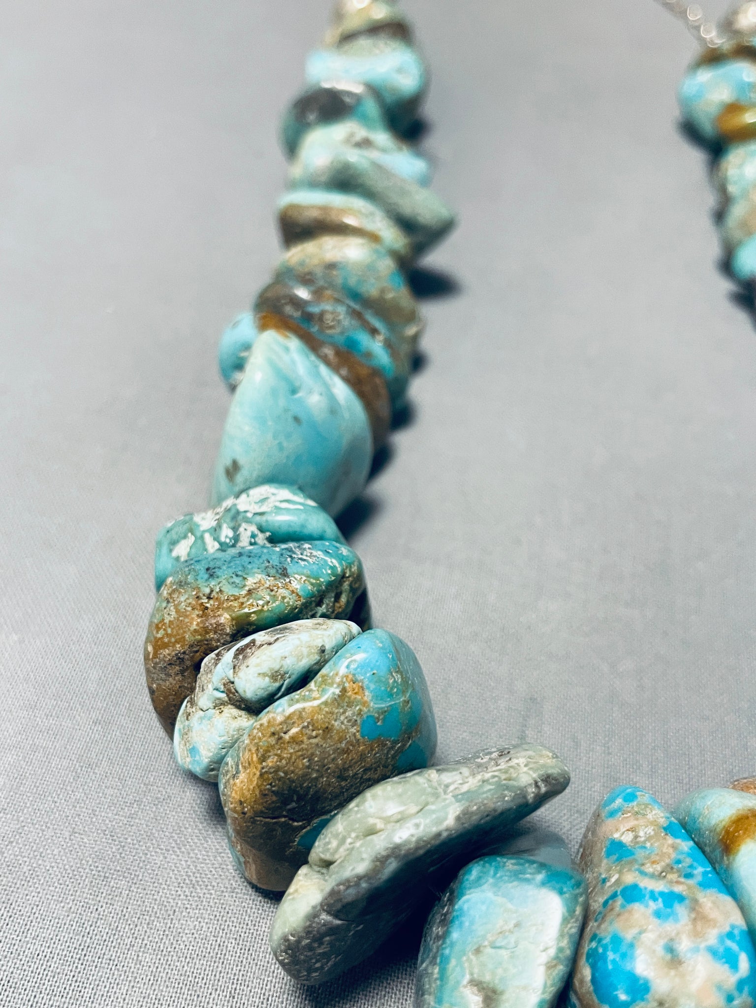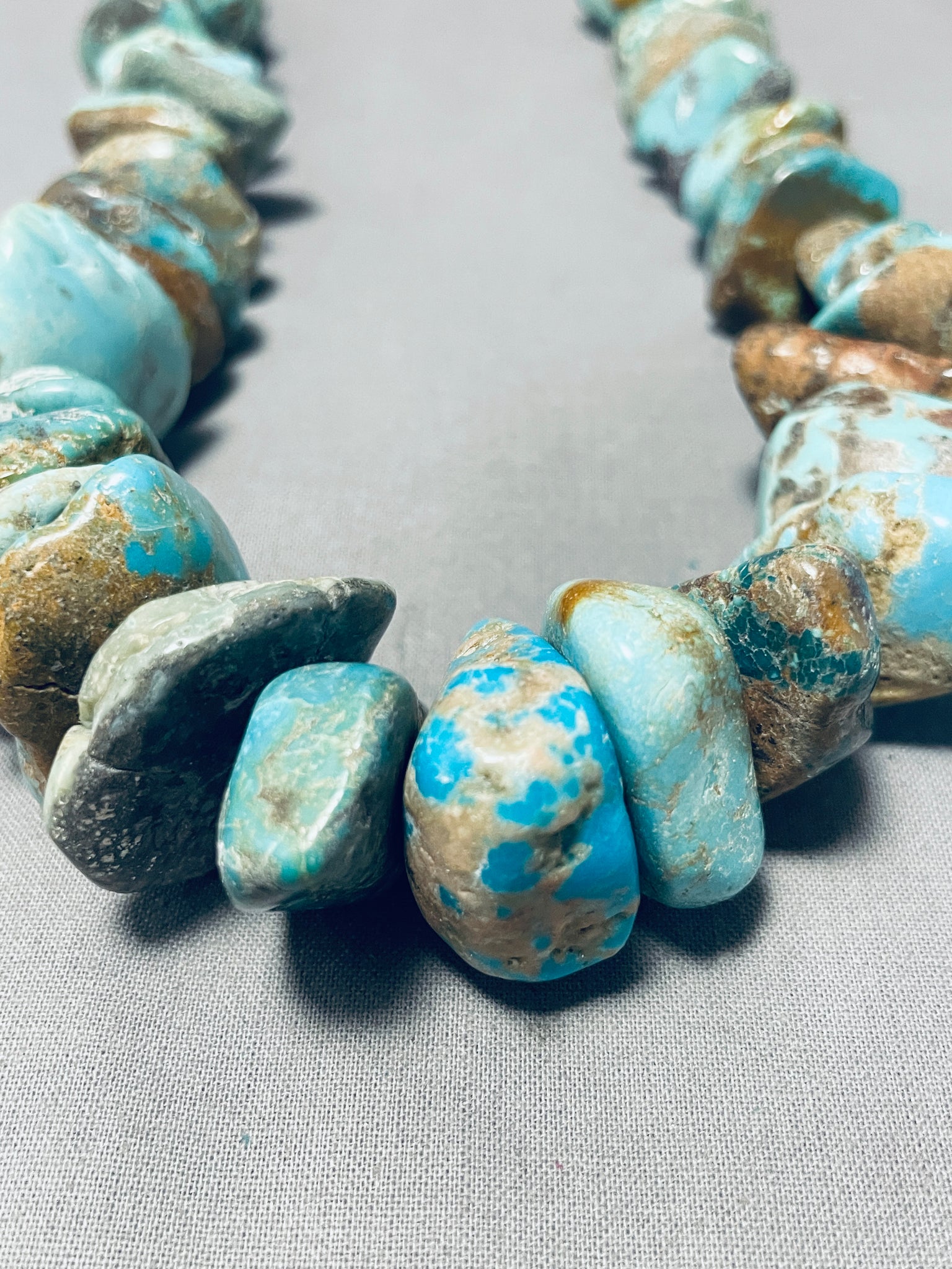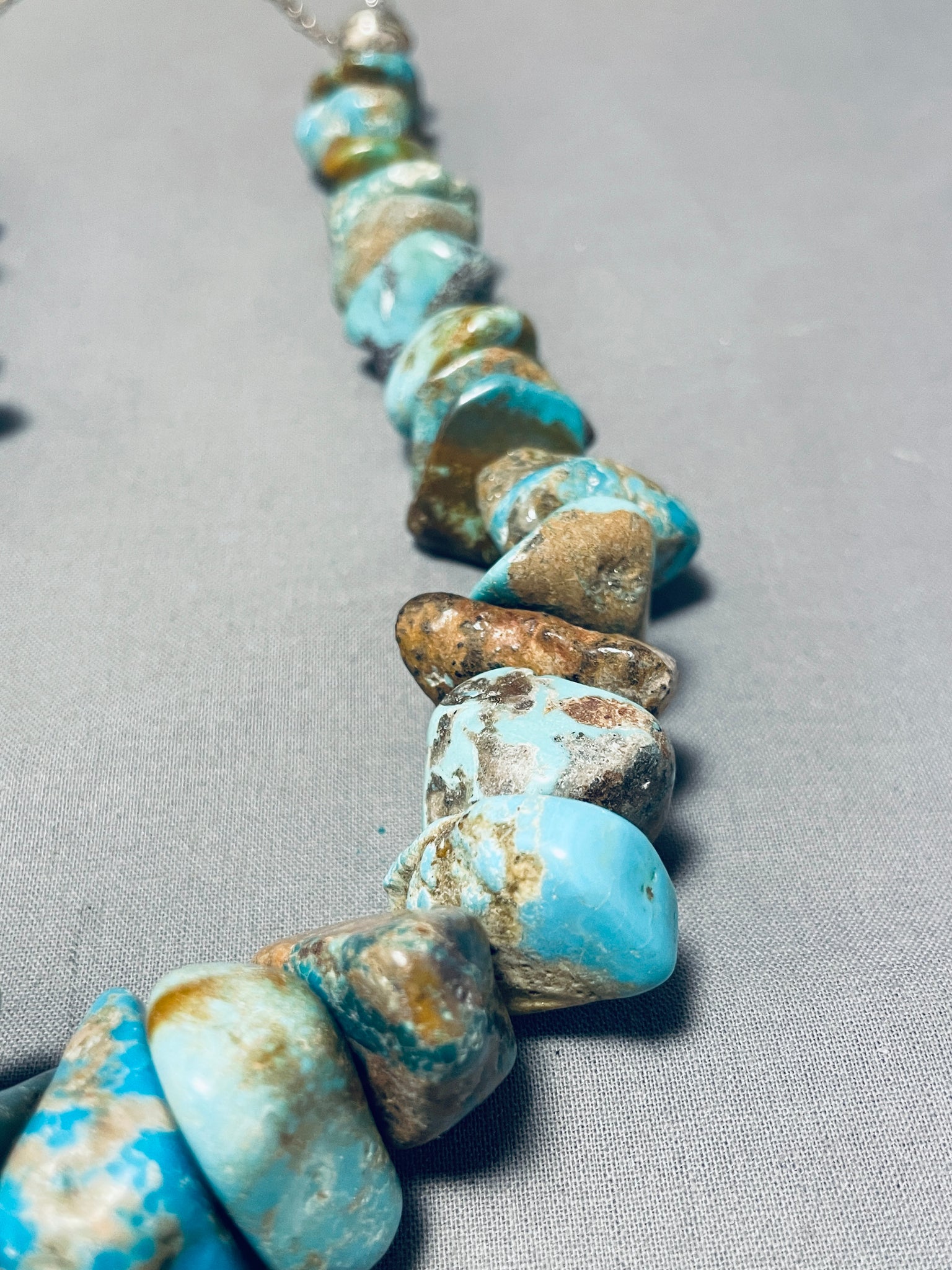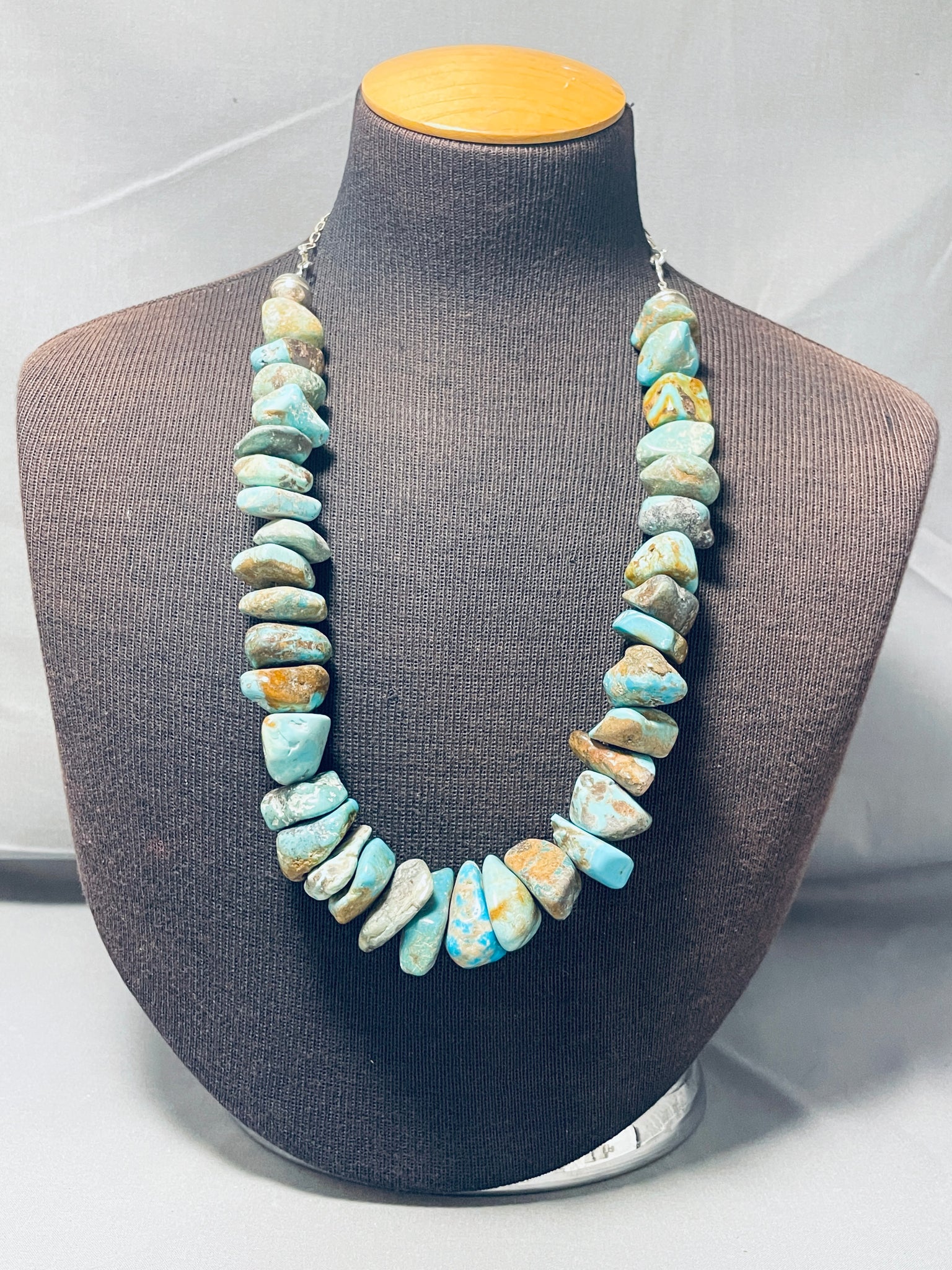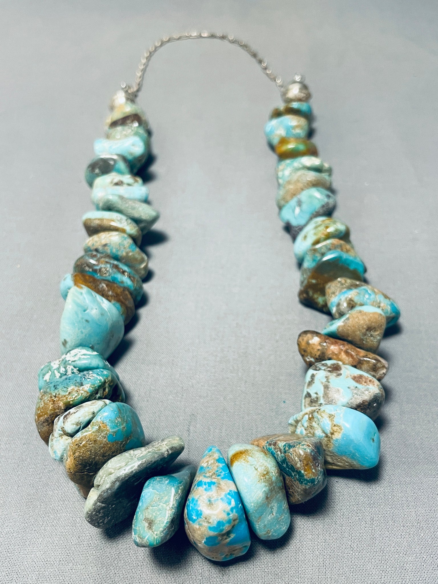 This is a magnificent vintage Navajo large chunky turquoise nugget silver necklace. This impeccable necklace contains a mind blowing plethora of hand cut chunky large turquoise nuggets that graduate in size towards the bottom. The stones appear to be from the incredible Royston, Old Kingman, and Number 8 turquoise mines. Resting at the ends are large silver beads with an adjustable silver link chain. The shortest the necklace measures is around 16" while the longest the necklace measures is about 24". Sterling silver. Cir. Mid century . Sturdy 249 grams.