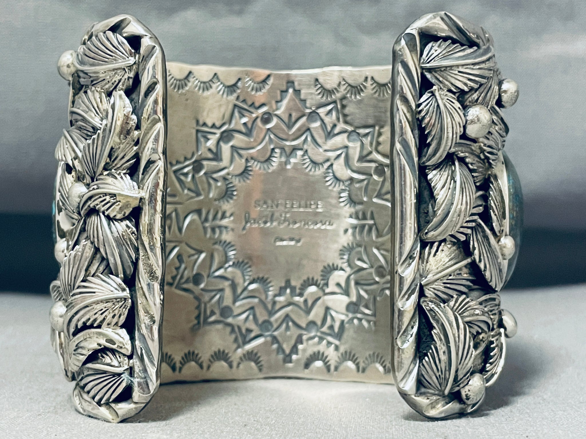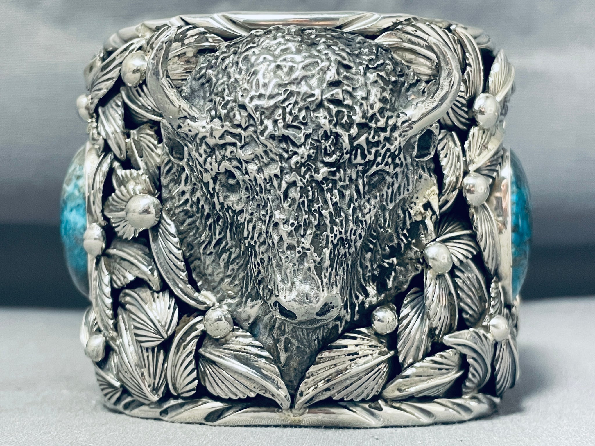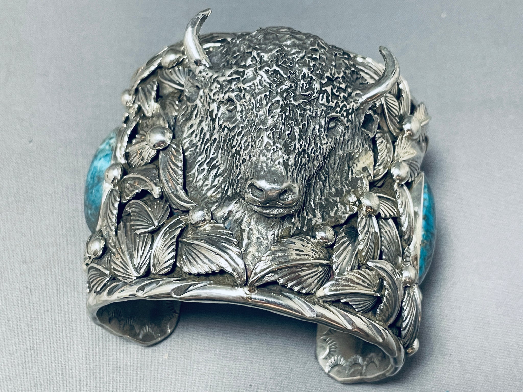 This is an impressive Native American very large and wide cuff silver buffalo bracelet. This impeccable bracelet is very thick, wide and heavy consisting of a mind blowing plethora of handmade silver leaves and raindrops. Located in the center is a phenomenal hand carved 3D siklver buffalo that measures around 2" X 1-3/4". Resting at the ends of the cuff are large chunky spiderweb turquoise stones. Bordering the very wide and thick silver cuff are amazing silver wave works. Located on the inside of the cuff are superior internal stampings that include suns, pueblo patterns, dotted works and teepee patterns. This bracelet is absolutely incredible with all of the detailing. The stones measure around 1" x 7/8". The width of the bracelet measures around 2-1/2". Signed by artist, Jake Troncosa. Sterling silver, marked. The inside end to end measures around 5-3/4" with an additional 1-1/4" gap. Sturdy 259 grams.