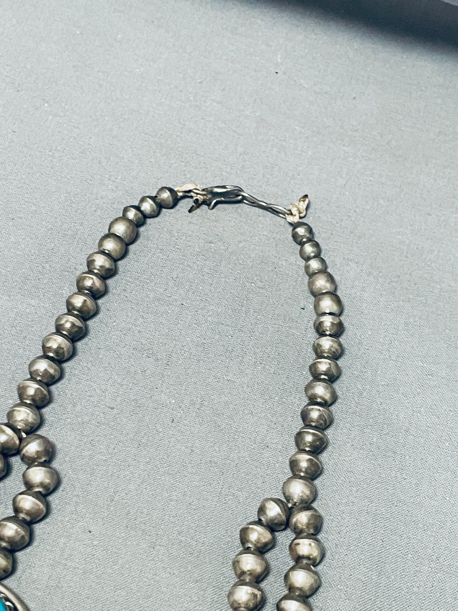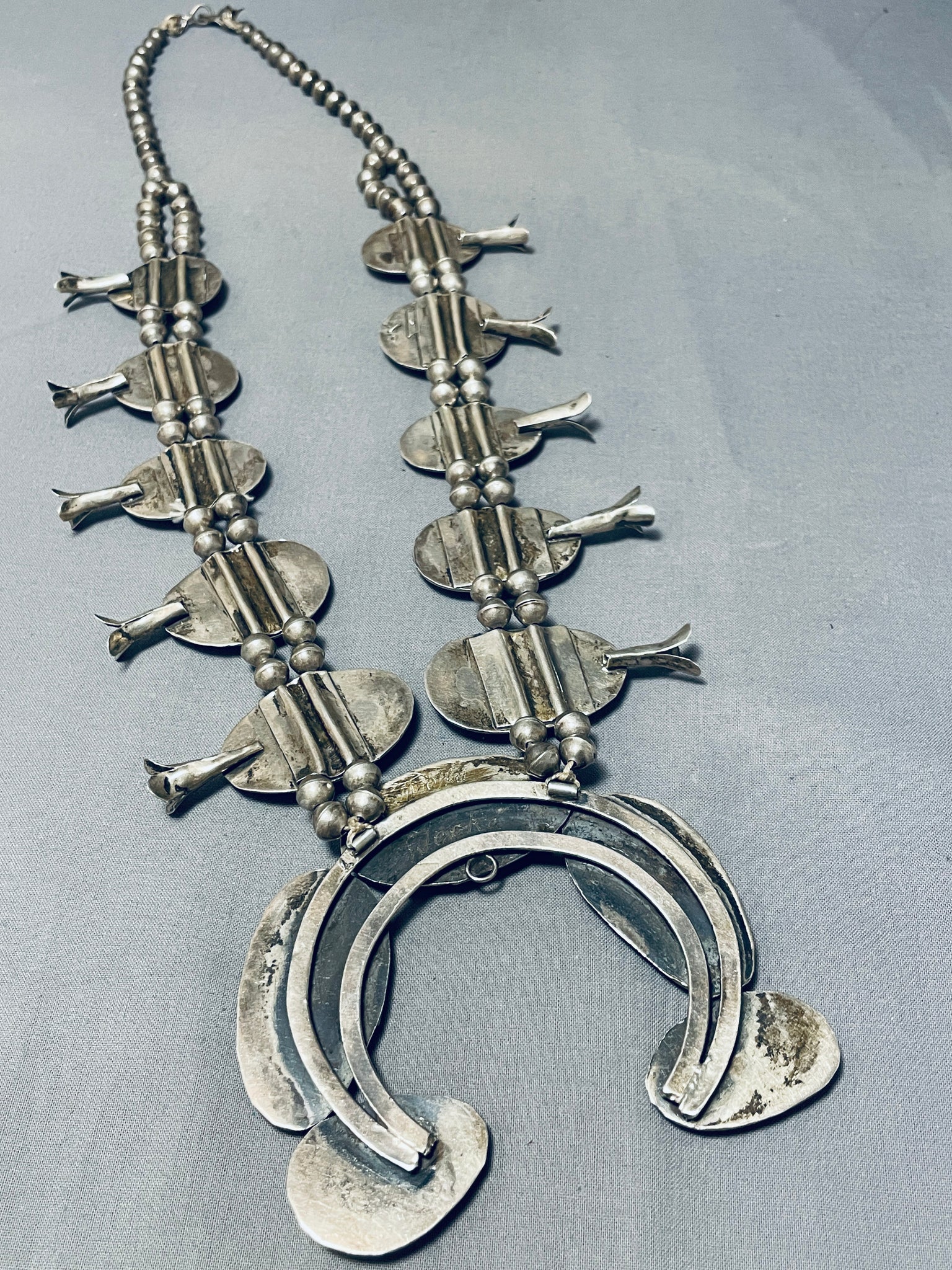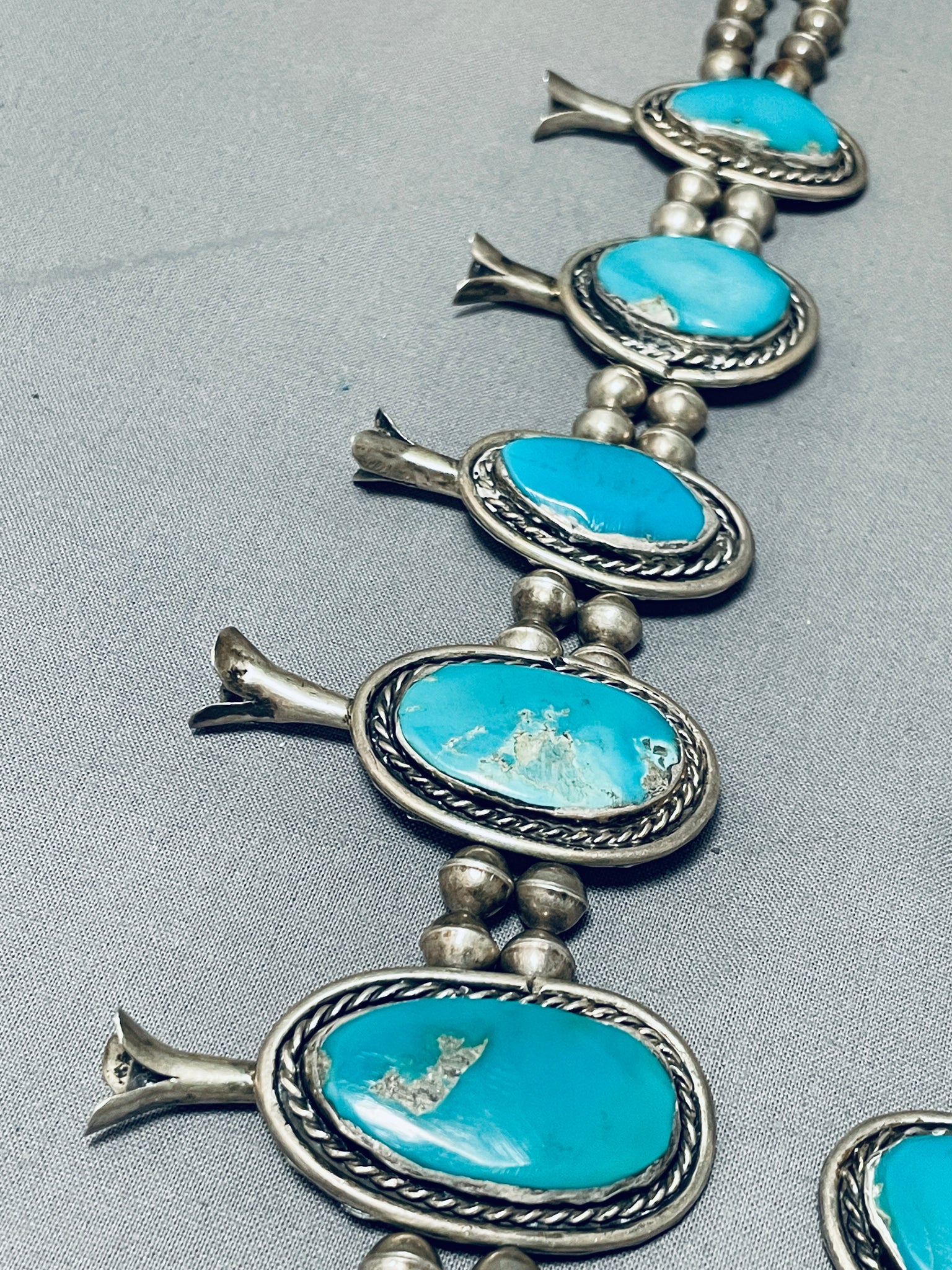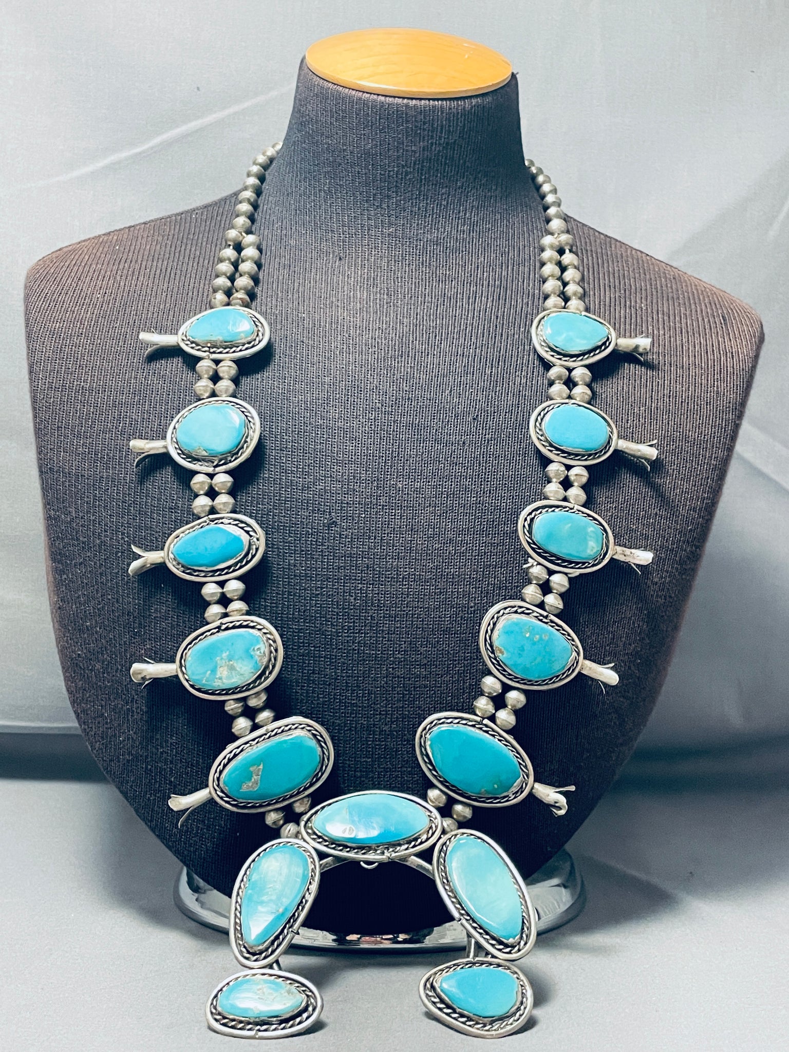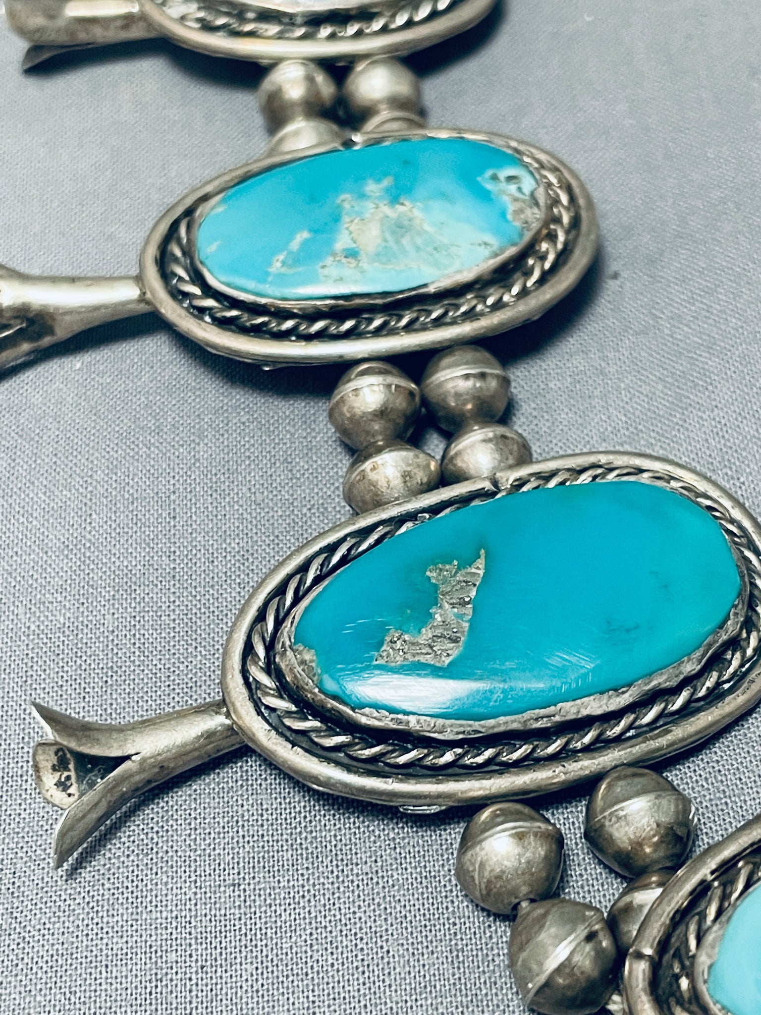 262 Gram Athntc Vintage Native American Navajo Turquoise Sterling Silver Squash Blossom Necklace