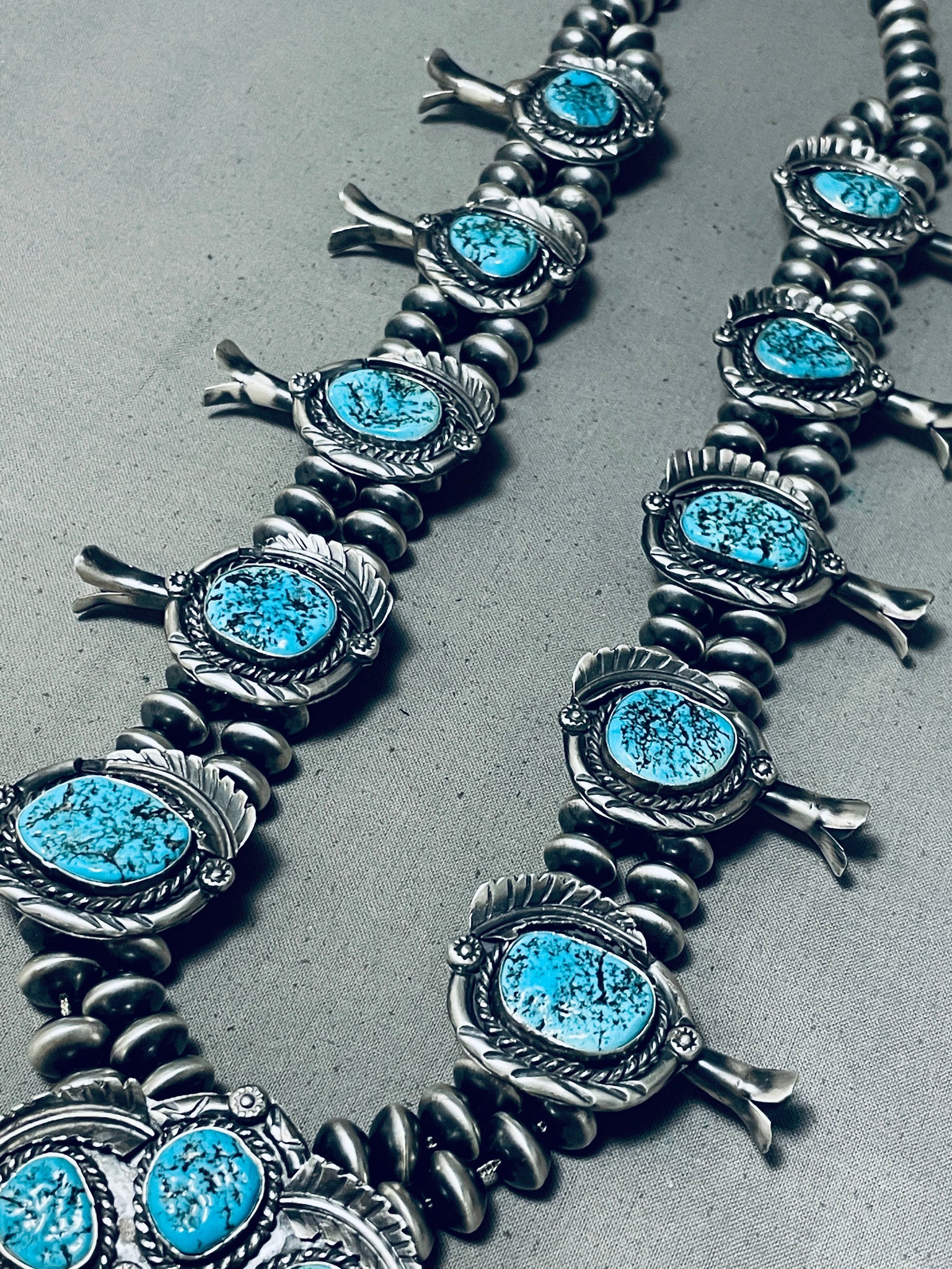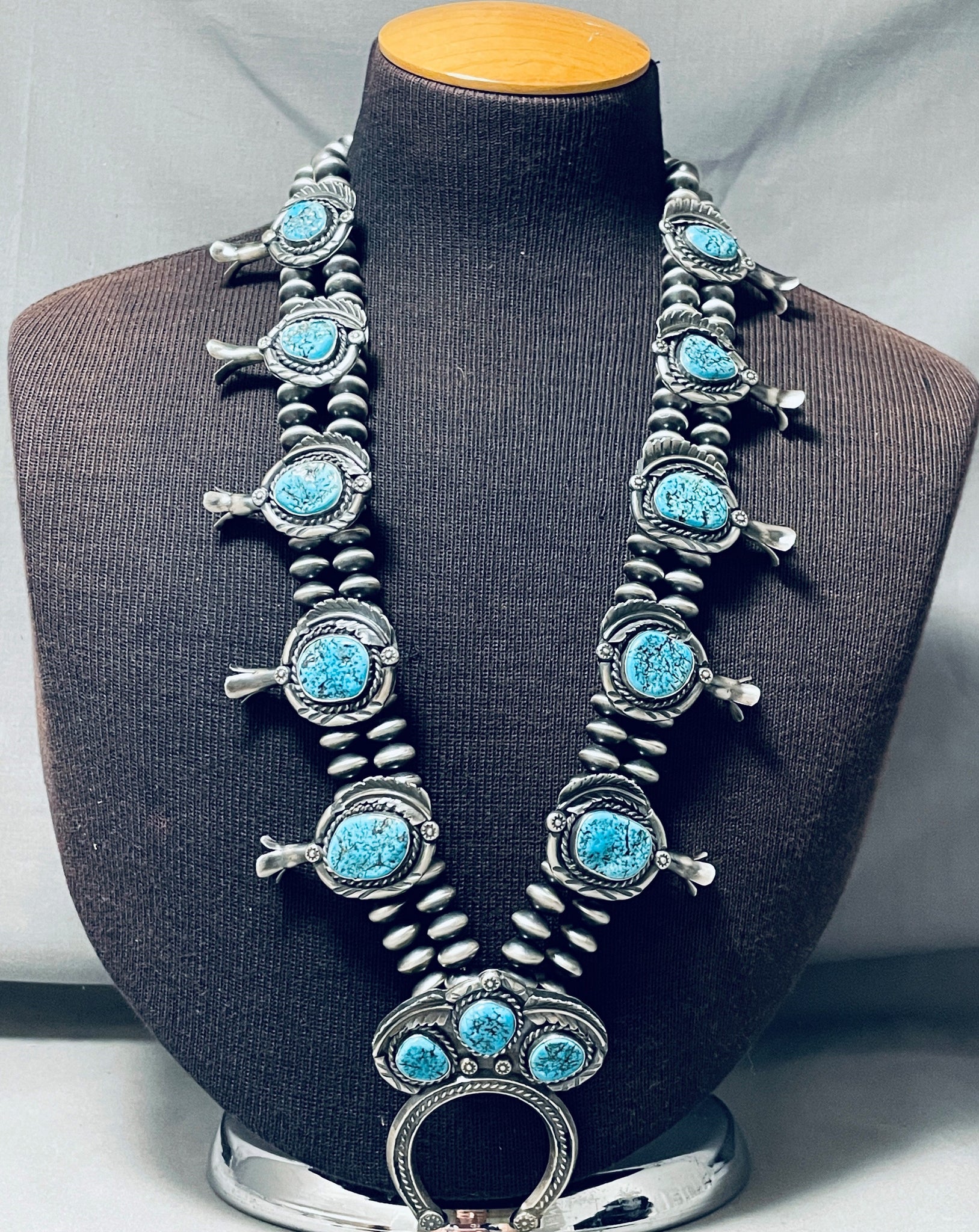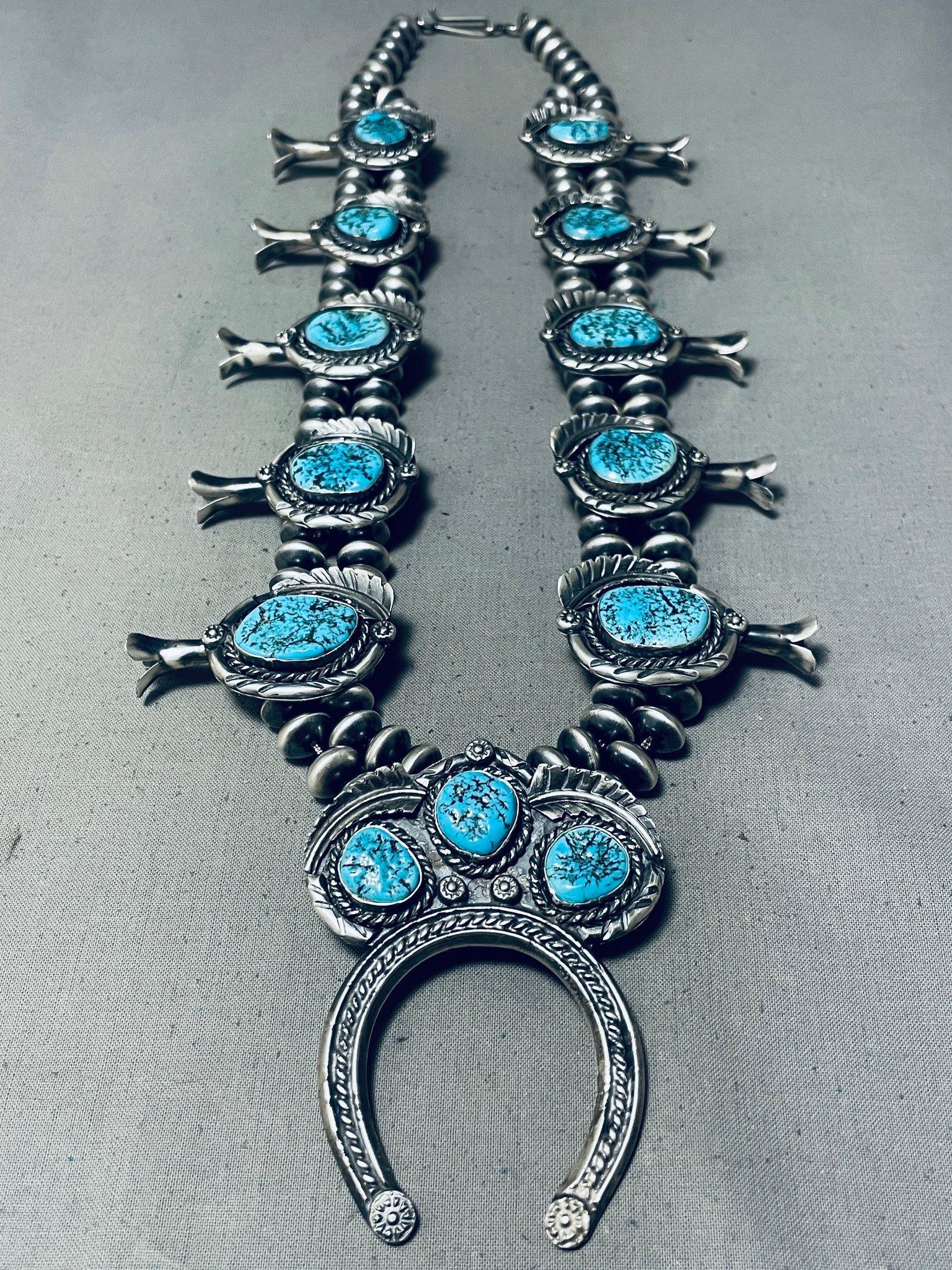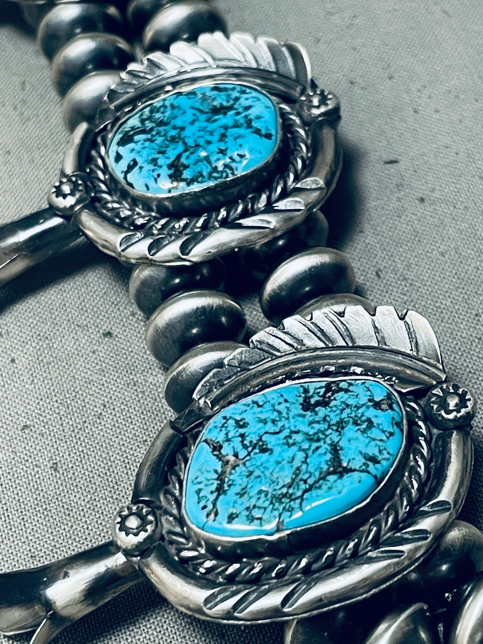 284 Gram Women's Native American Navajo Hand Sterling Silver Turquoise Squash Blossom Necklace