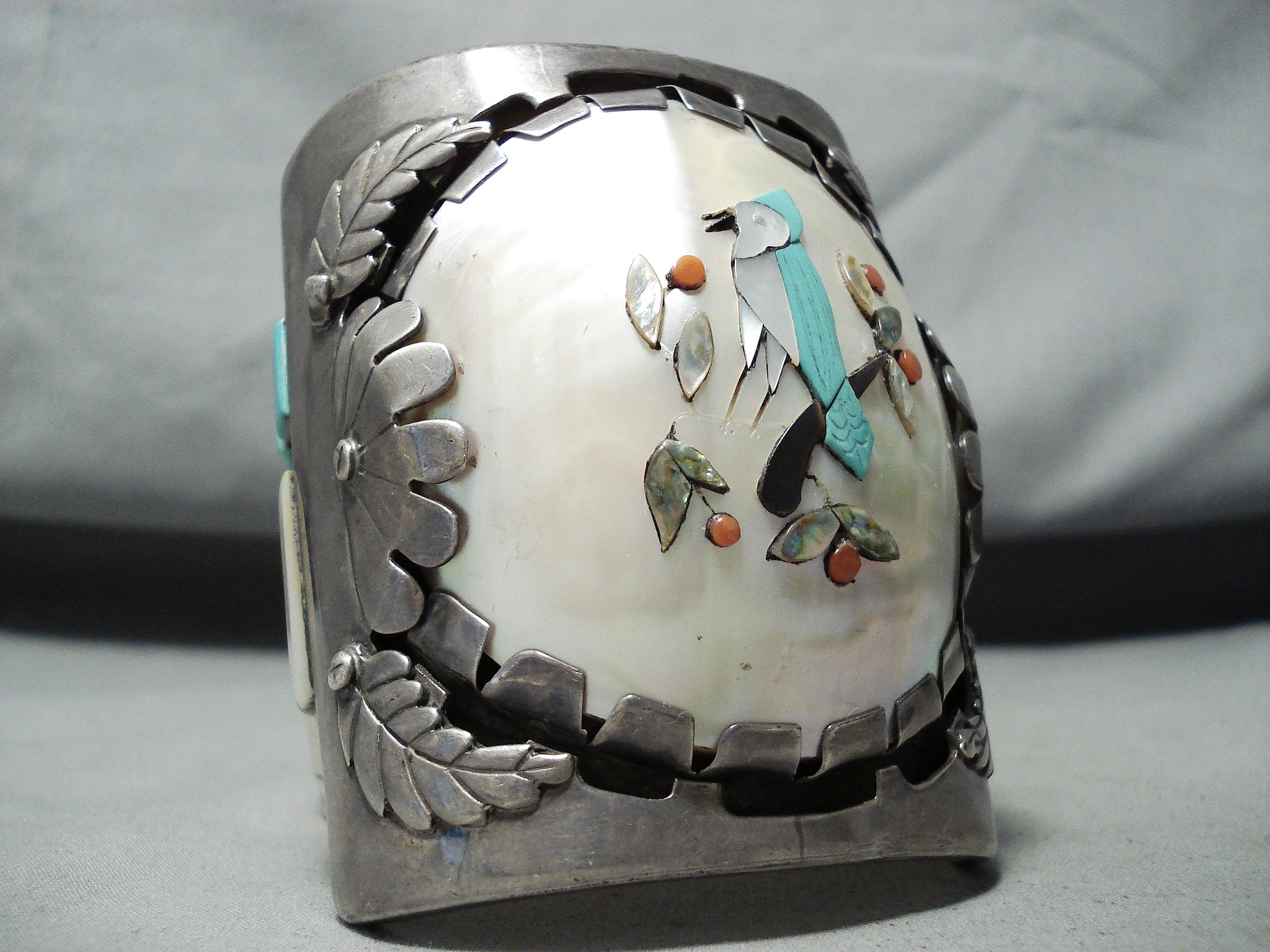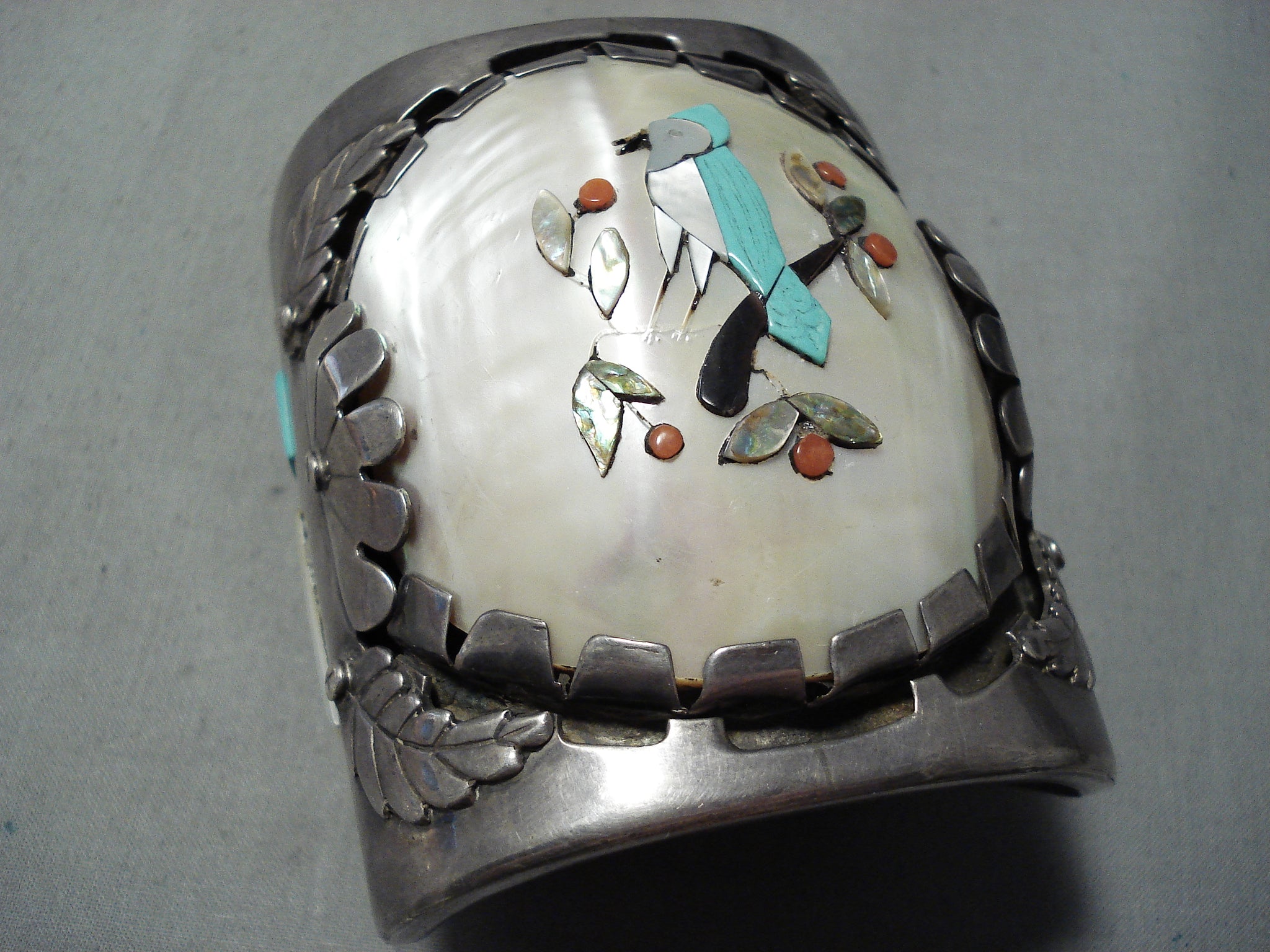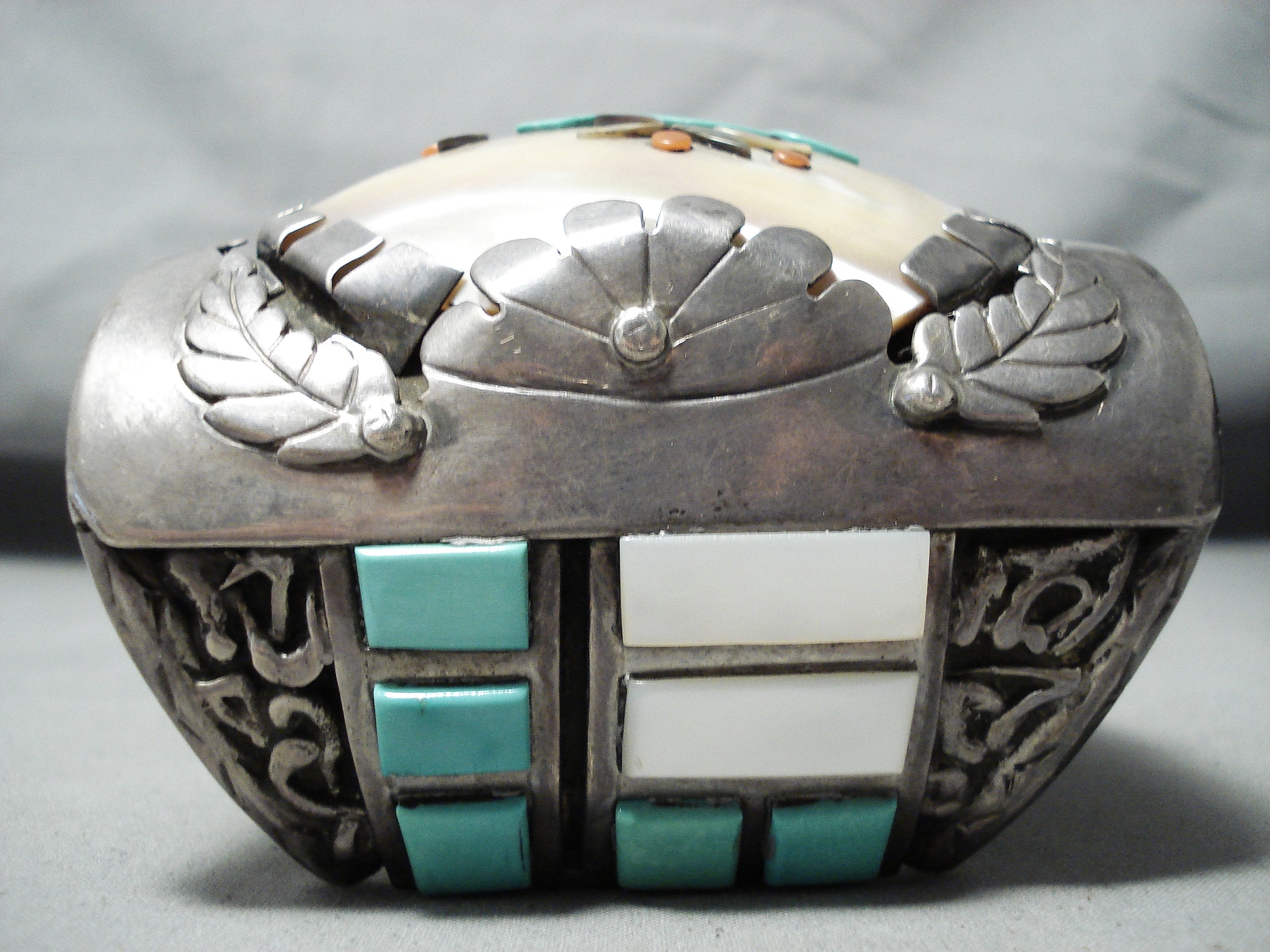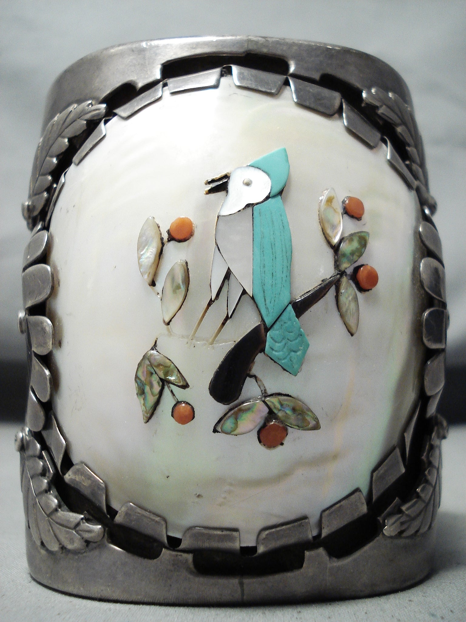 300 Gram Best Vintage Native American Zuni Bird Turquoise Inlay Sterling Silver Bracelet