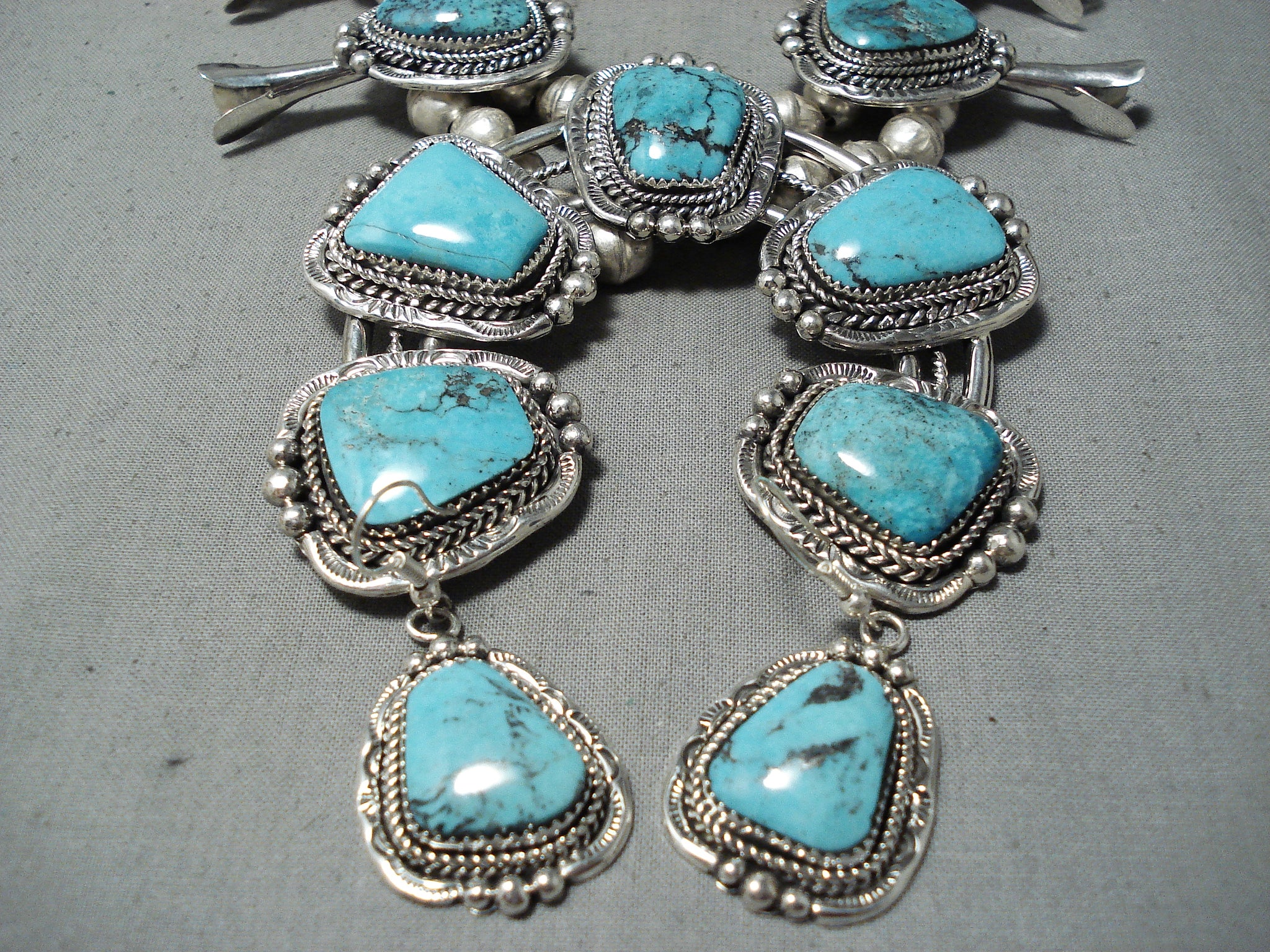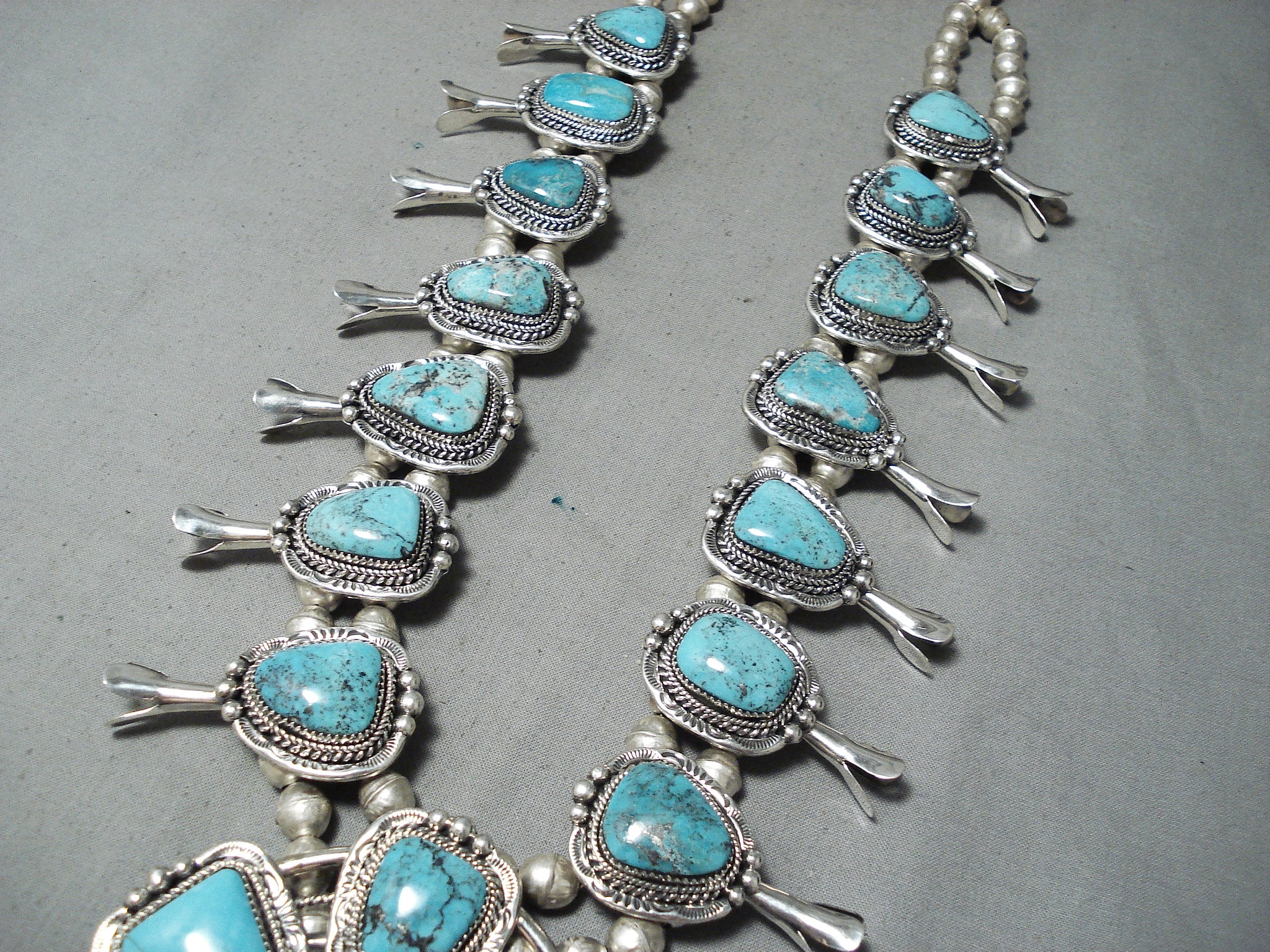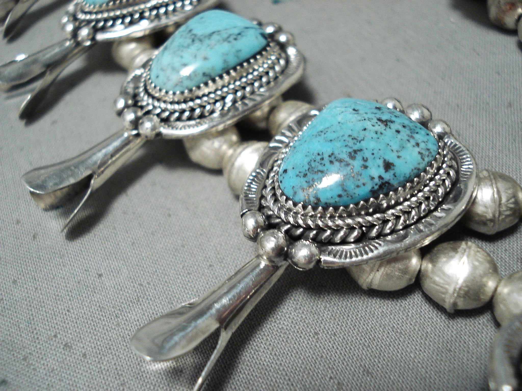 300+ Gram Heavy Vintage Native American Navajo Turquoise Sterling Silver Squash Blossom Necklace