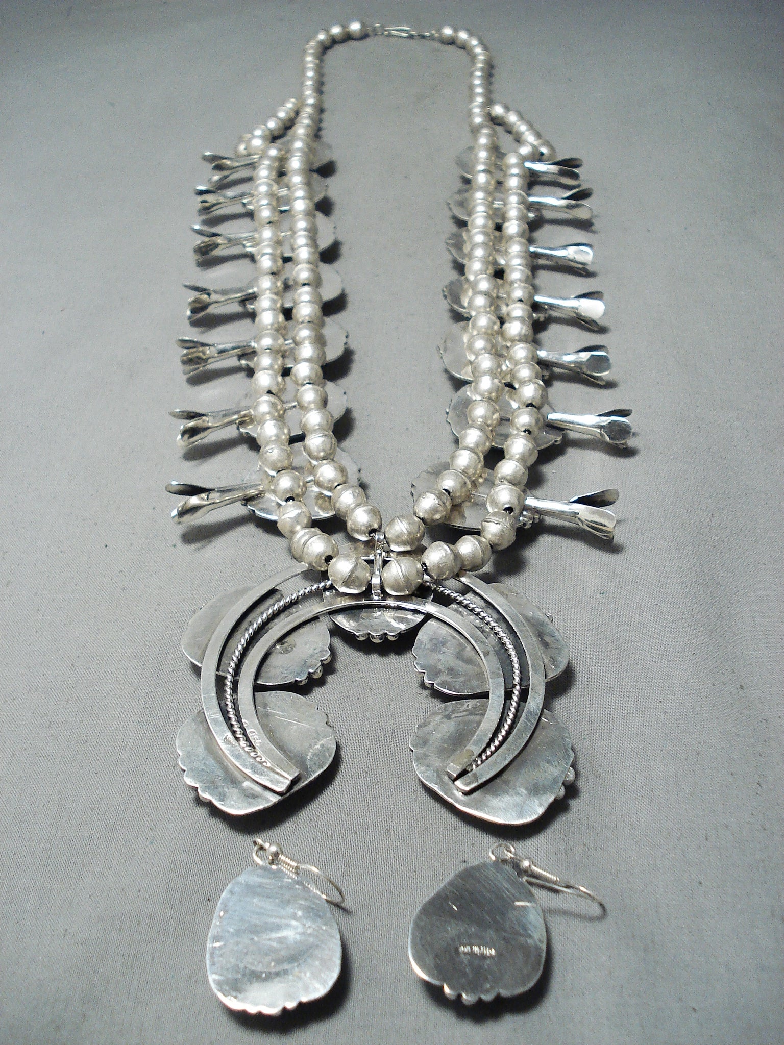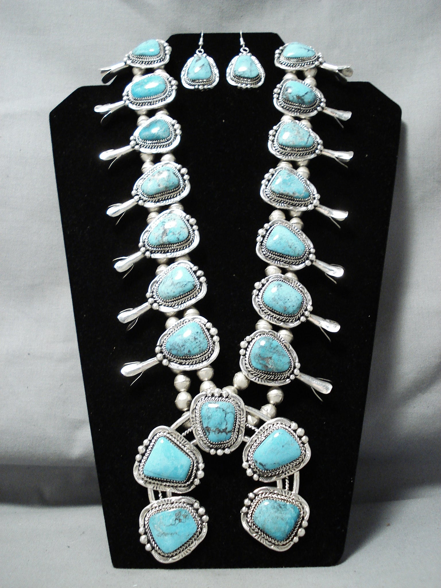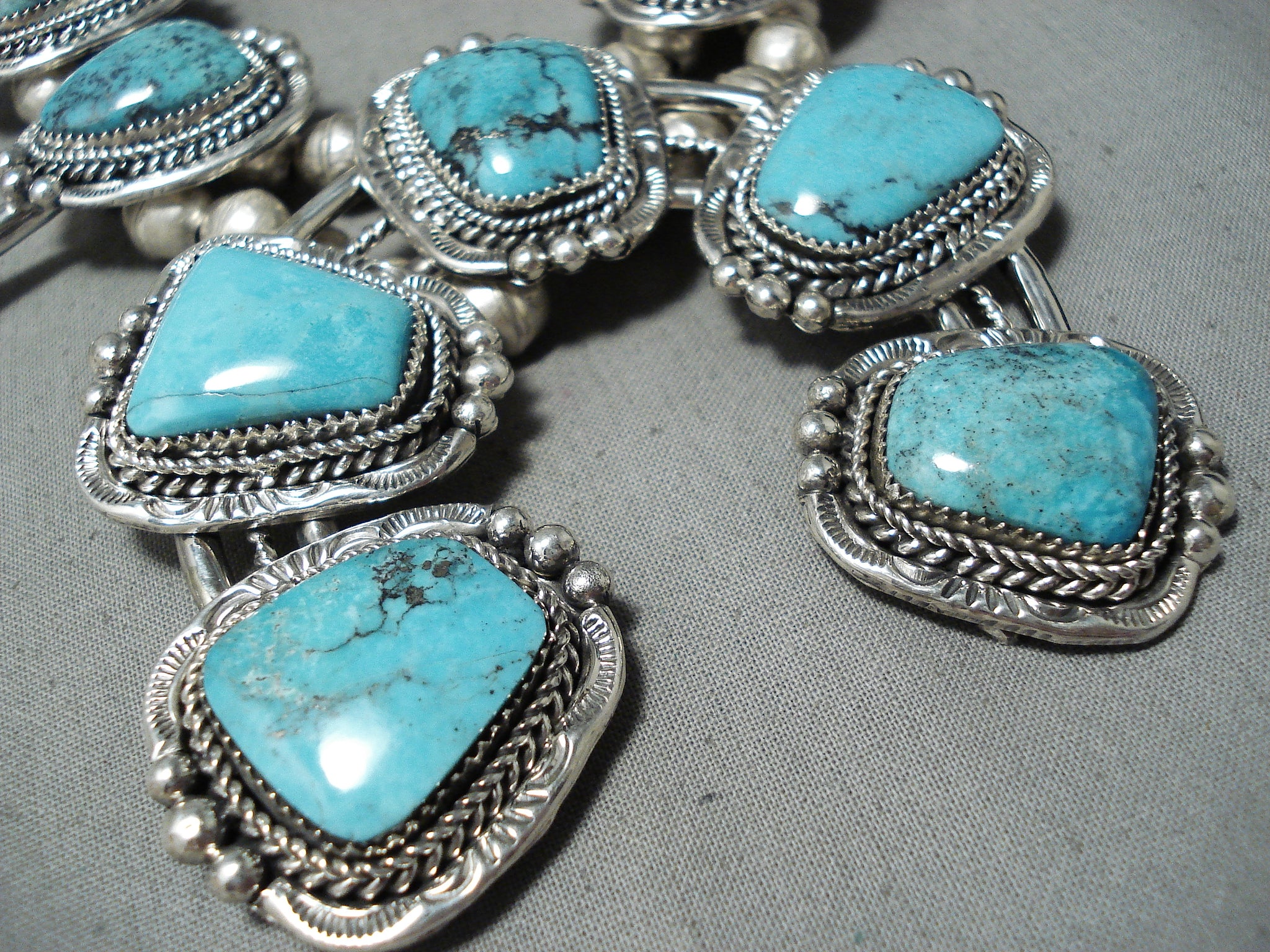 300+ Gram Heavy Vintage Native American Navajo Turquoise Sterling Silver Squash Blossom Necklace