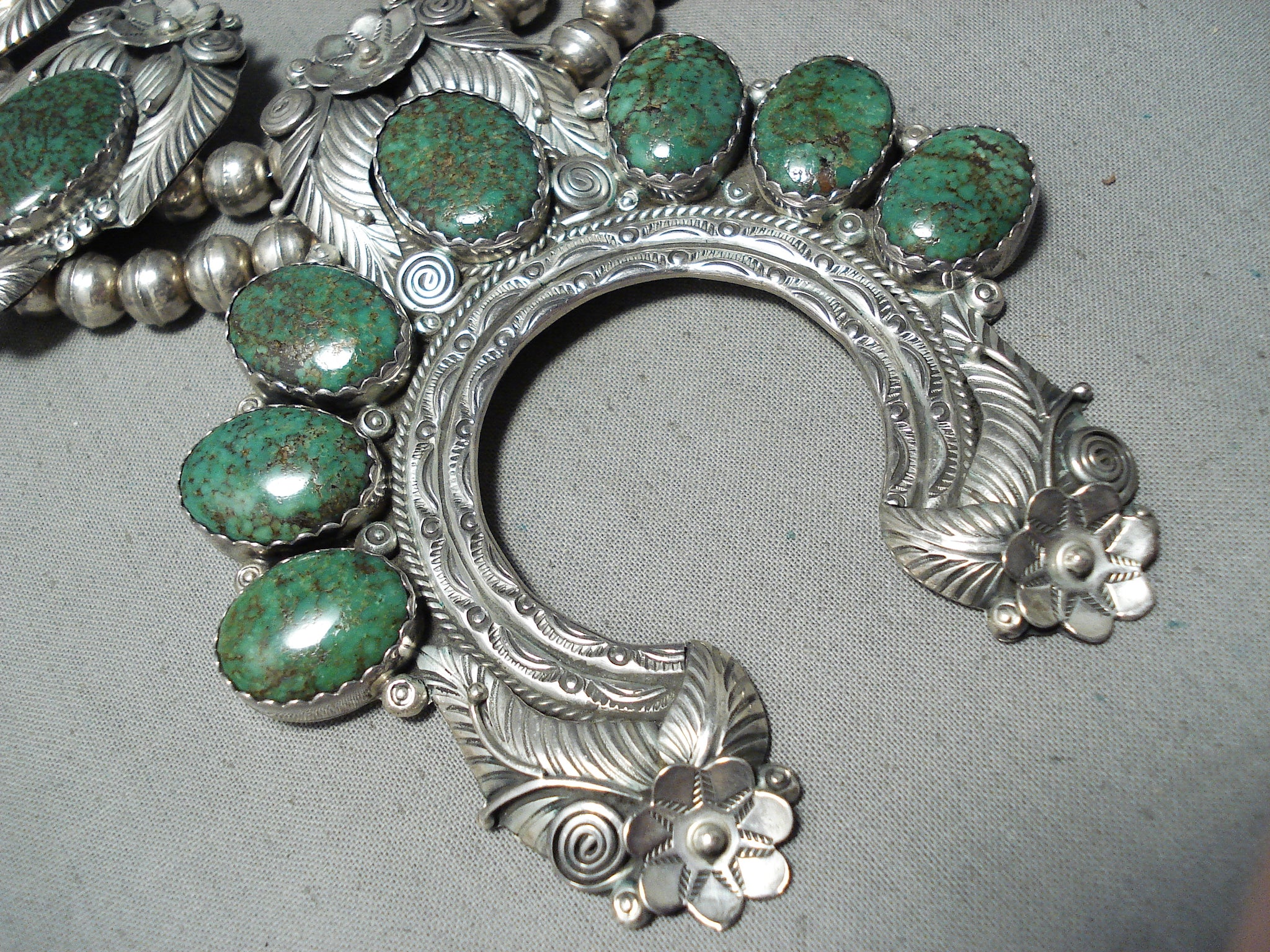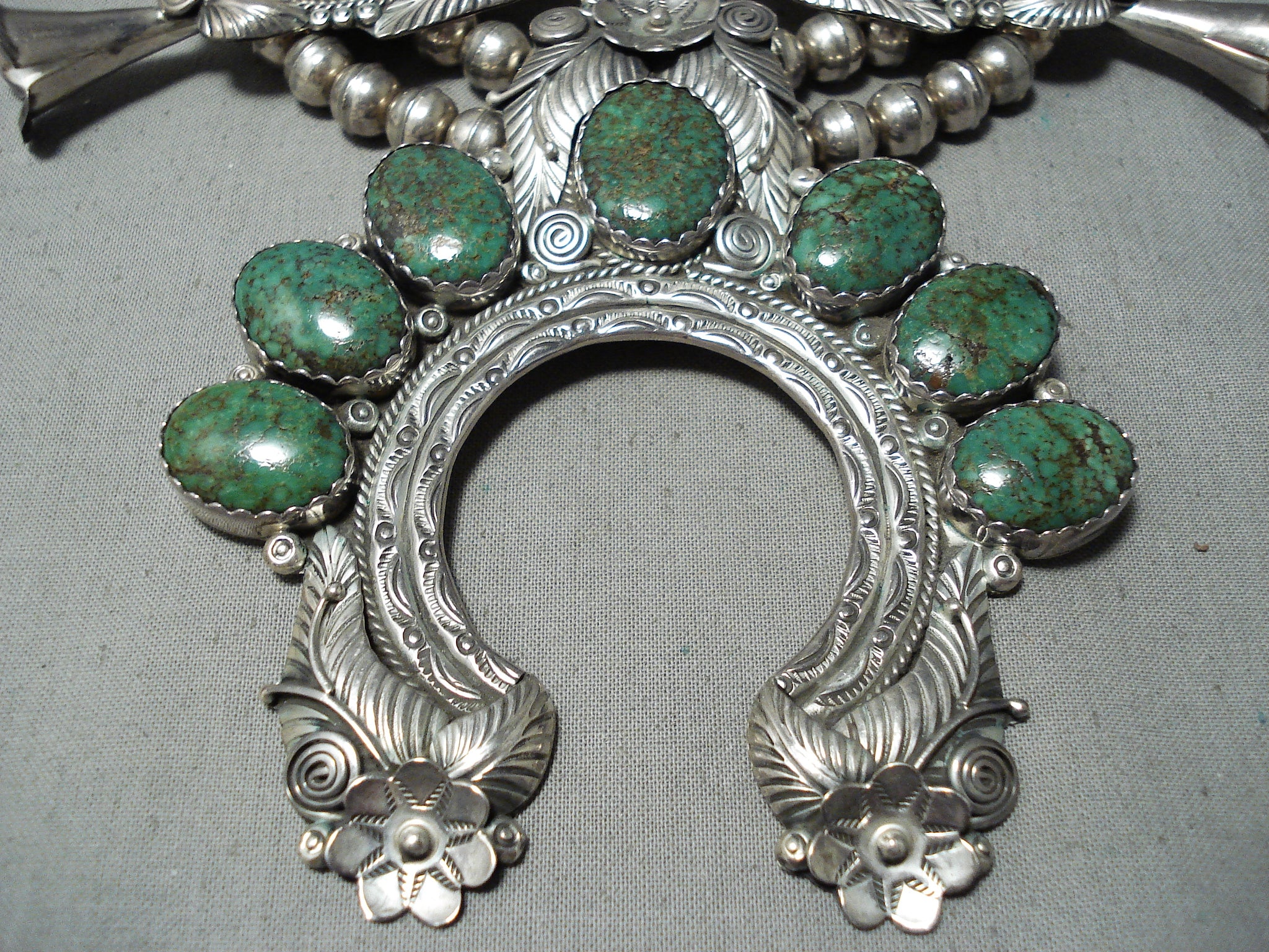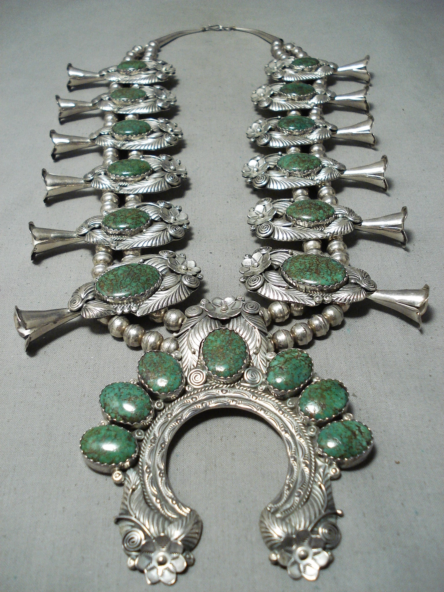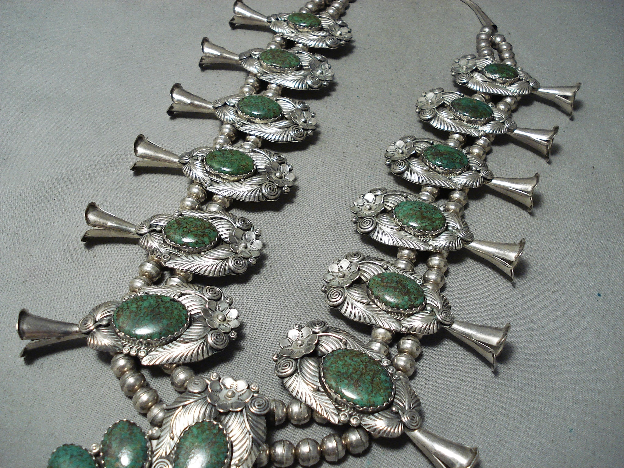 300+ Gram Vintage Native American Navajo Green Turquoise Sterling Silver Squash Blossom Necklace