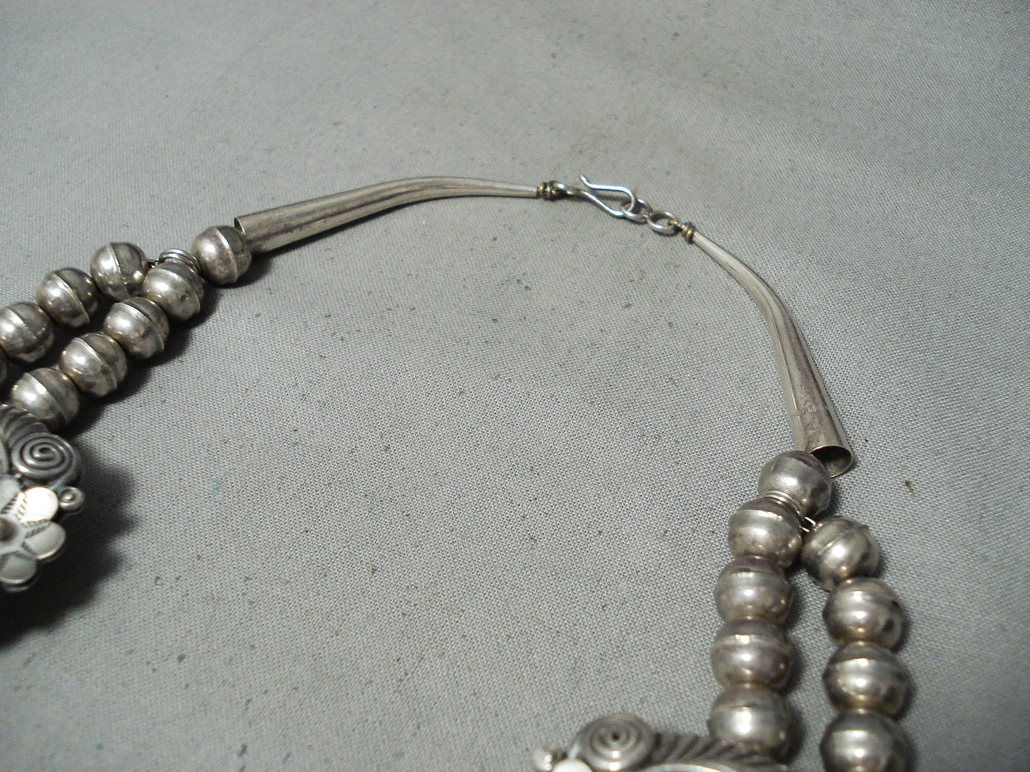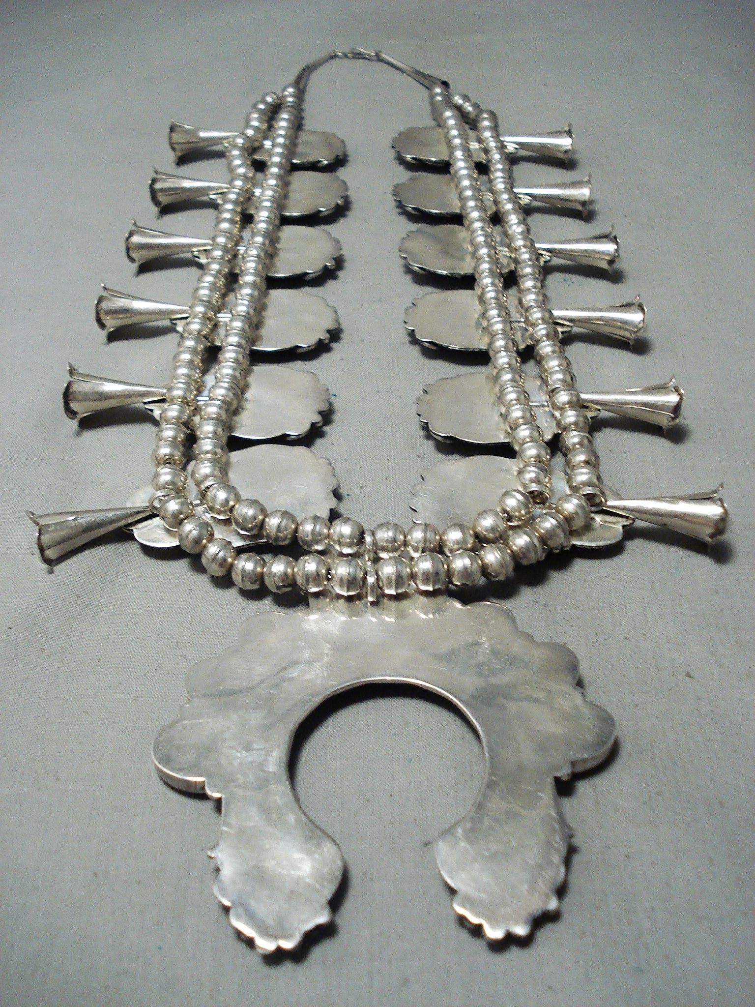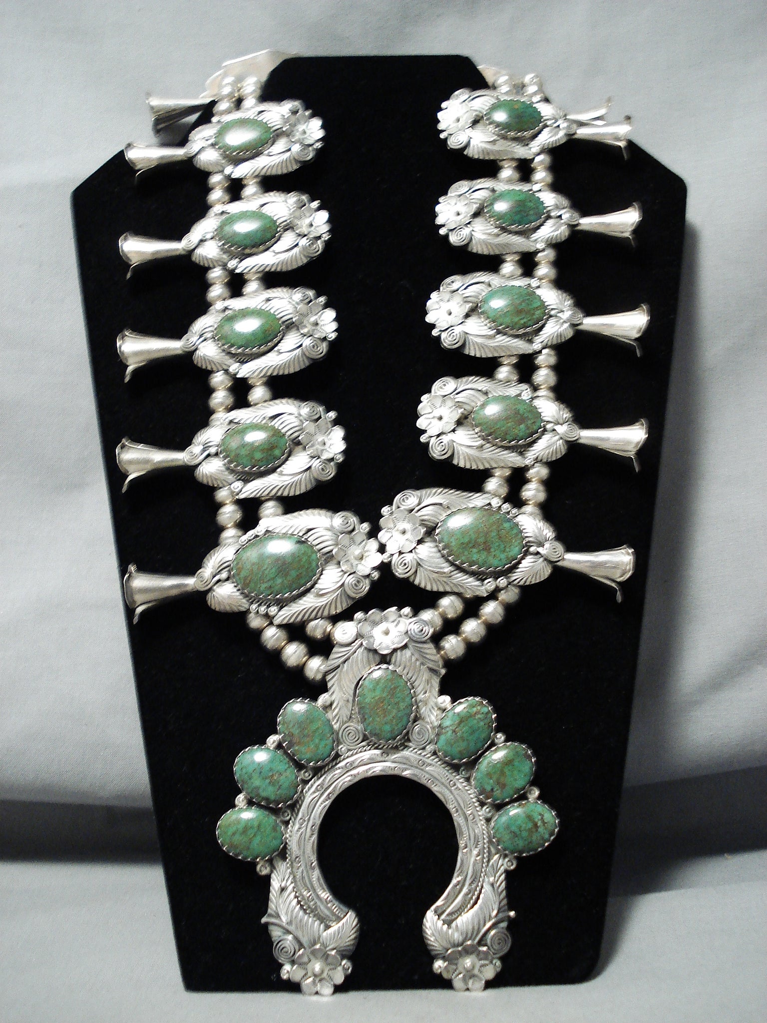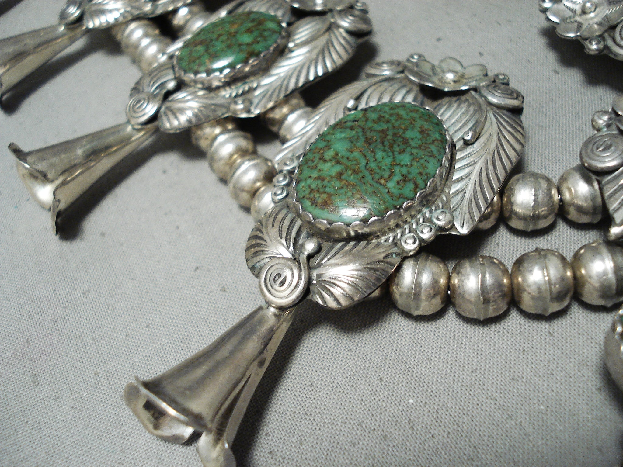 300+ Gram Vintage Native American Navajo Green Turquoise Sterling Silver Squash Blossom Necklace