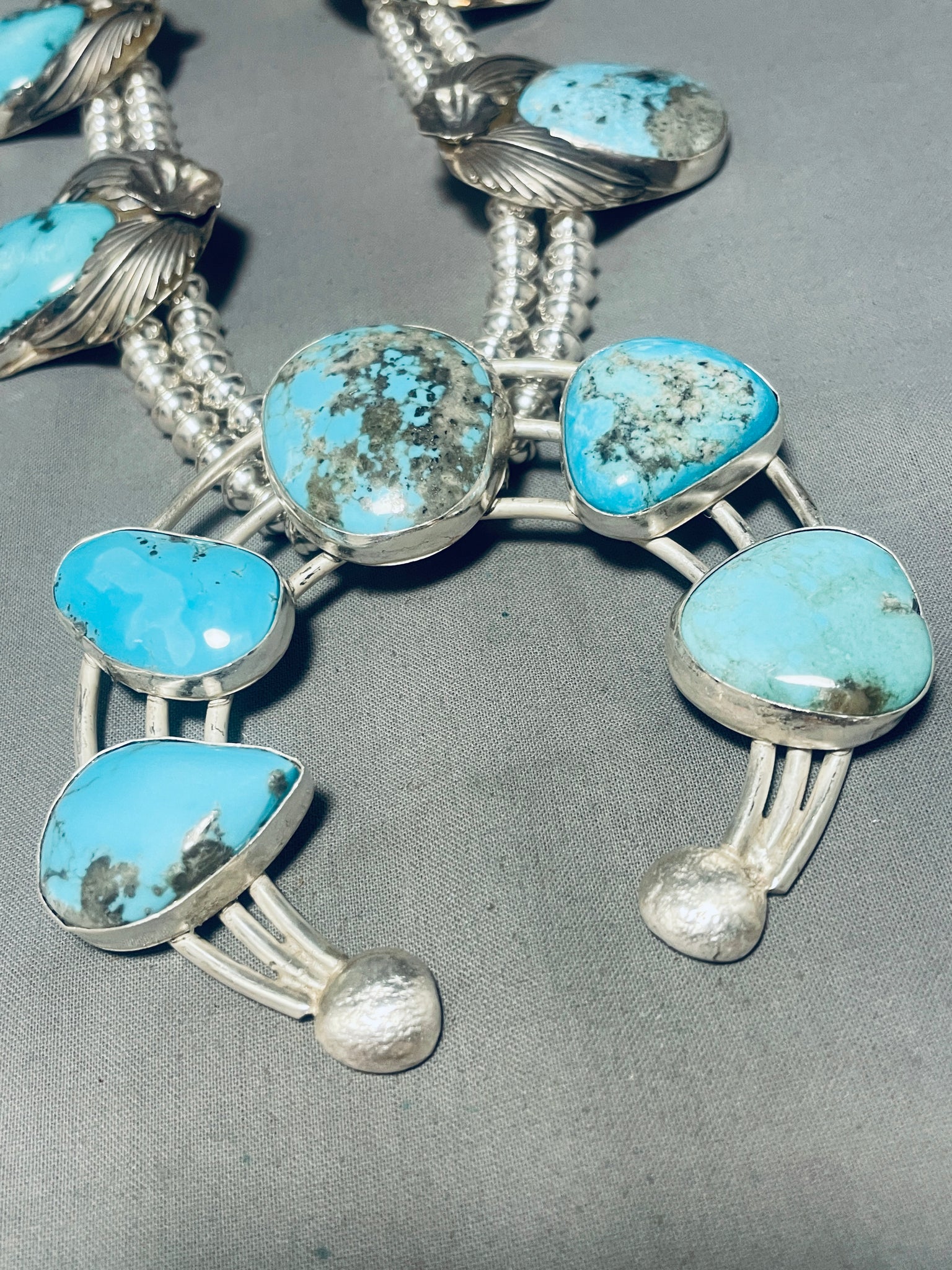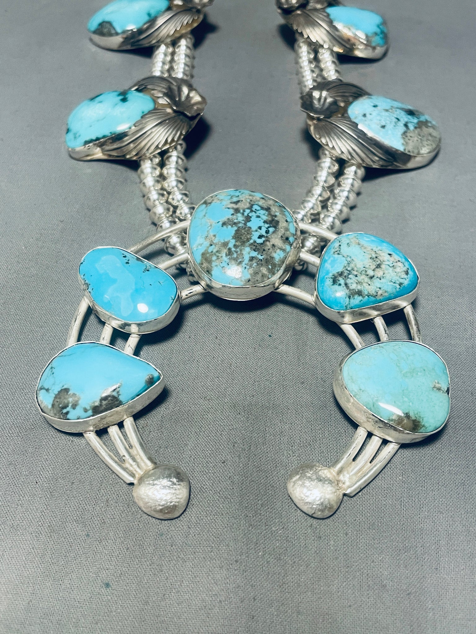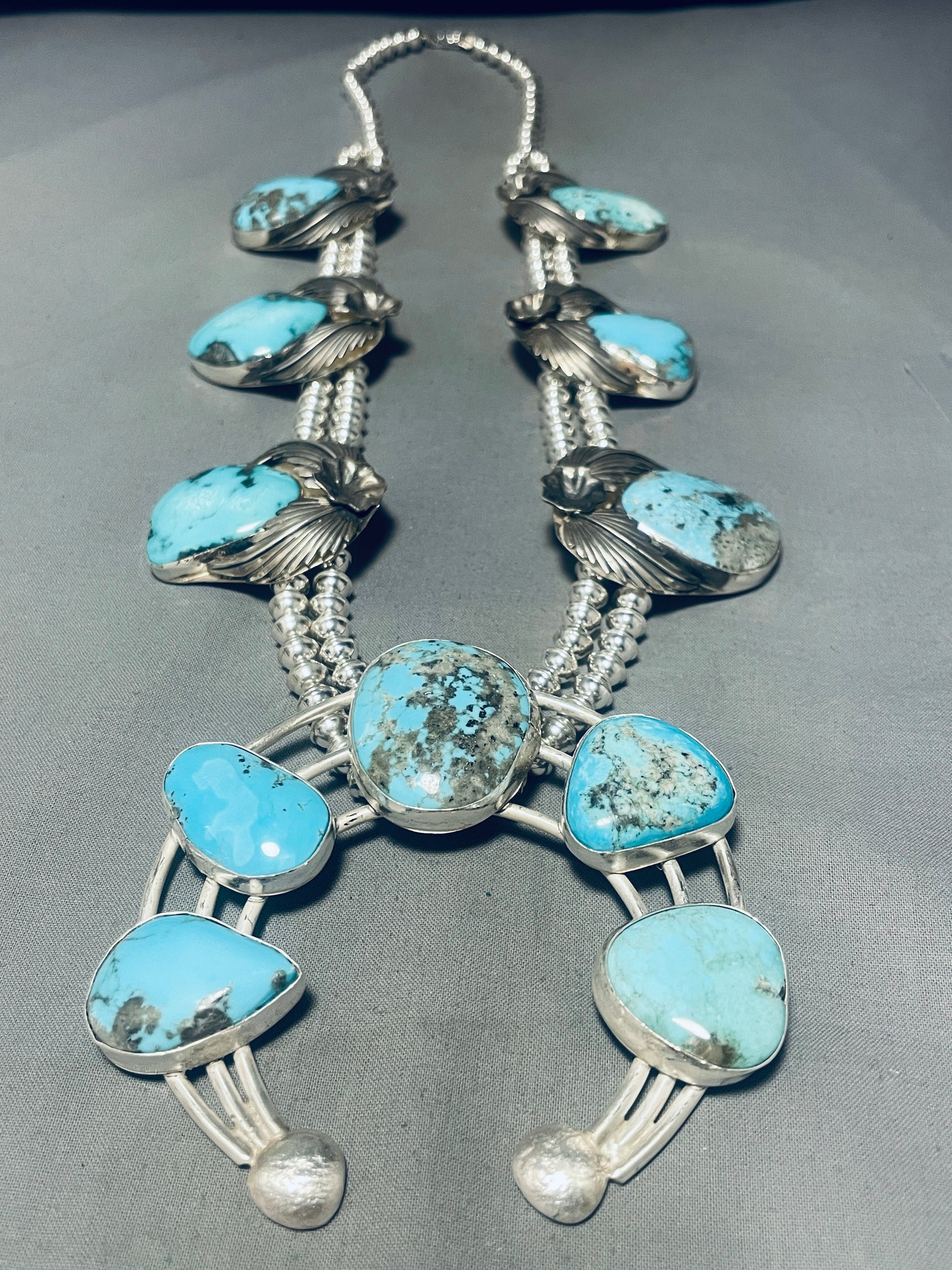 324 Grams!! Native American Navajo Turquoise Sterling Silver Squash Blossom Necklace