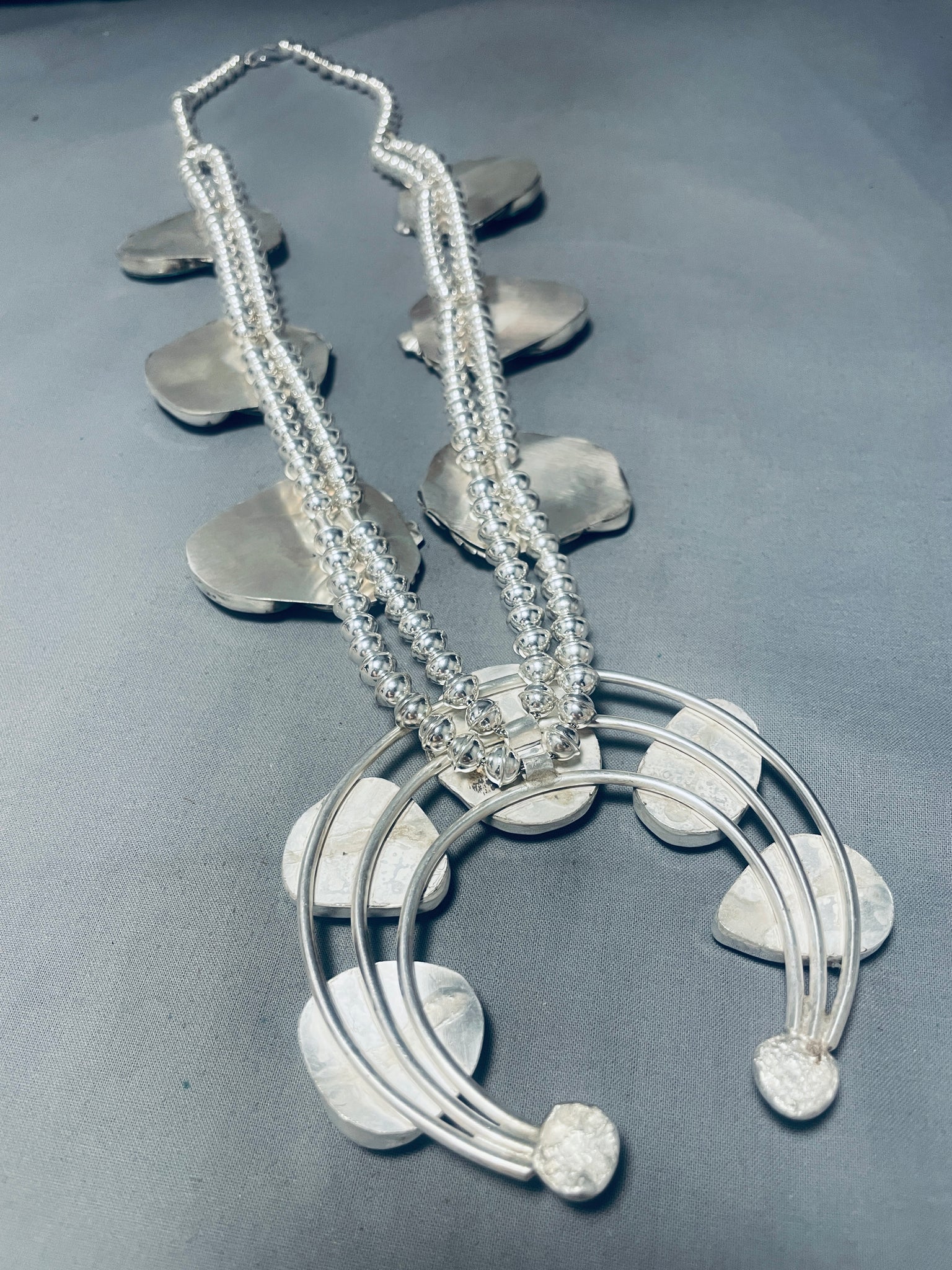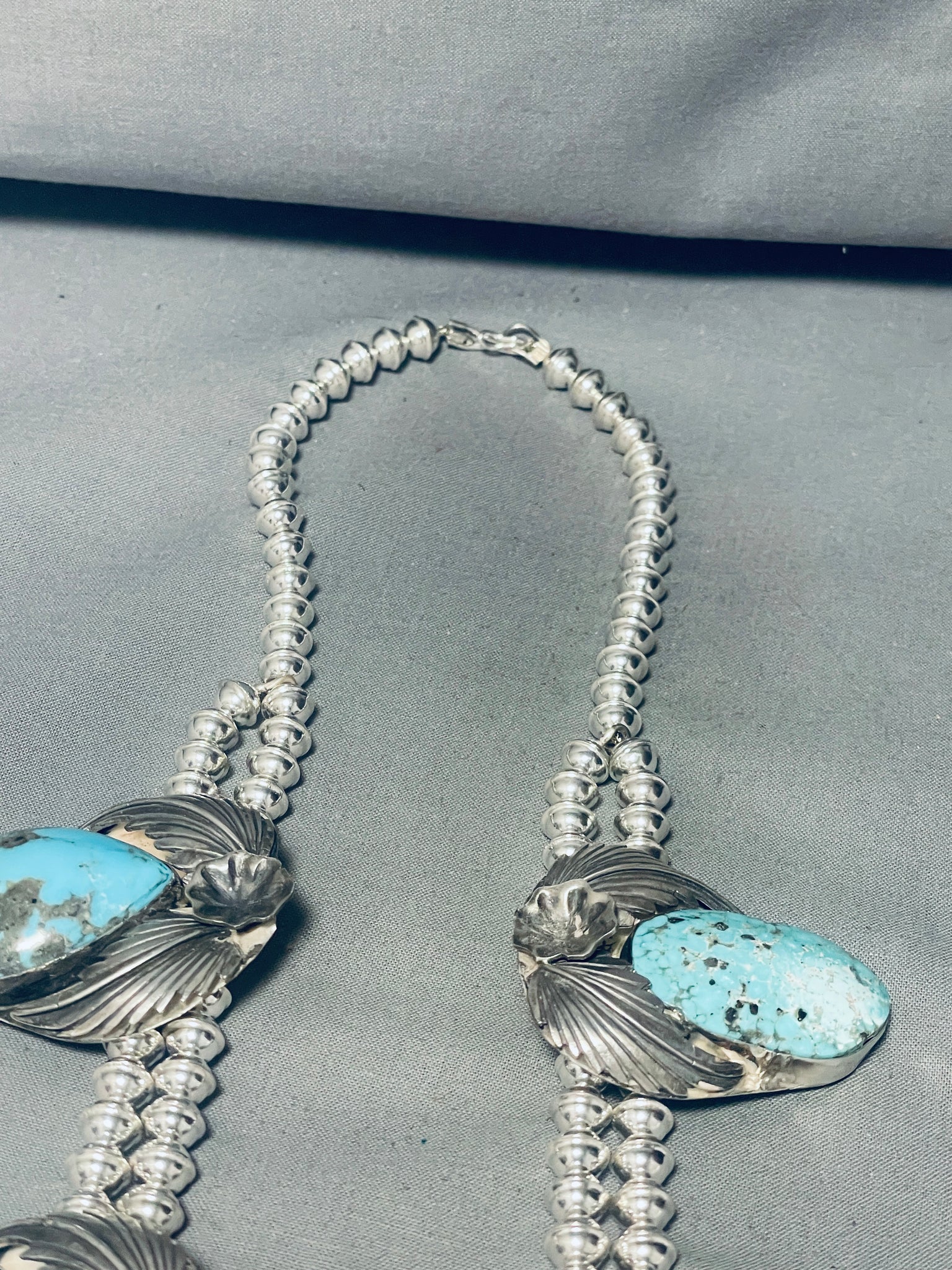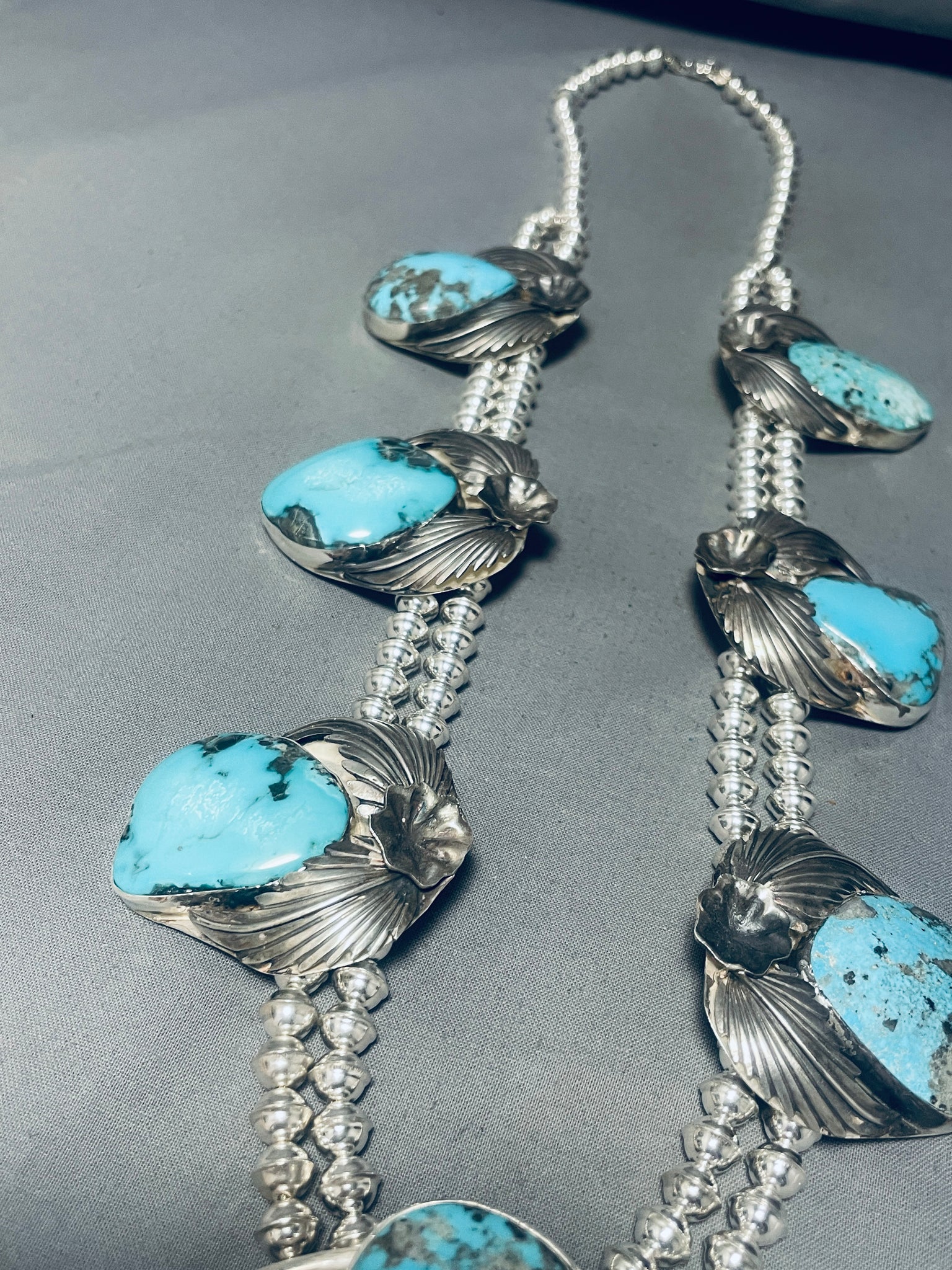 324 Grams!! Native American Navajo Turquoise Sterling Silver Squash Blossom Necklace