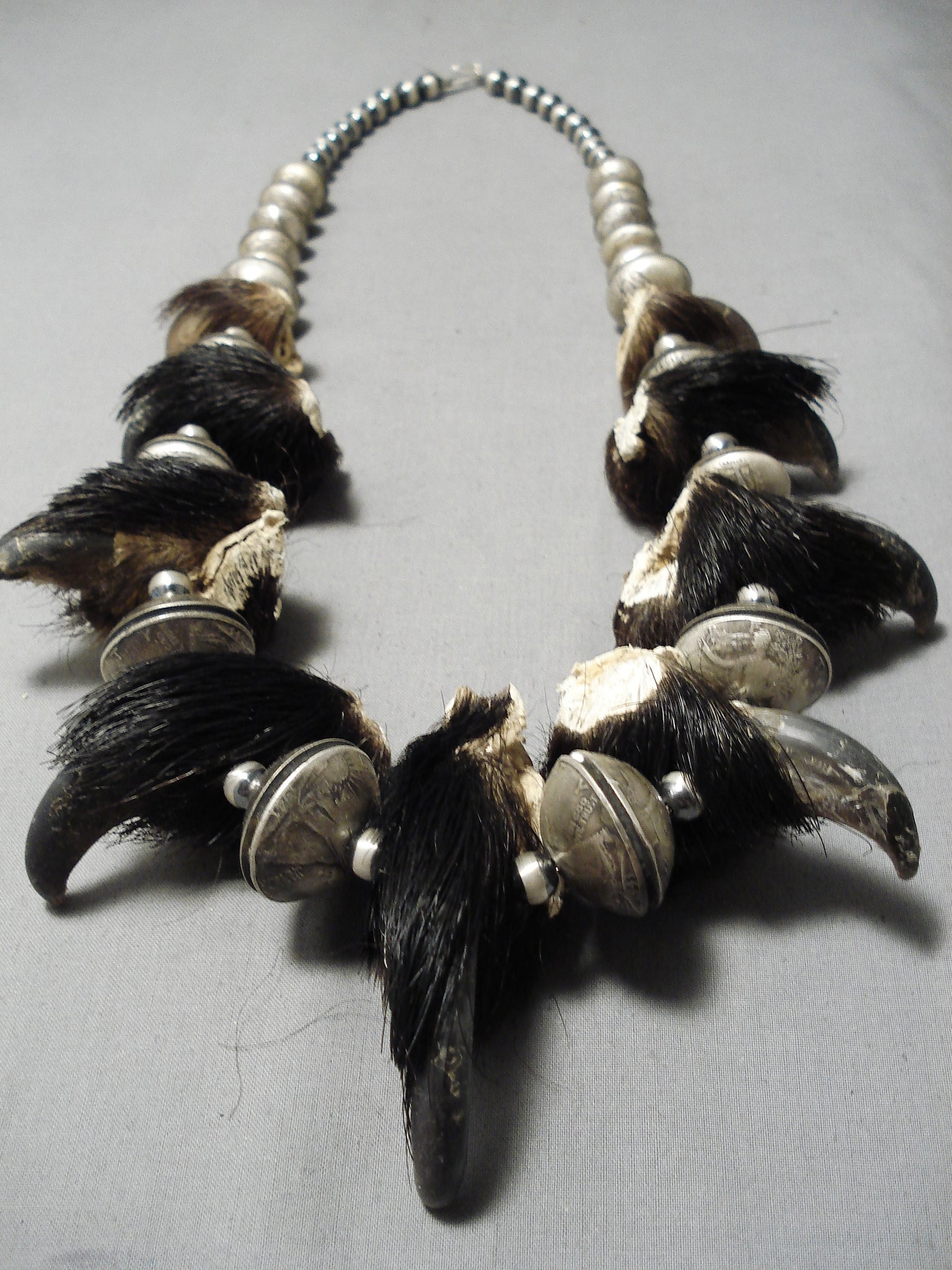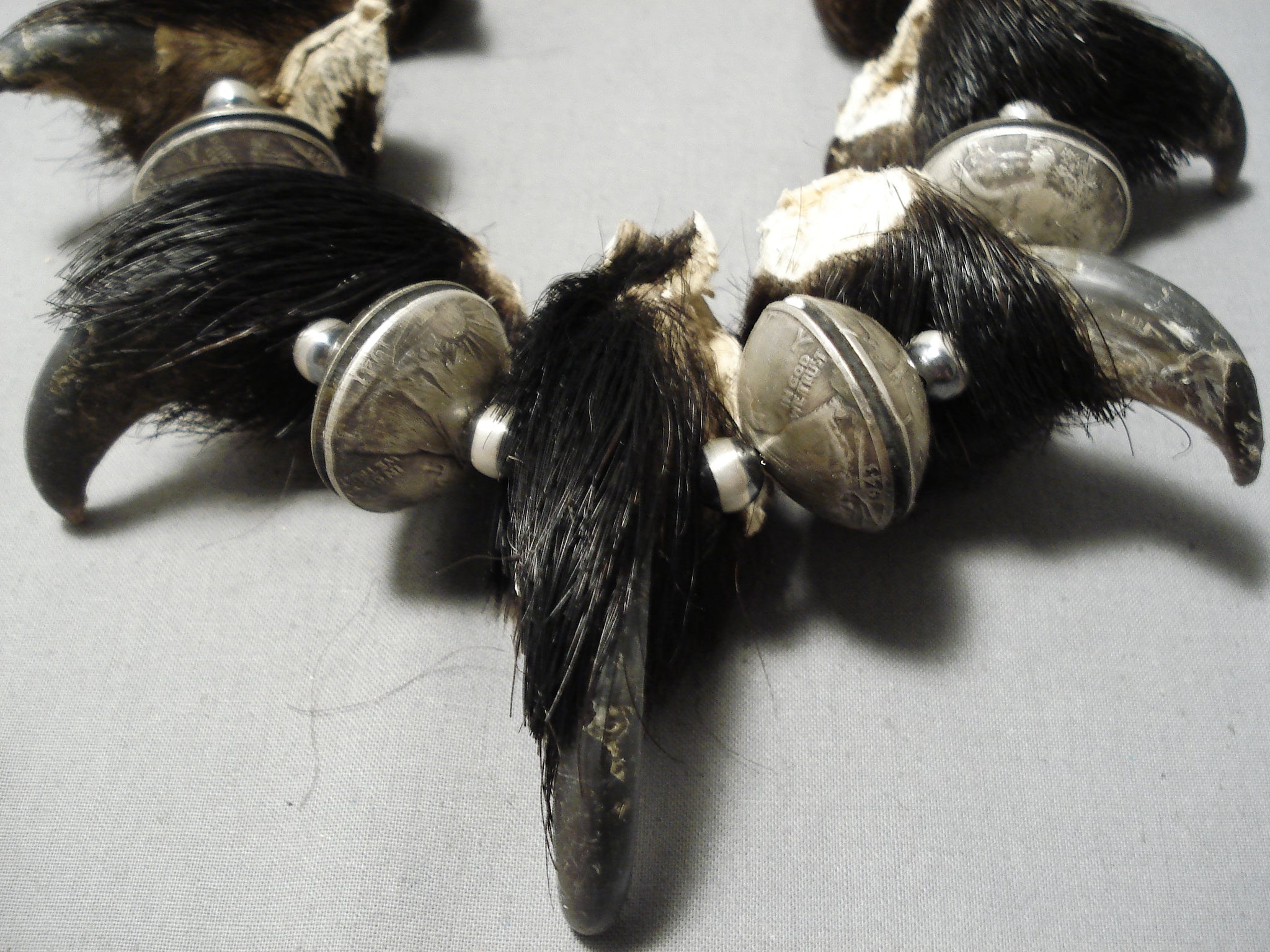 This is a magnificent vintage Navajo bear silver squash blossom necklace. This outstanding piece contains remarakble hand tooled silver coins that graduate with the largest measuring around 1" in diameter. This is an authentic piece and is compeltely hand tooled with a traditional silver clasp. Sterling silver. Cir. Mid century . The length of the necklace measures around 28". Sturdy 337 grams.