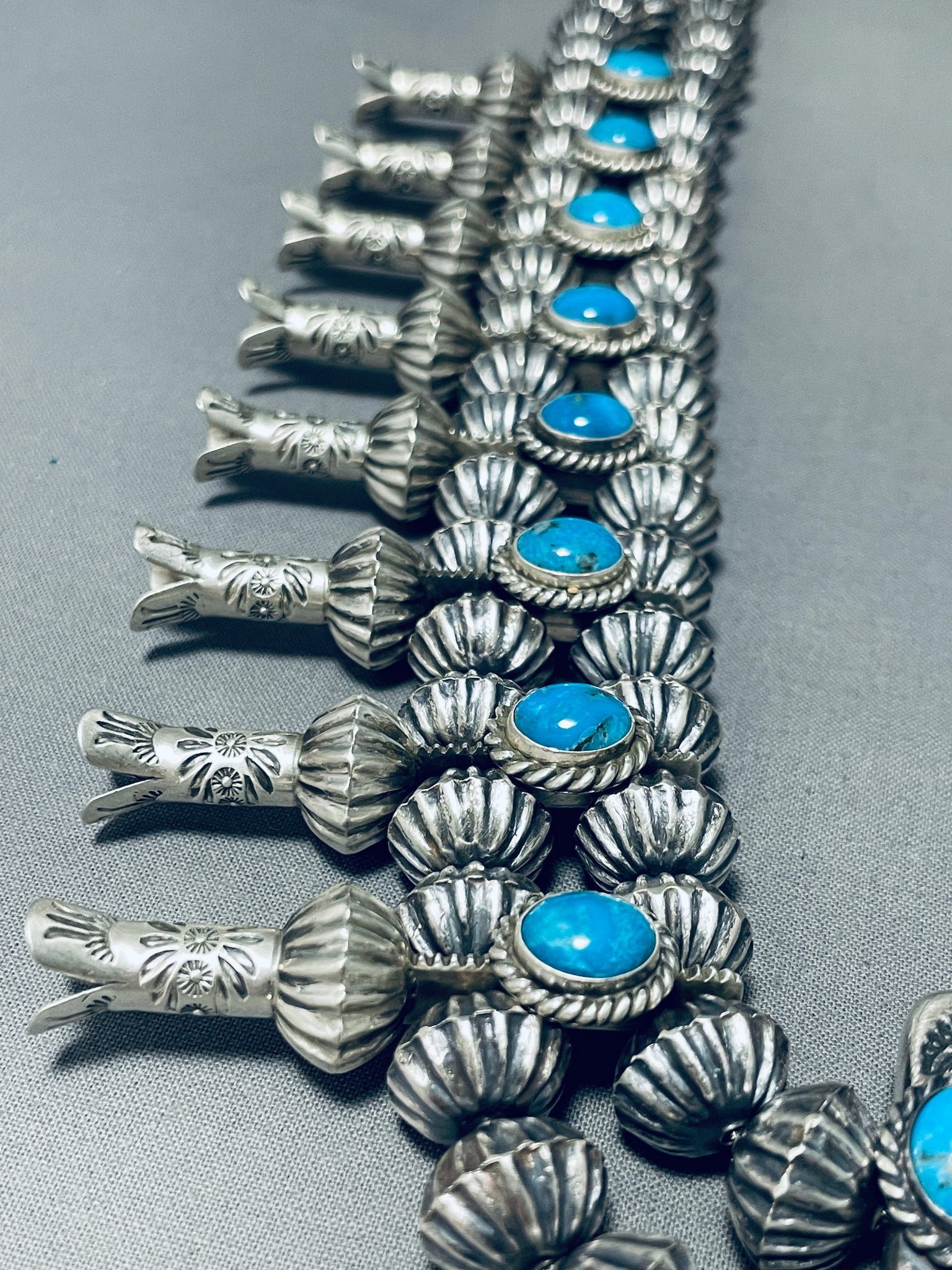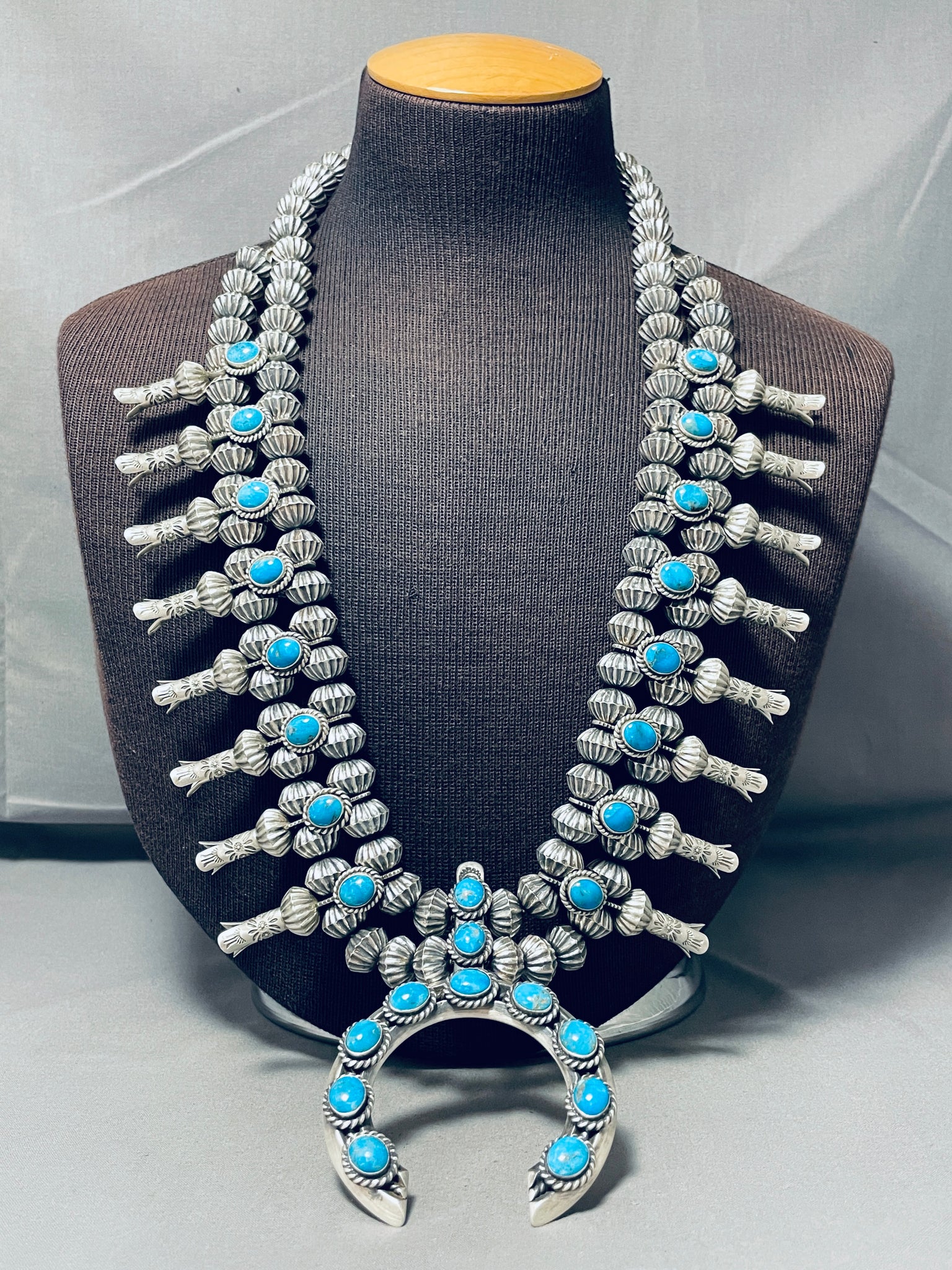 364 Gram Statement Native American Navajo Turquoise Sterling Silver Squash Blossom Necklace