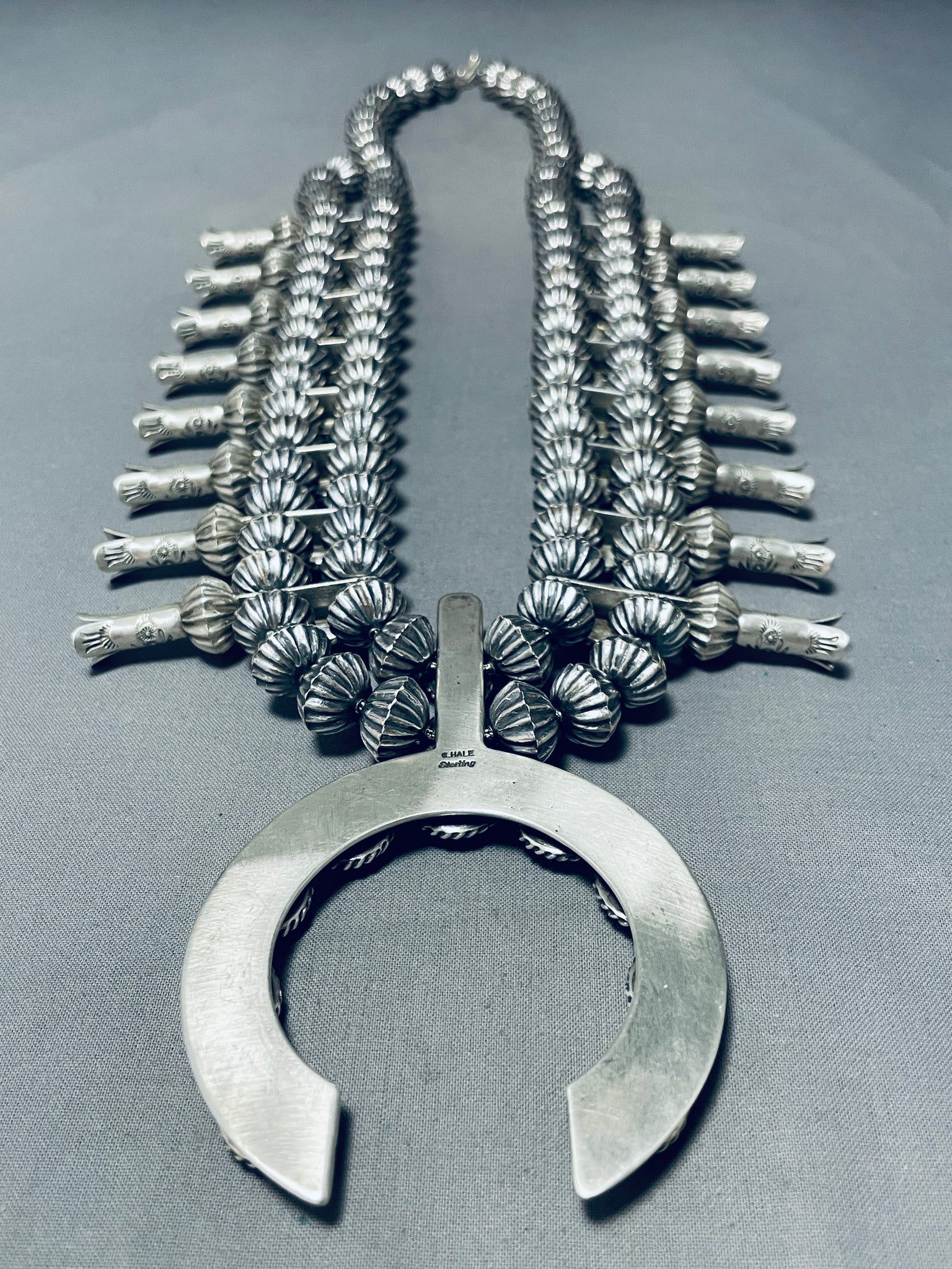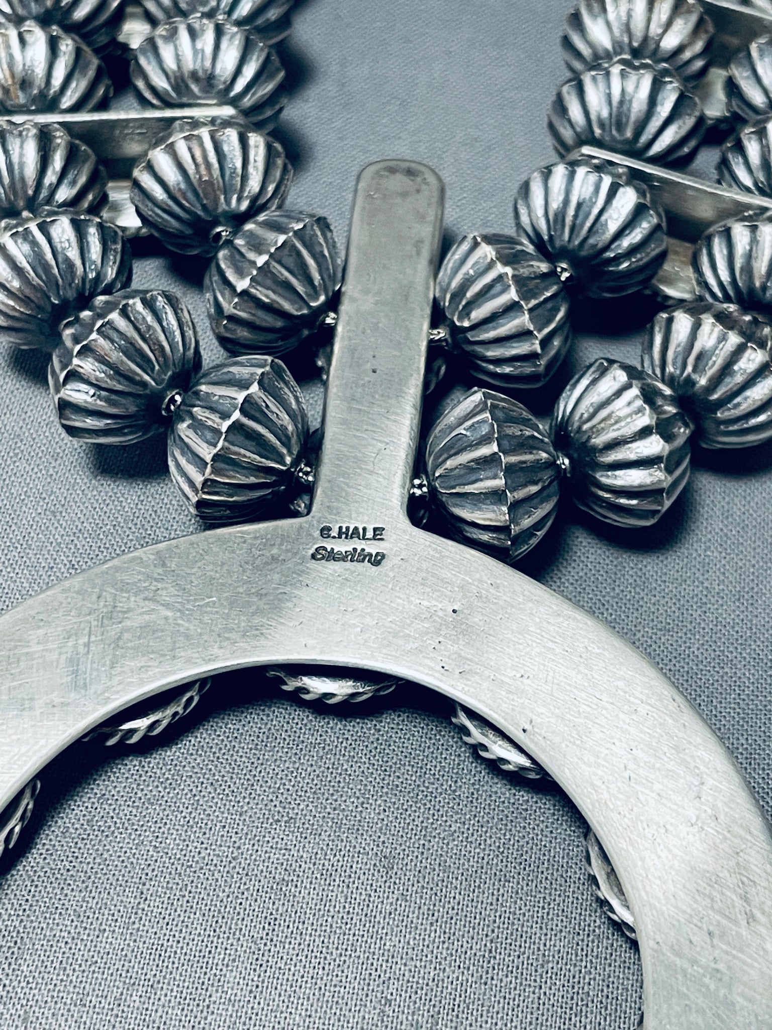 This is an astonishing vintage Navajo turquoise large silver squash blossom necklace. This impeccable necklace contains a beautiful plethora, a total of 27, of hand cut oval shaped Morenci turquoise stones that each measure around 3/8" X 1/4". Surrounding each stone are thick silver ropes. The very thick and sturdy large triple silver shank naja pendnat measures around 4-1/4" X 2-3/4". Resting throughout the 16 large detailed silver squashes are a mind blowing plethora of large handmade hogan shaped silver beads with an end traditional silver clasp. This remarkable squash blossom necklace is absolutely phenomenal. I love how the artist made amazing flower and plant stamp works on each squash. Sterling silver, marked. Signed by Navajo artist, Chris Hale. The length of the necklace measures around 34". Sturdy 364 grams. The Navajo squash blossom necklace is a traditional piece of jewelry created by the Navajo people, who are Native American indigenous to the southwestern United States. It is a prominent and highly recognizable symbol of Navajo culture and craftsmanship. The squash blossom necklace typically consists of a string of silver beads or stones, such as turquoise, strung together with crescent-shaped "squash blossoms" made of silver. Each squash blossom resembles a flower and is often adorned with intricate silverwork, stamping, and other decorative elements. The necklace derives its name from the crescent-shaped squash blossoms, which are said to represent fertility and abundance in Navajo culture. The design is believed to have been influenced by Spanish Moorish horseshoe motifs brought to the region by Spanish colonizers. Over time, the Navajo incorporated their own artistic style and symbolism, resulting in the distinctive squash blossom necklace. Turquoise is a popular stone used in Navajo squash blossom necklaces and is highly valued for its beauty and cultural significance. It is believed to possess protective and healing properties in Navajo culture. The silver beads and other elements in the necklace also showcase the skilled craftsmanship and metalworking techniques of Navajo silversmiths. Navajo squash blossom necklaces are not only considered important cultural symbols but also highly sought-after pieces of jewelry. They are often worn on special occasions and are treasured heirlooms passed down through generations. Today, they continue to be crafted by Navajo artisans and are available in various styles, sizes, and materials to suit individual preferences.