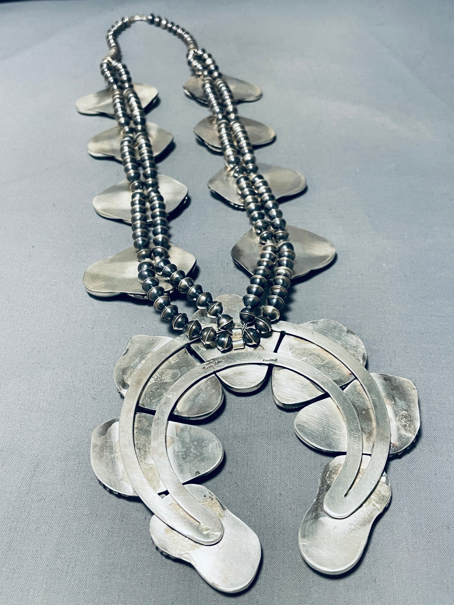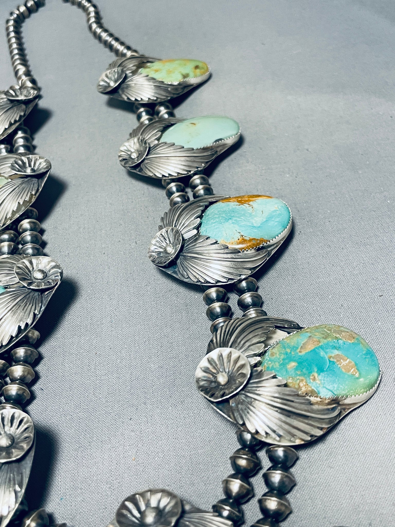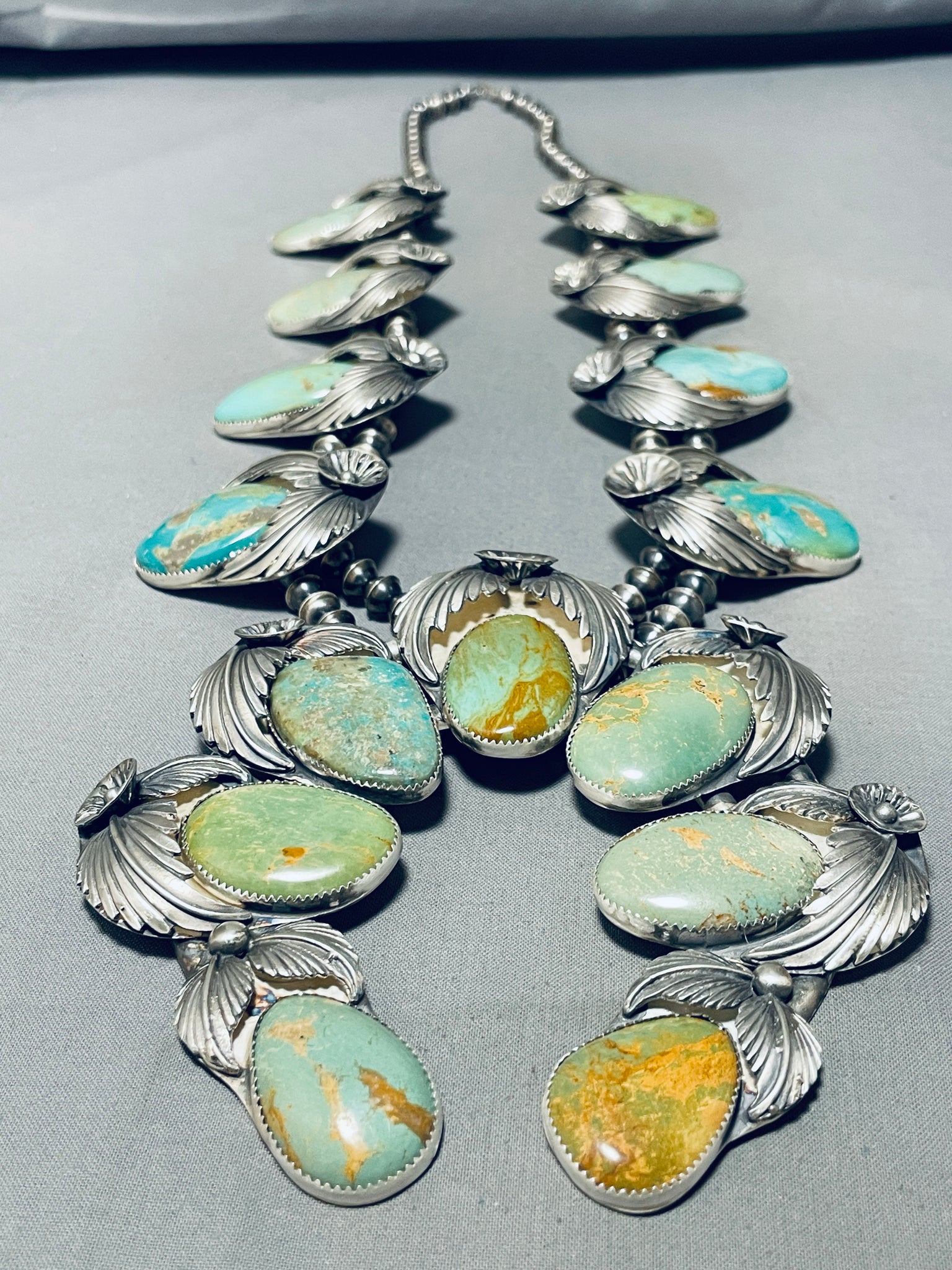 406 Grams Native American Navajo Green Turquoise Sterling Silver Squash Blossom Necklace