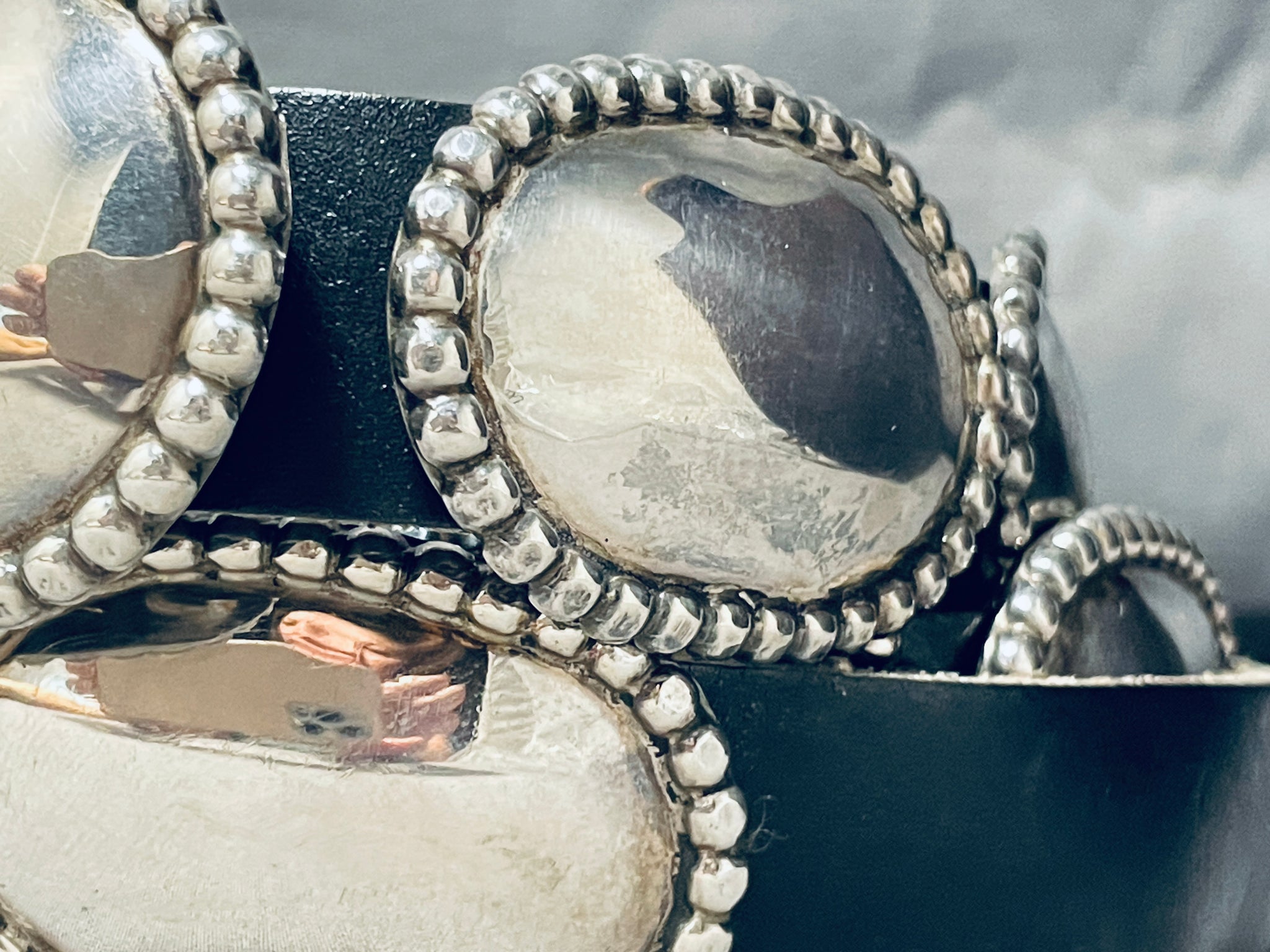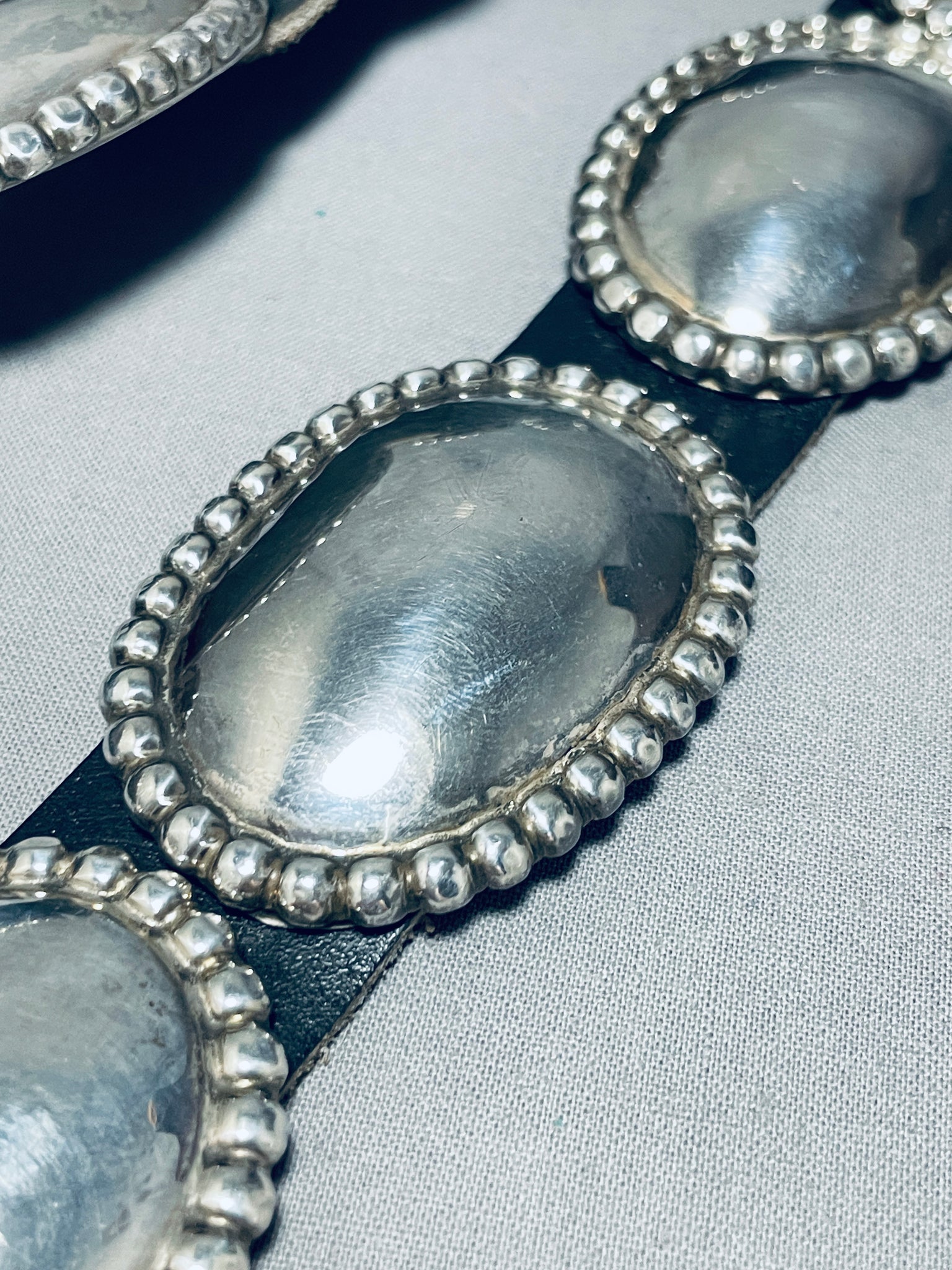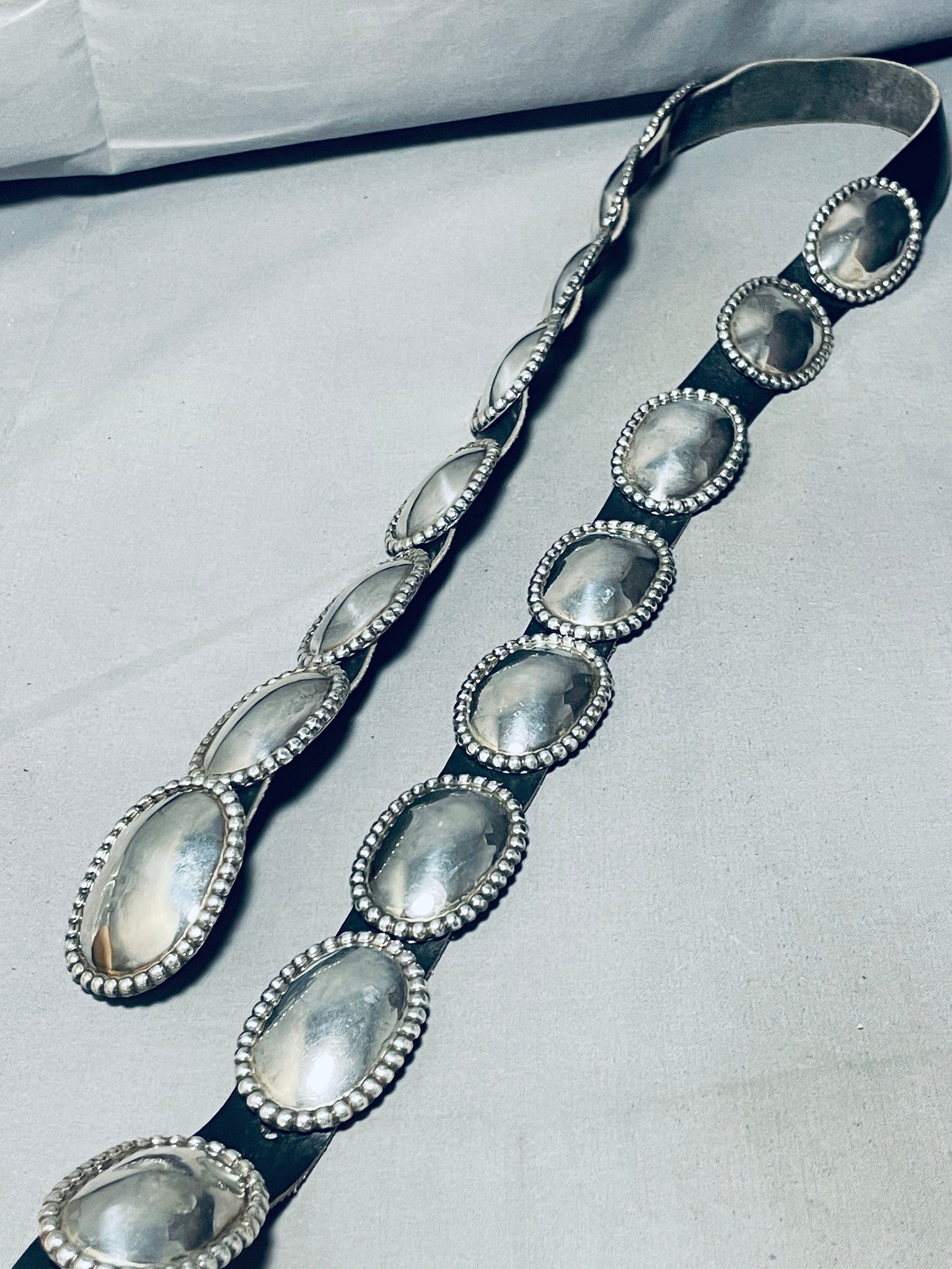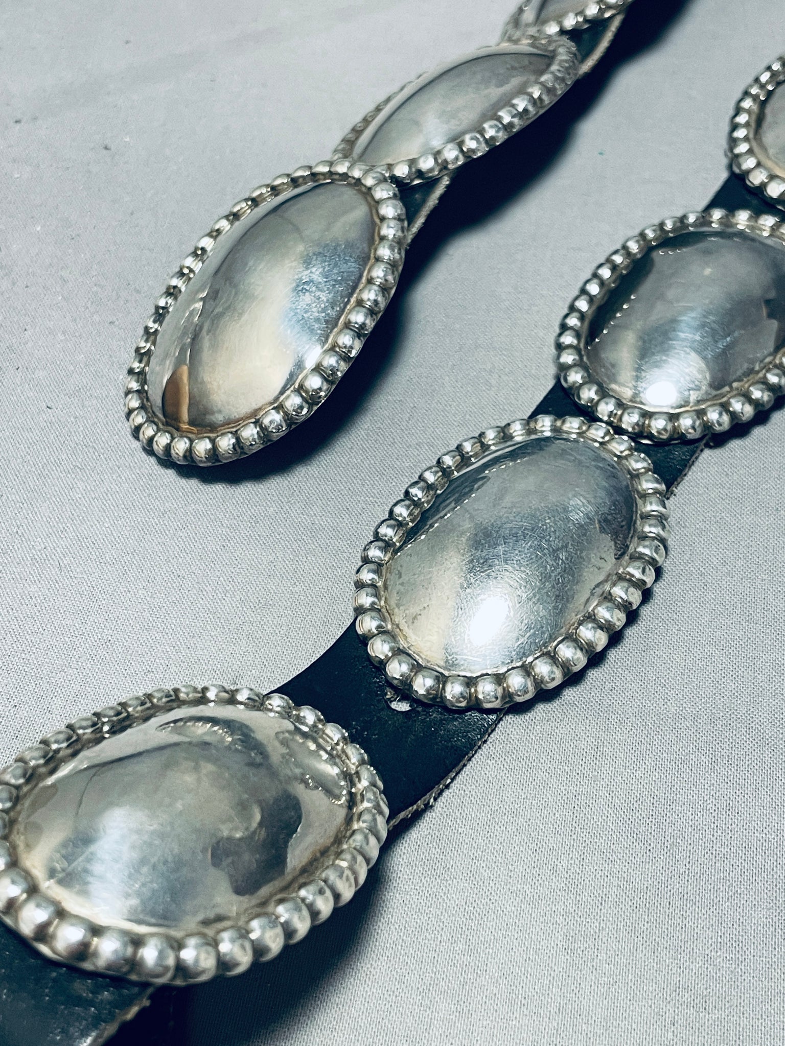 This is a tremendous vintage Navajo multiple all silver concho belt. This remarkable concho belt contains 16 outstanding all silver oval shaped silver conchos including the matching silver buckle. Each of the conchos and buckle measures around 2-1/8" X 1-1/2". The center of each concho is a beautiful mirror like section with bordering large silver raindrops. The intricacy is absolutely fascinating and so beautiful. Signed by Navajo artist, J. Wright. Sterling silver, marked. Cir. 1970's+. This belt will fit a waist size between 40" and 45". Sturdy 427 grams.