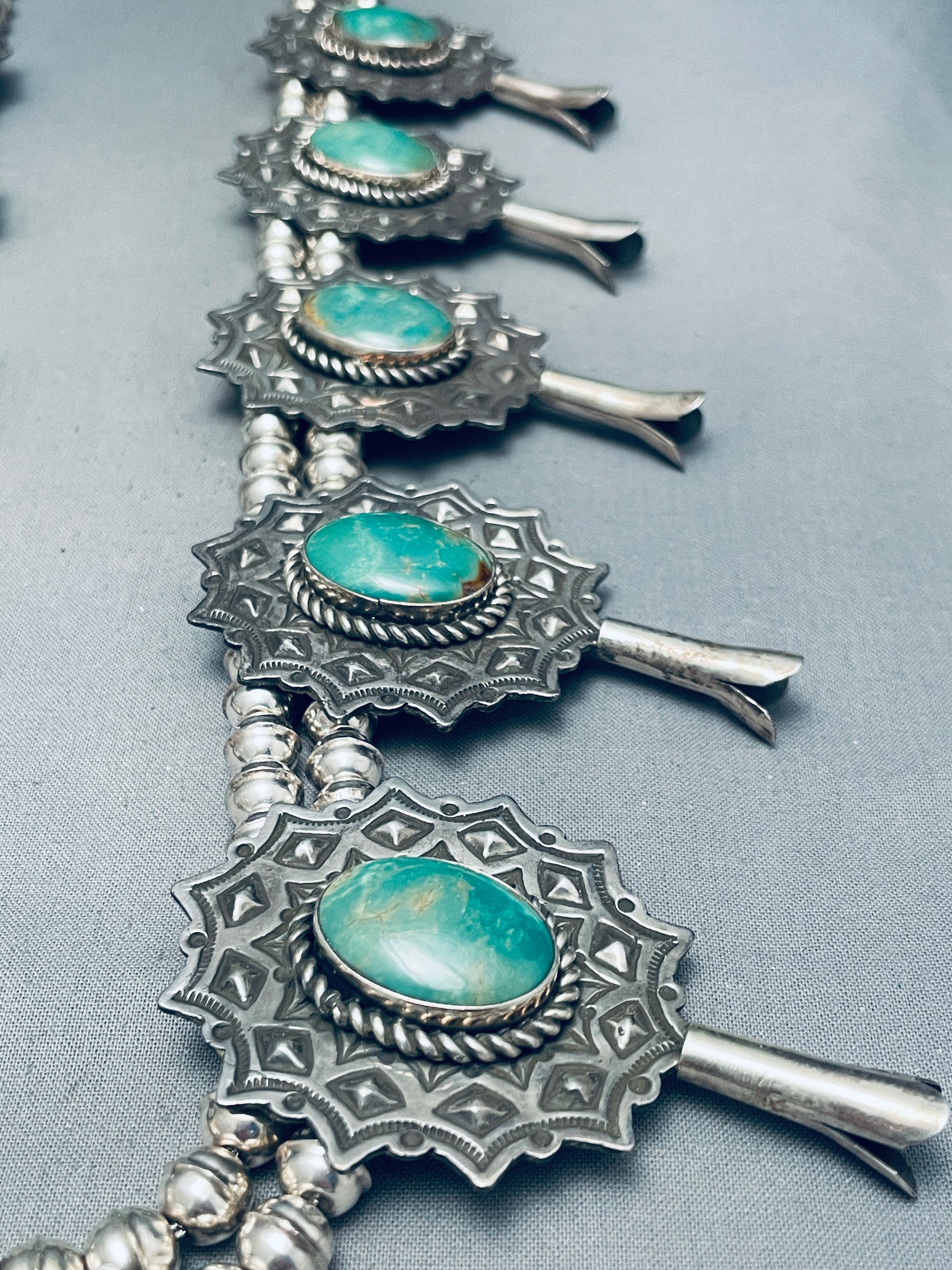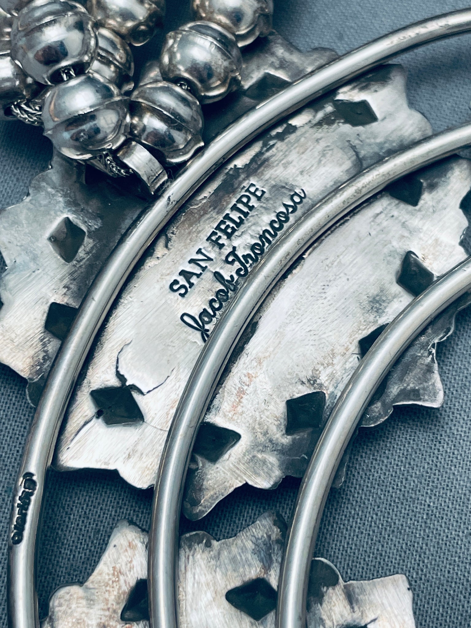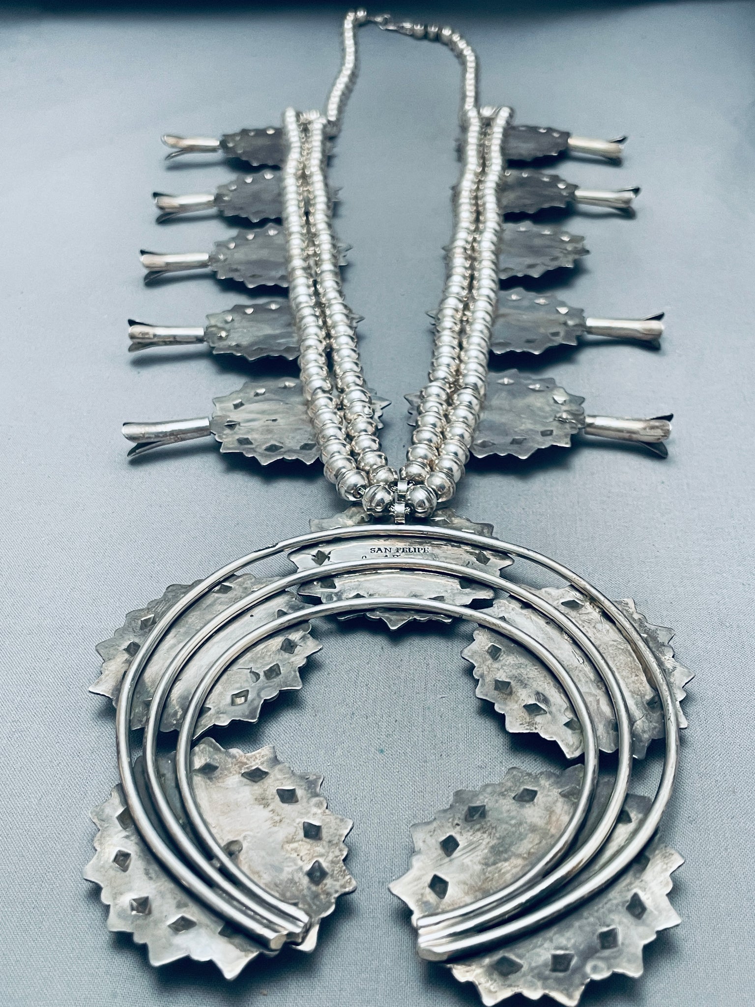This is a tremendous San Felipe very large turquoise silver squash blossom necklace. This mind blowing necklace contains such remarkable 10 large silver squashes that each measure a whopping 3" X 1-3/4". Located in the center of each squash is a beautiful oval shaped Royston turquoise stone that measures around 7/8" X 5/8". The increidble triple silver shank naja pendant at the bottom is absolutely fascinating as it contains five more amazing large silver squash pendants with five more beautiful Royston turquoise stones. The thick silver ropes that surround each stone is absolutely beautiful. Resting throughout the rest of the necklace are marvelous large handmade round silver beads with a traditional silver clasp. This squash blossom necklace is one of the largest and longest we have collected in a while, such a remarkable necklace. One of the squash pendants is however missing the silver blossom. Sterling silver, marked. Signed by San Felipe artist, Jake troncosa. The length of the necklace measures around 44". Sturdy 432 grams.