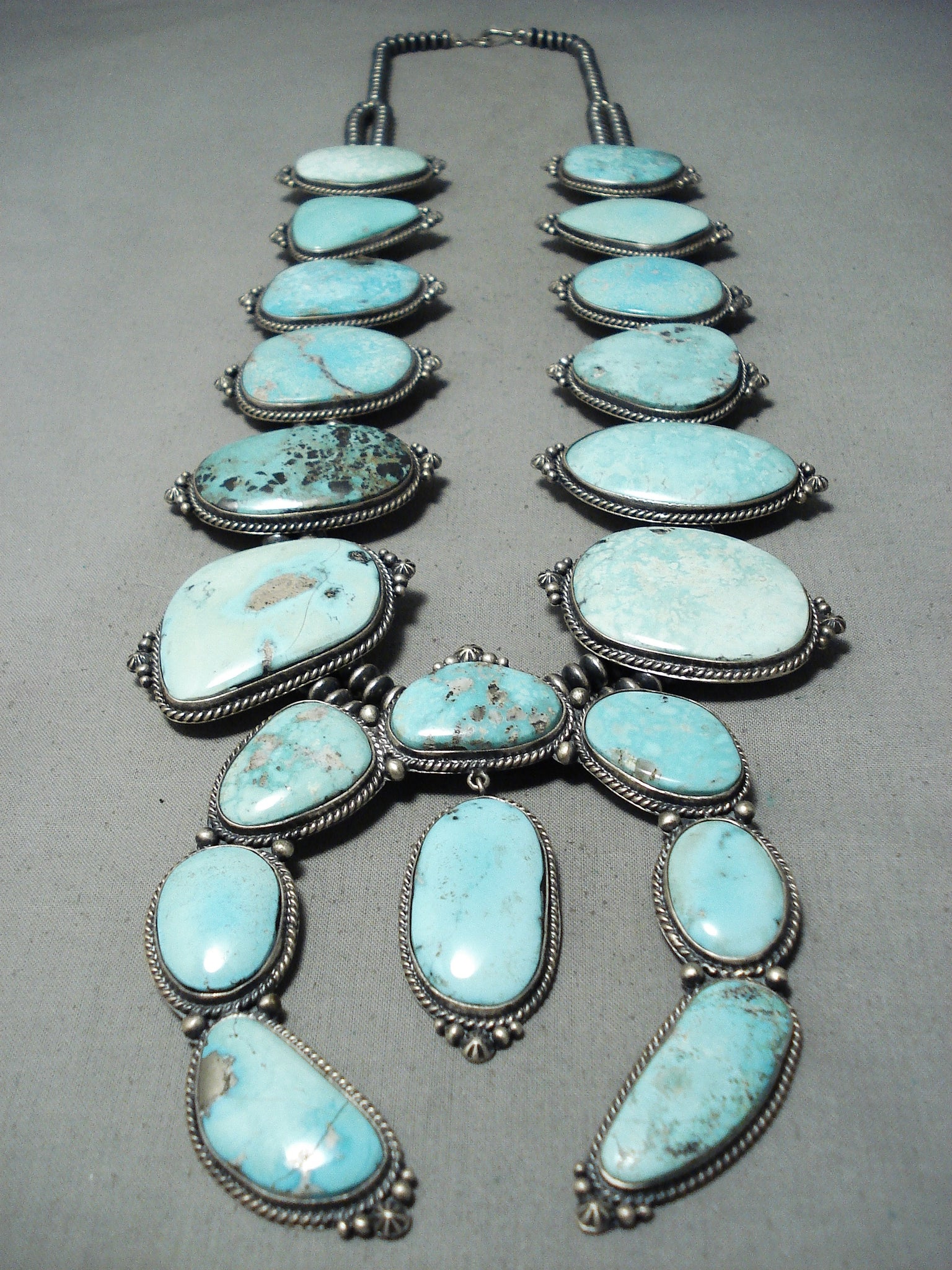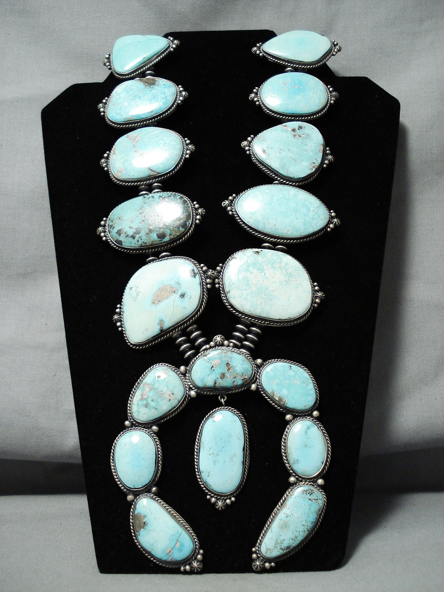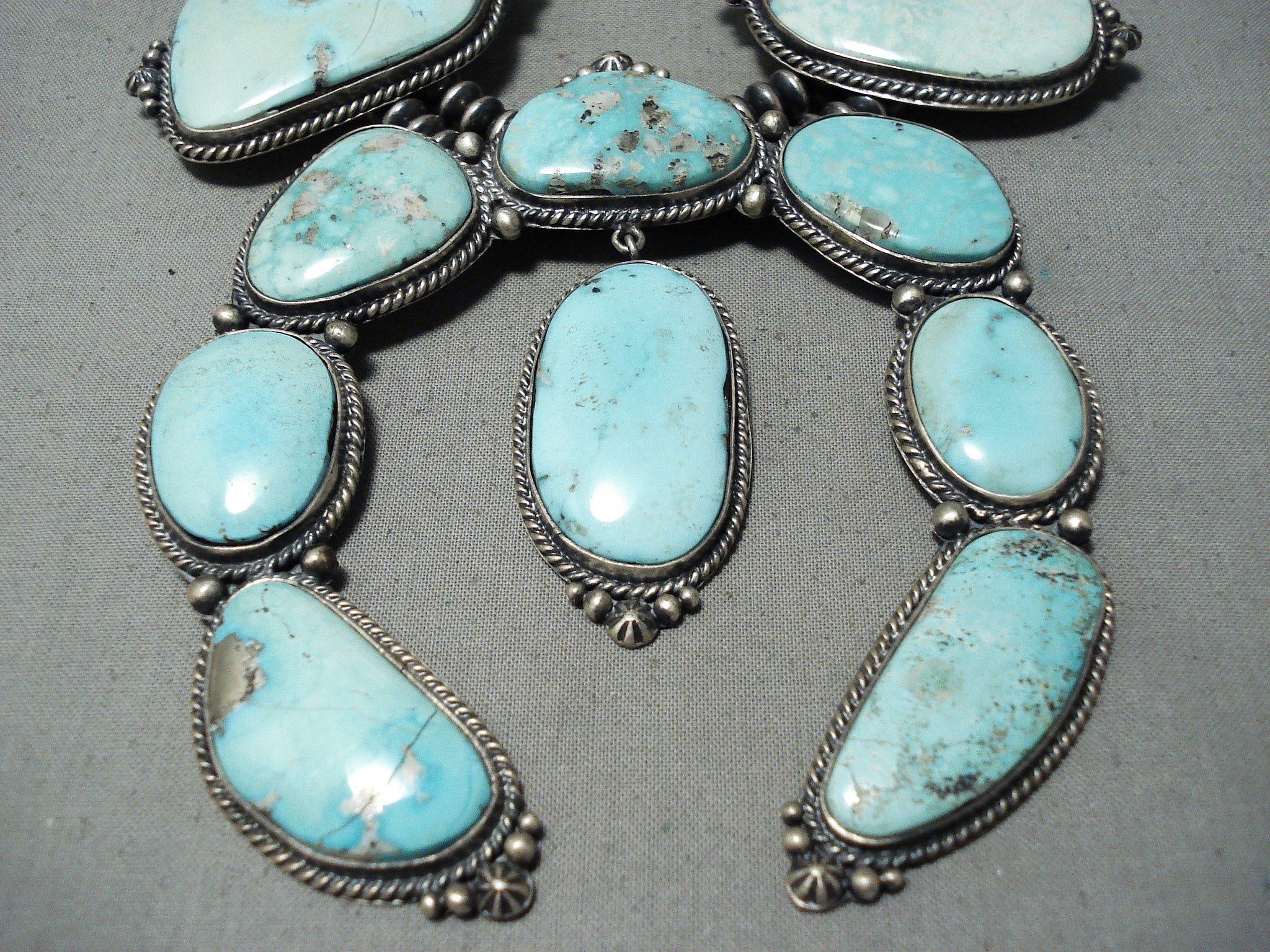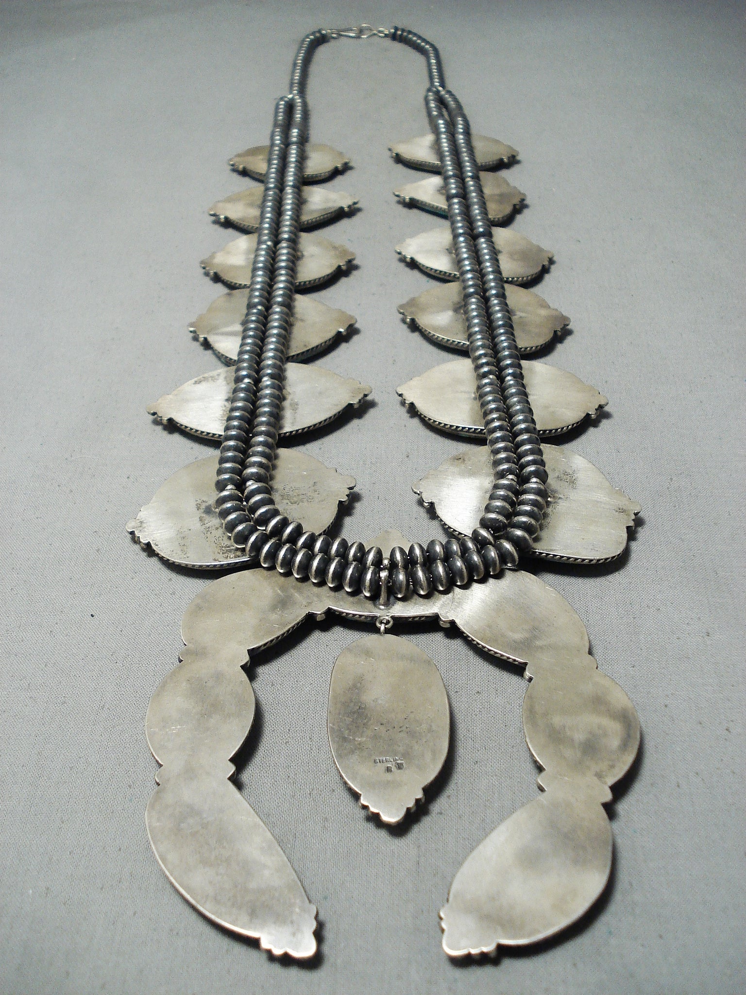 456 Grams Big Vintage Native American Navajo Turquoise Sterling Silver Squash Blossom Necklace