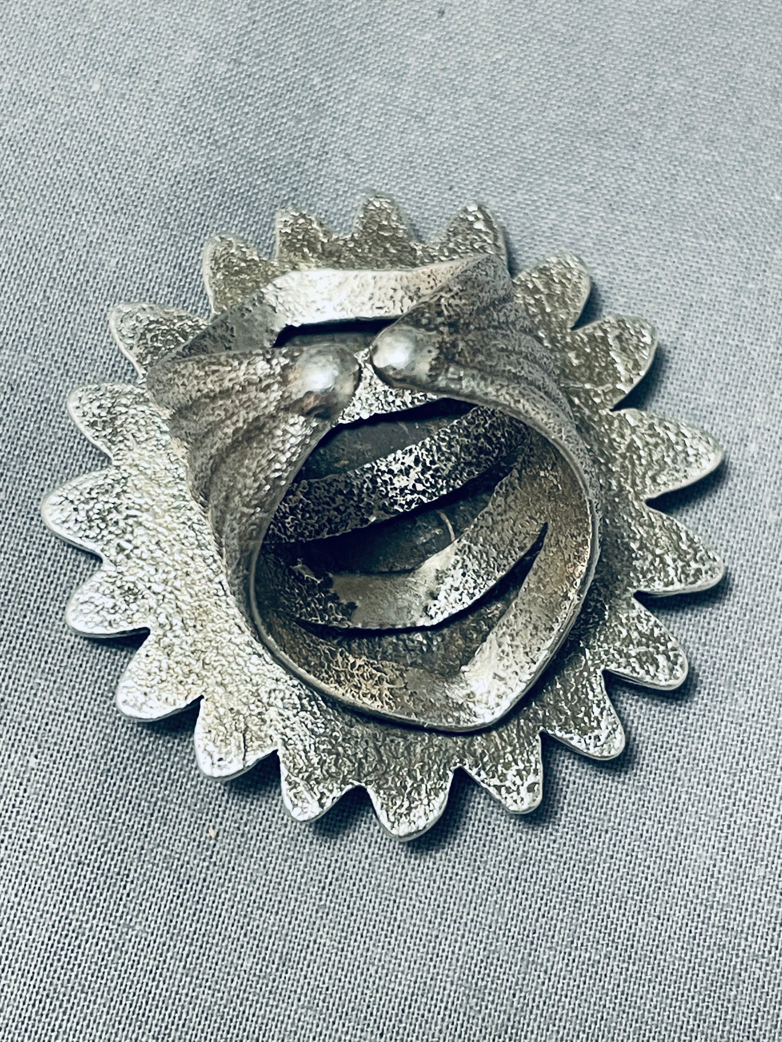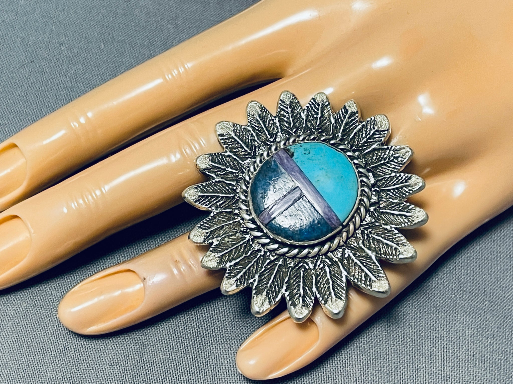 This is a remarkable Navajo very thick and large inlaid silver ring. This impressive ring is very heavy and is completely tufa casted, JUST AMAZING! Located in the center of the ring is a large inlaid rounded pattern that consists of Sleeping Beauty turquoise, denim lapis and purple spiny oyster. Surrounding the inlay is a very thick silver rope. Bursting out from the inlay are mind blowing thick and intricate hand carved silver feathers. The ring contains a phenomenal thick and sturdy five silver shank that is just marvelous and so rare. The ring face measures around 2" x 2". The ring size is around 11. . Sterling silver. Sturdy 50 grams.