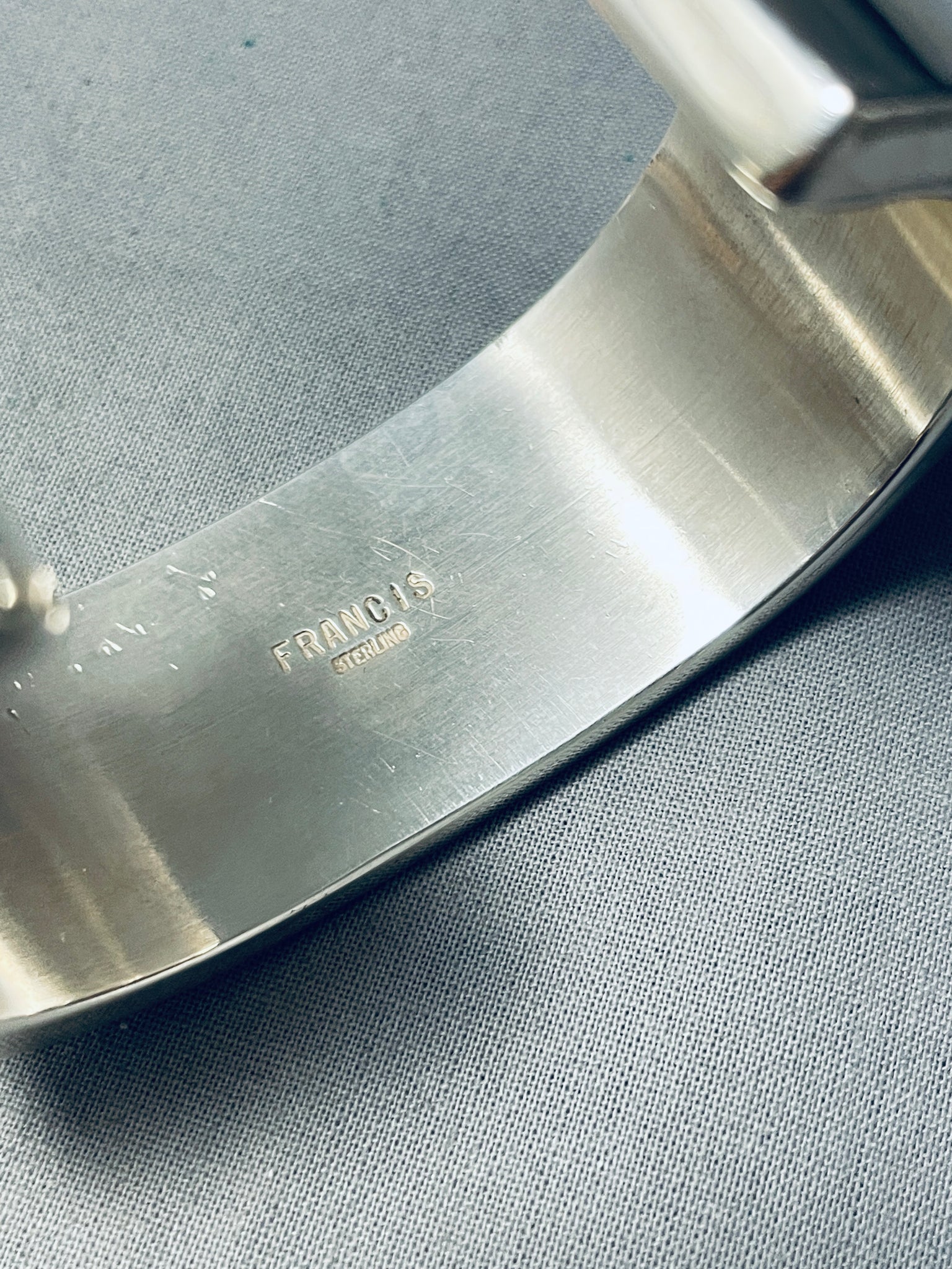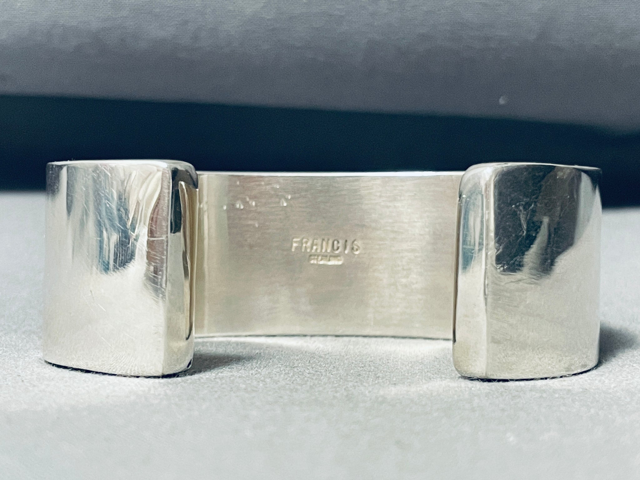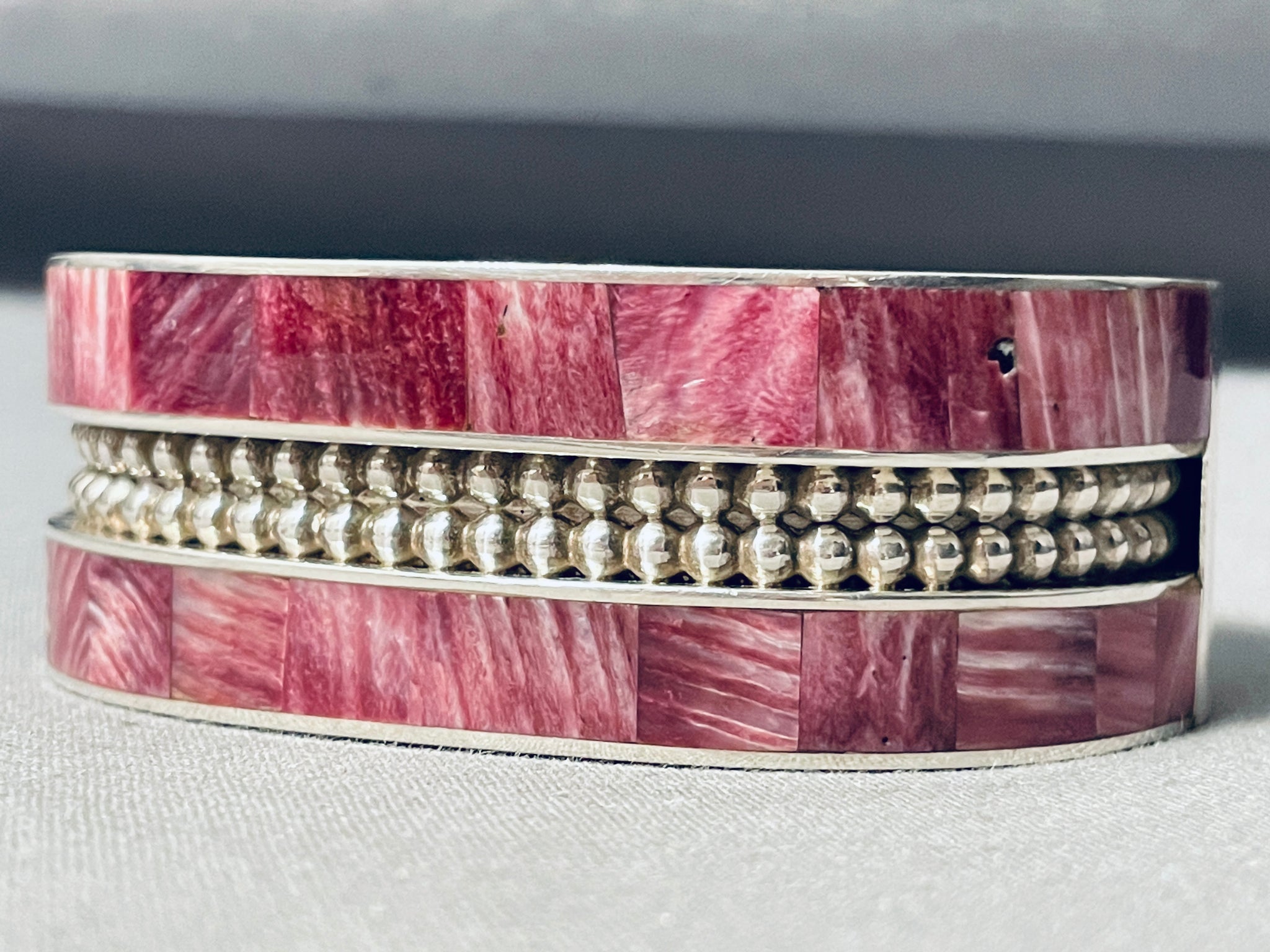Up for sale is this striking Navajo silver bracelet having 2 rows of inlay purple spiny oyster bordering central rows of silver beads on a handcarved solid silver cuff! Positively Dazzling Showpiece! The width of the bracelet measures around 1". Signed by Navajo artist, Francis. Sterling silver, marked. The inside end to end measures around 5-3/8" with an additional 1-1/4" gap. Sturdy 87 grams.