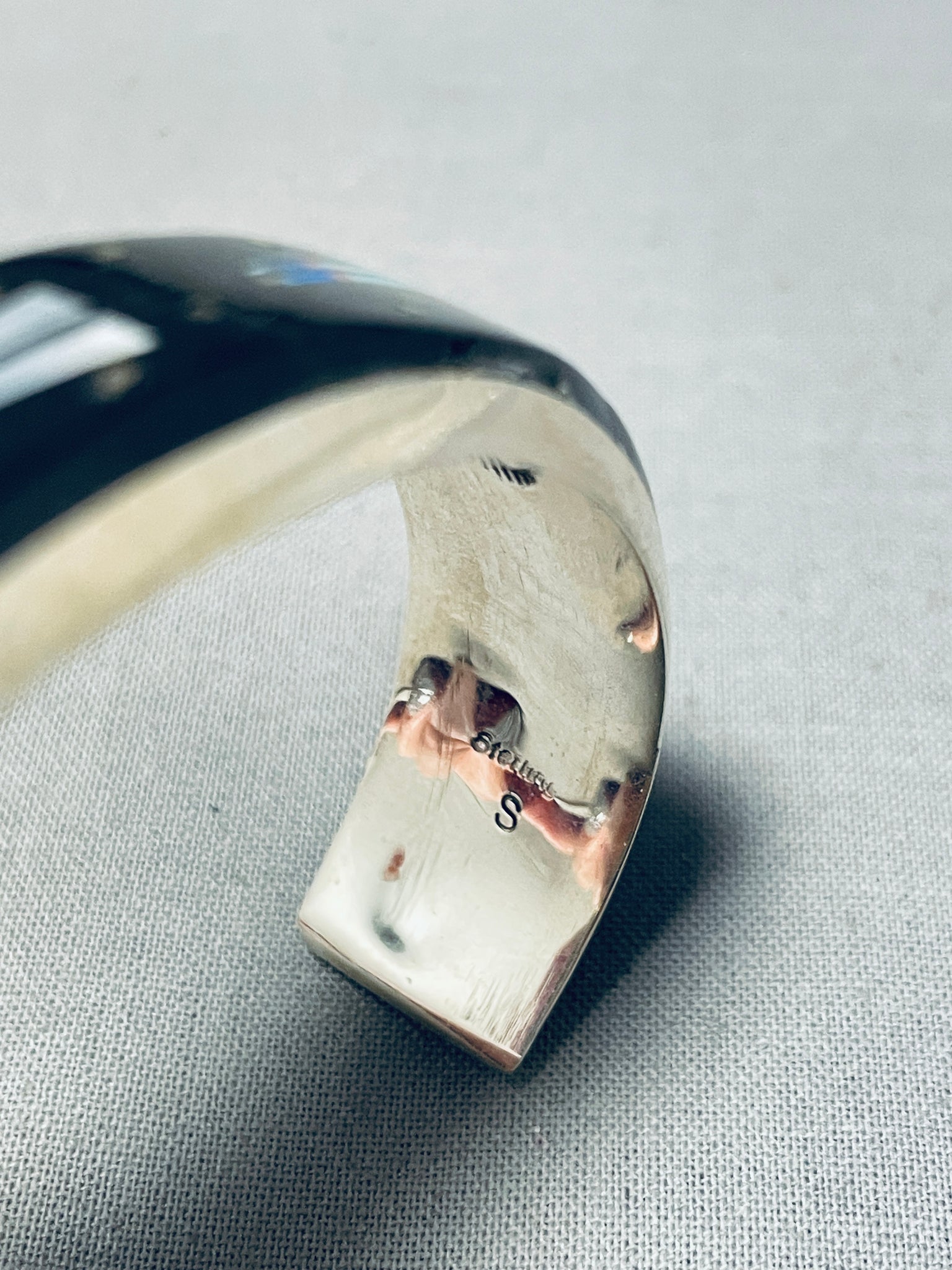 Gilbert Smith is a talented Navajo jewelry artist known for his masterful work in silver and turquoise, carrying forward the rich traditions of Navajo craftsmanship. He specializes in creating bold, intricately detailed pieces that often feature traditional Navajo techniques such as stamp work, repoussé, and overlay designs. Smith's jewelry often incorporates high-quality stones like turquoise, coral, and lapis, carefully set in sterling silver to reflect the natural beauty and cultural heritage of the Navajo people. His designs range from classic to contemporary, but they always retain a strong connection to his Navajo roots, making his work highly sought after by collectors and those who appreciate authentic Native American jewelry. Gilbert Smith's artistry continues to make a significant impact in the world of Native jewelry, preserving the traditions of his ancestors while infusing his own creative vision. The width of the bracelet measures around 5/8". Signed by Navajo artist, Gil Smith. Sterling silver, marked. The inside end to end measures around 5-1/4" with an additional 1-3/8" gap. Sturdy 26 grams.