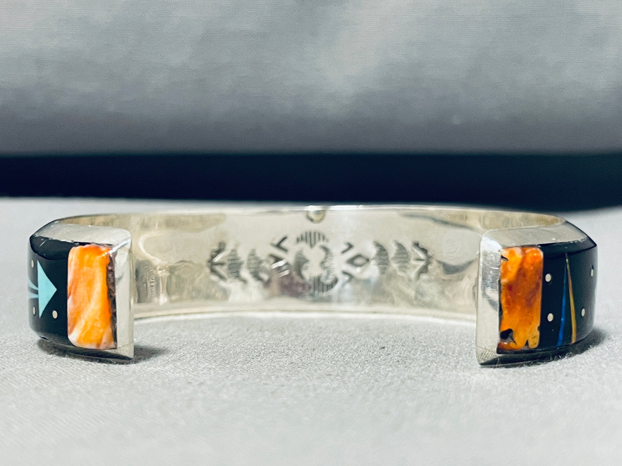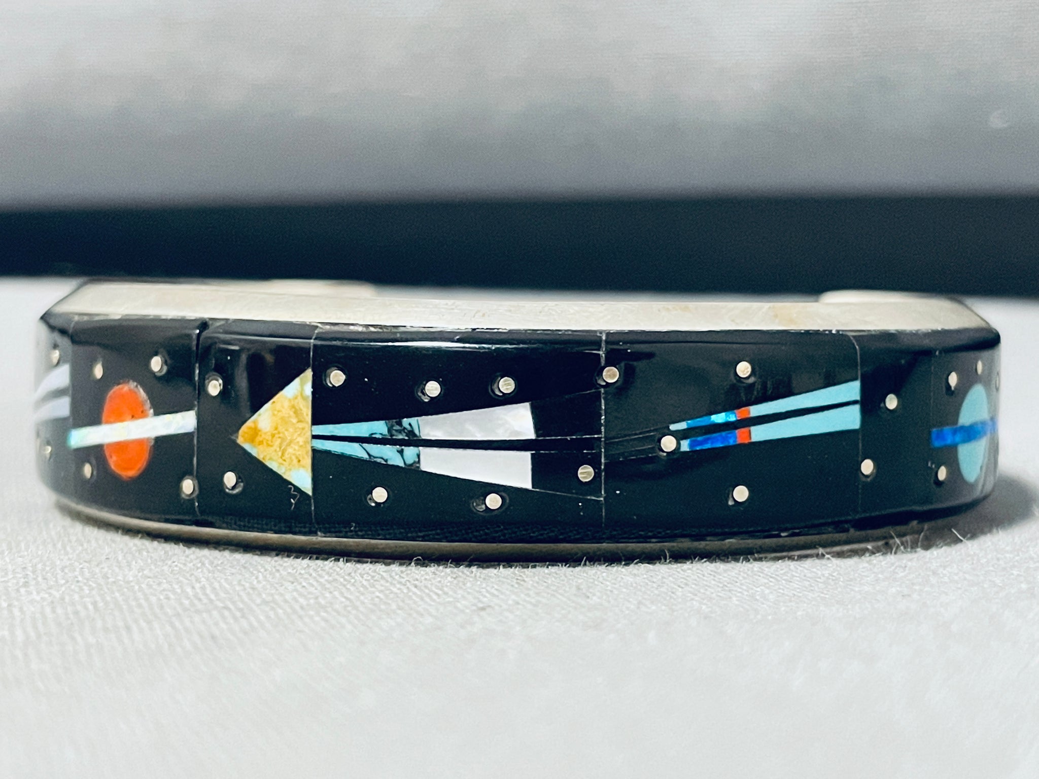 6.5 Inch Wrist Native American Navajo Turquoise Coral Jet Sterling Silver Cosmic Inlay Bracelet