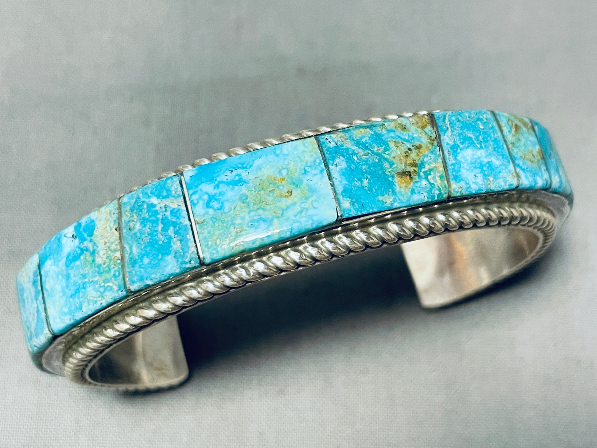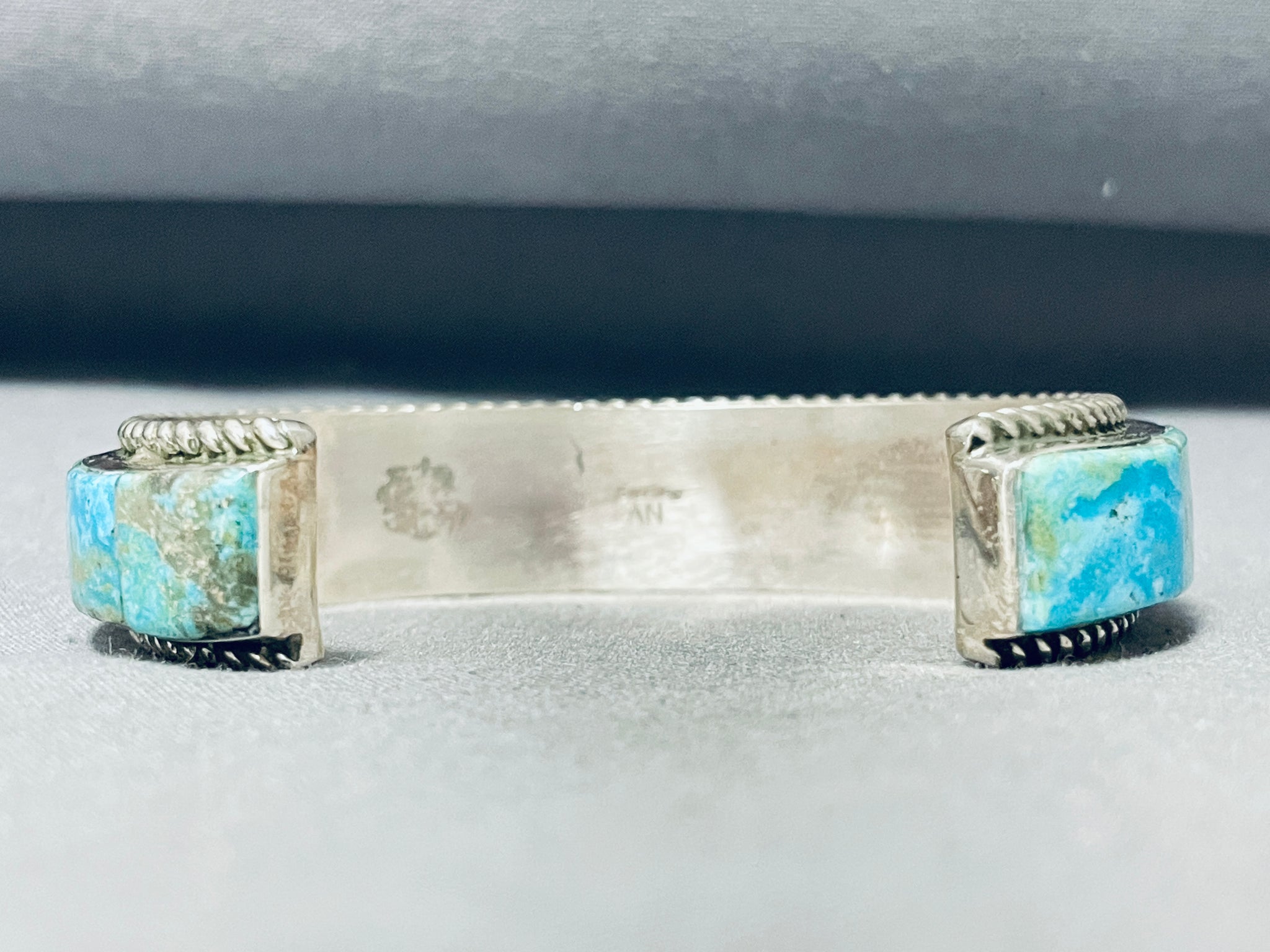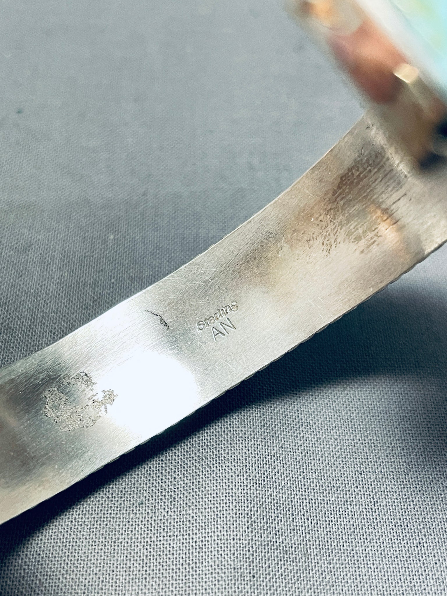 The Old Kingman turquoise mine, situated in the arid landscapes of northwestern Arizona, is a legendary source of this revered gemstone. Known for its distinctive deep blue color with dark, web-like matrix patterns, Kingman turquoise from this mine has long been cherished by Native American jewelry artisans and collectors. The mine's history traces back to ancient times, with Indigenous peoples utilizing its rich deposits for centuries. While production at the Old Kingman mine has fluctuated over the years, its turquoise remains highly sought-after, prized for its bold and vibrant appearance. Today, Old Kingman turquoise jewelry serves as a beautiful testament to the enduring legacy of this mine and its significant role in the world of Native American art and culture. The width of the bracelet measures around 5/8". Signed by Navajo artist, A.N. Sterling silver, marked. The inside end to end measures around 5-1/4" with an additional 1-1/2" gap. Sturdy 36 grams.