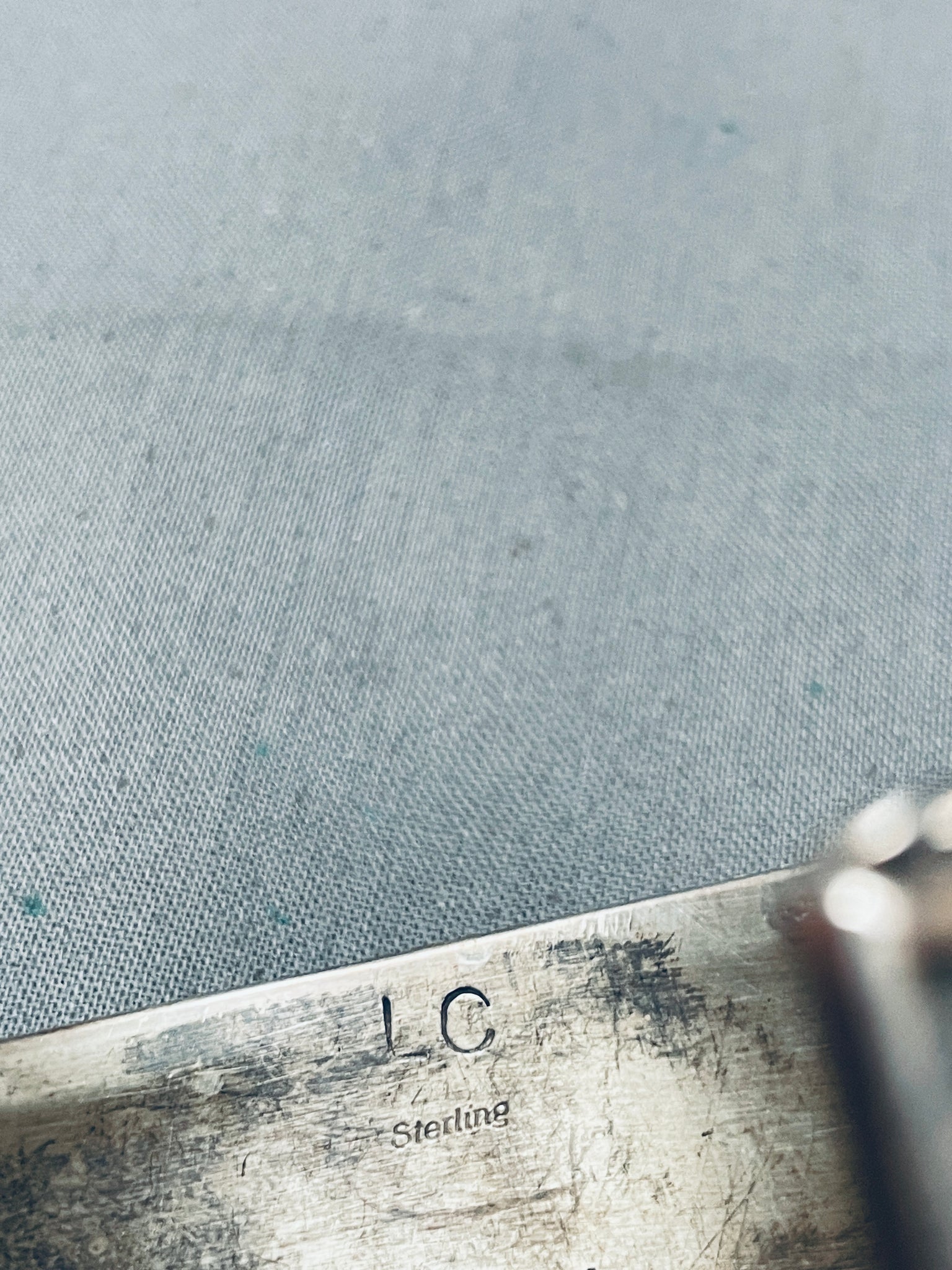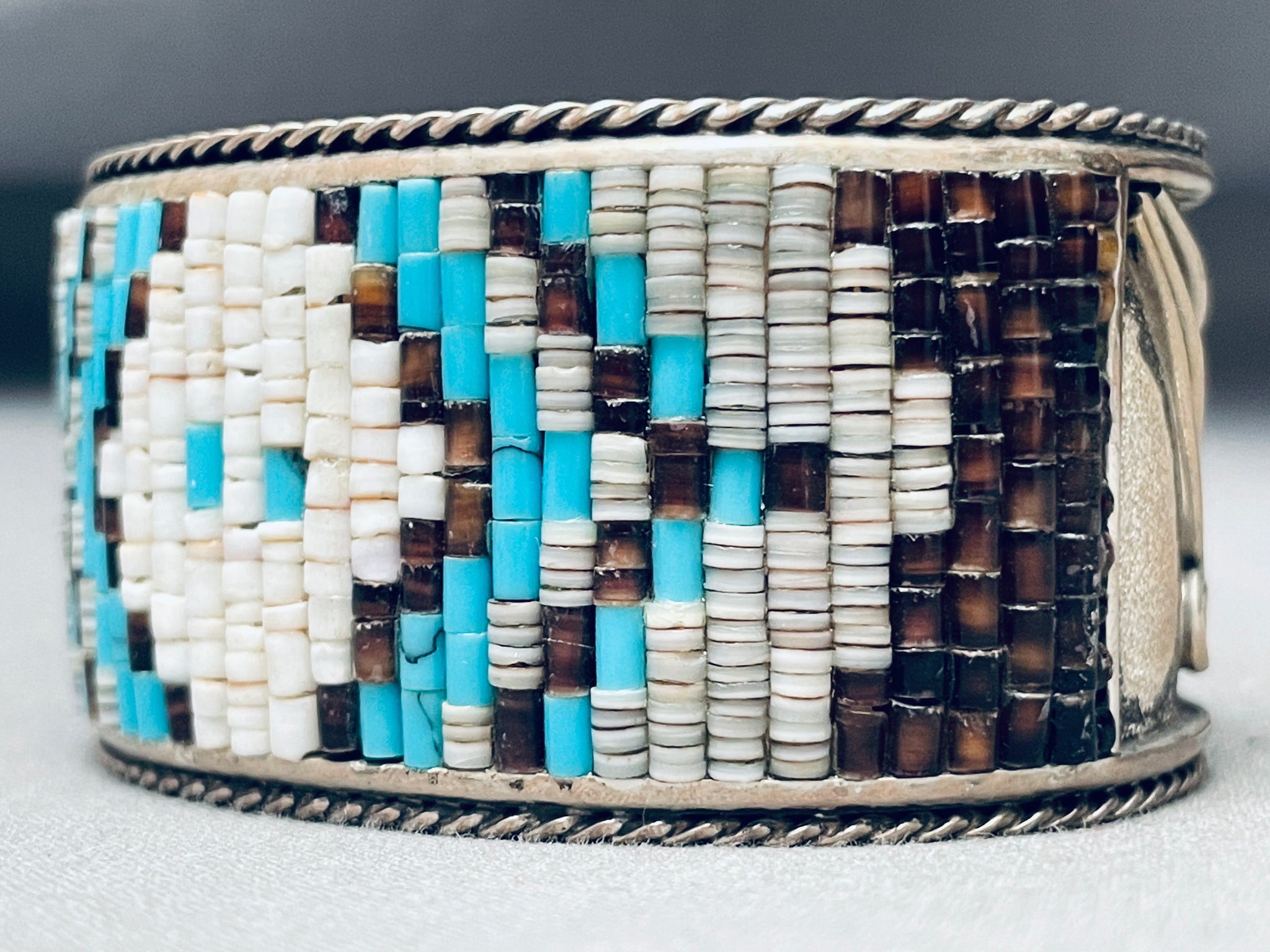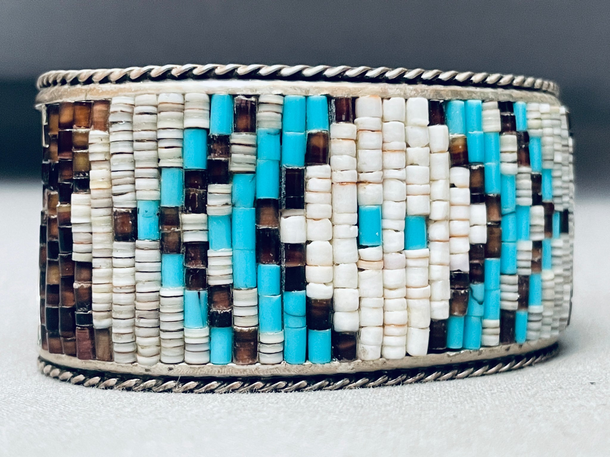 This is an incredible vintage Navajo stone heishi cuff bracelet. This phenomenal bracelet contains a marvelous plethora of hand cut gray, tan, brown and white shell heishi stones with accenting turquoise heishi stones. The stones are placed in a fabulous rug design pattern that is just outstanding. Bordering the edges of the wide silver cuff are incredible silver ropes that run from one end to the other. Resting at the ends of the cuff are astonishing swirling stem patterns with a unique textured background. The width of the bracelet measures around 1-1/4". Signed by Navajo artist, LC. Sterling silver, marked. Cir. Mid Century +. The inside end to end measures around 5-1/2" with an additional 1" gap. Sturdy 44 grams.