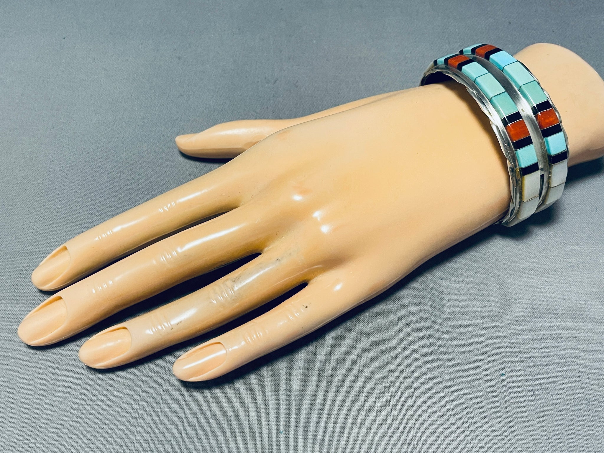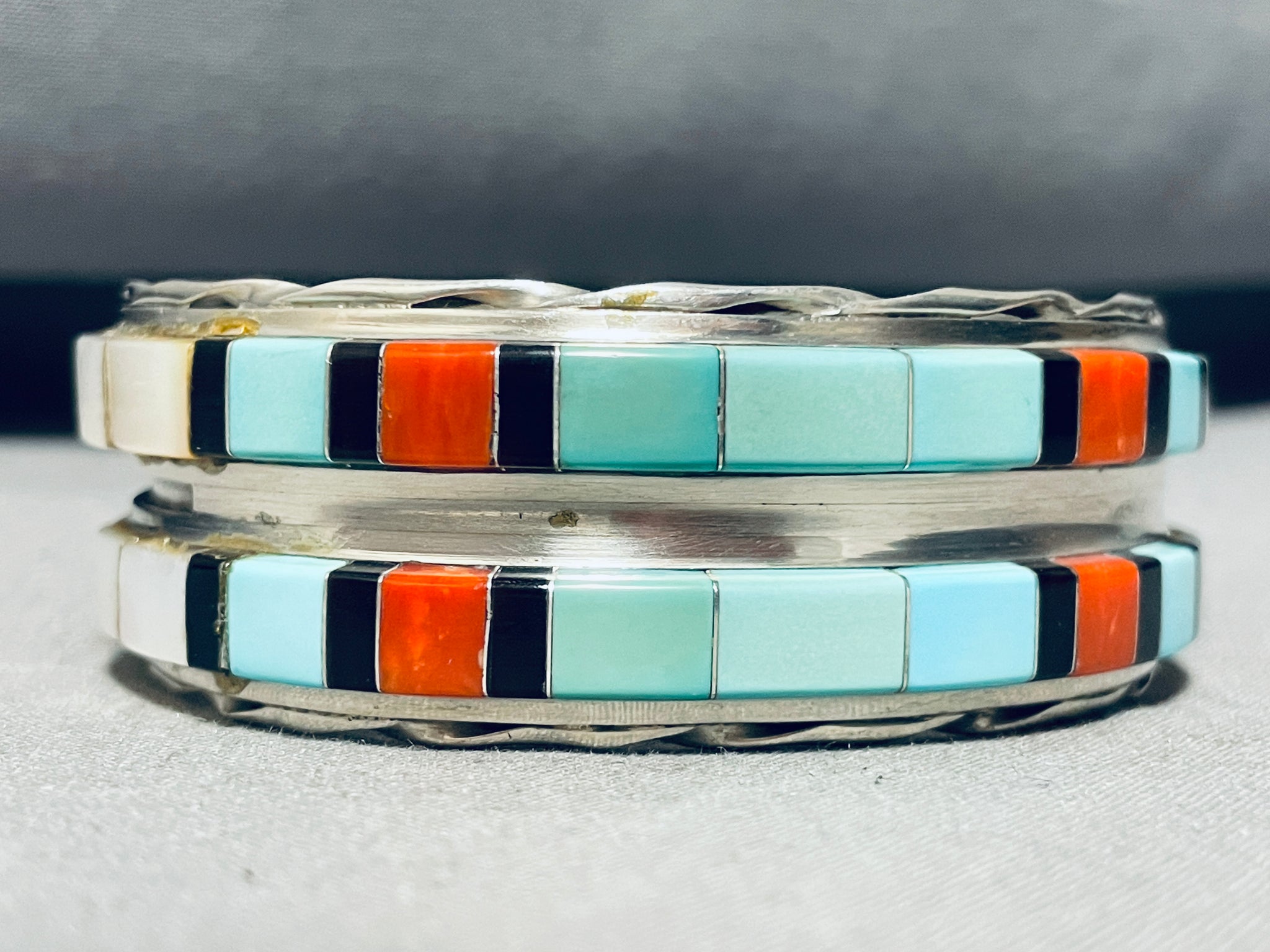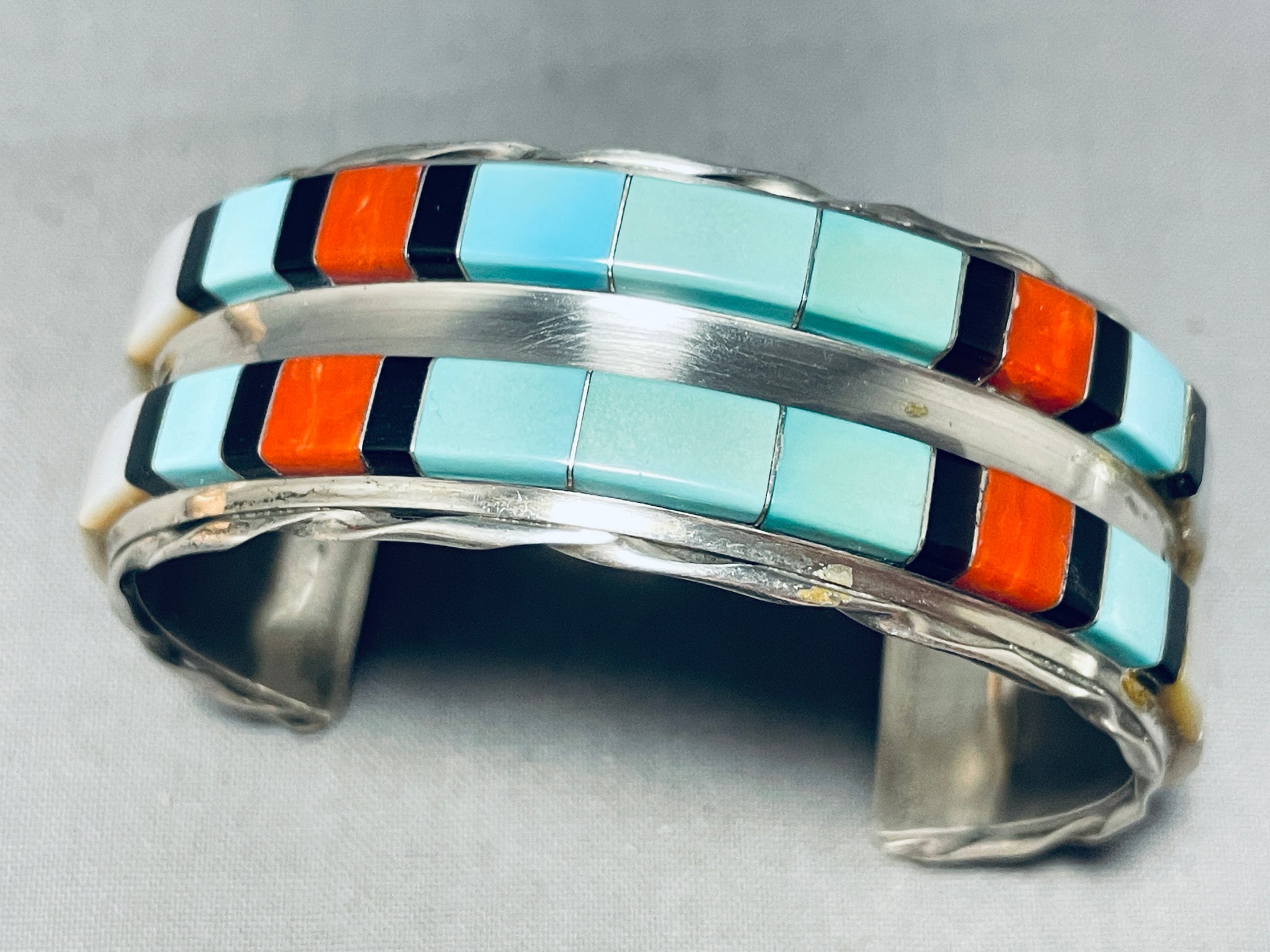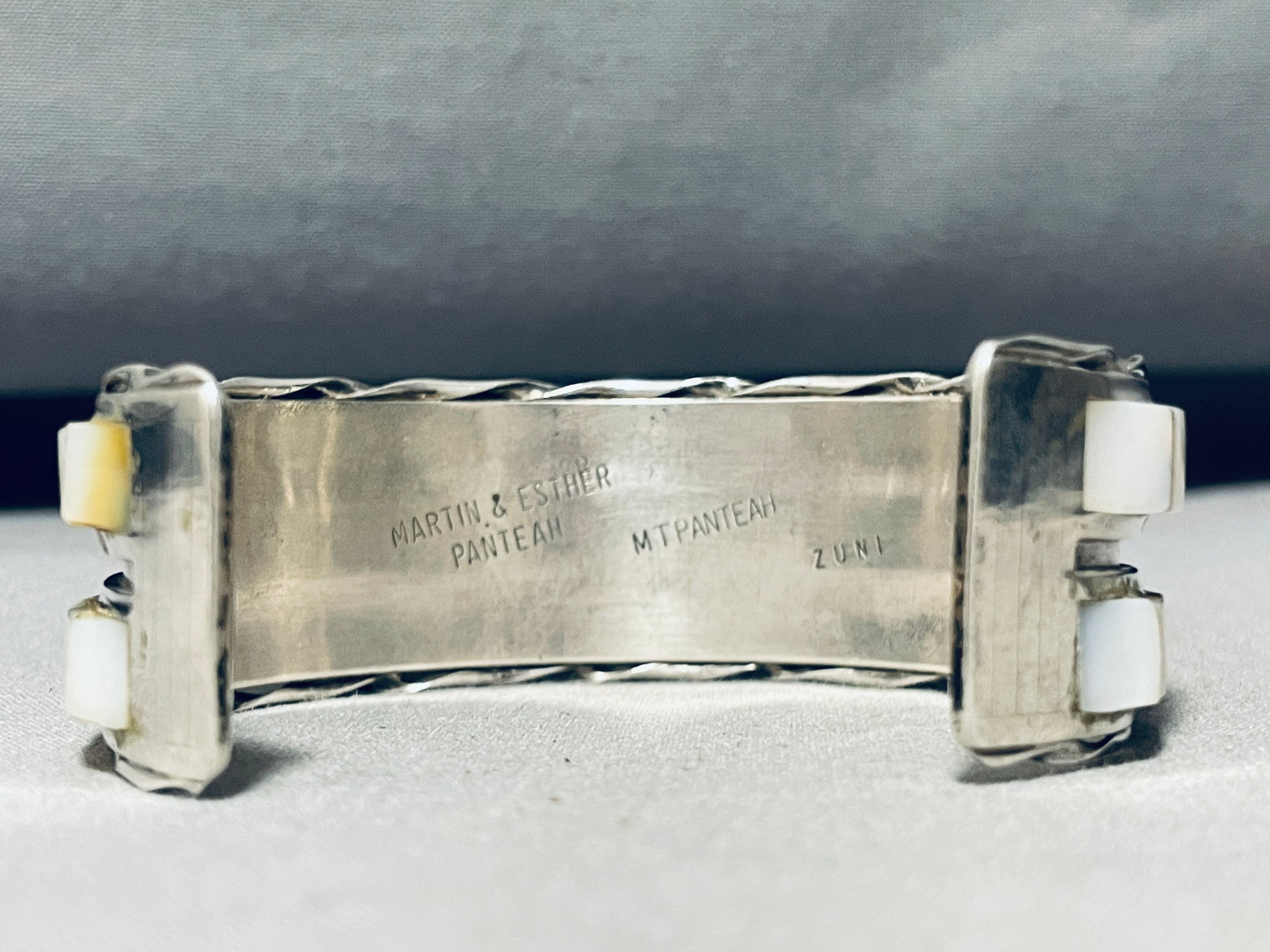 This is a magnificent vintage Zuni inlaid thick and sturdy silver cuff bracelet. This amazing bracelet contains two rows of incredible inlaid channeled stones and shells. The stones and shells beautifully protrude out from the cuff and consist of Royston turquoise, Sleeping Beauty turquoise, onyx, coral and mother of pearl. Bordering the edges of the thick and wide silver cuff are long thick silver ropes. The inlaid stones and shells beautifull wrap around the entire cuff from one end to the other. The width of the bracelet measures around 7/8". Signed by Zuni artist, Martin & esther Panteah. Sterling silver. Cir. 1970's+. The inside end to end measures around 5-1/4" with an additional 1-1/2" gap. Sturdy 44 grams.