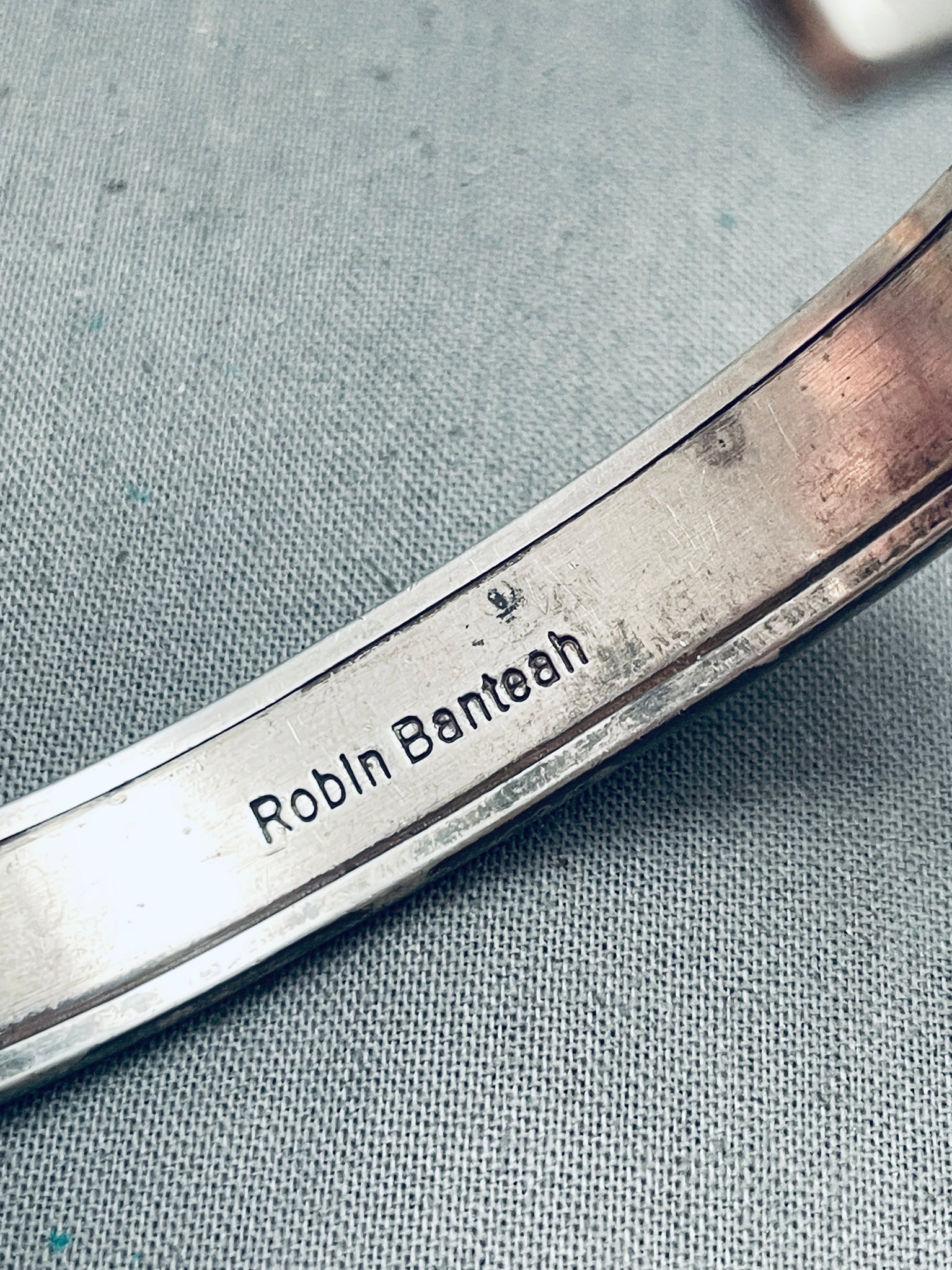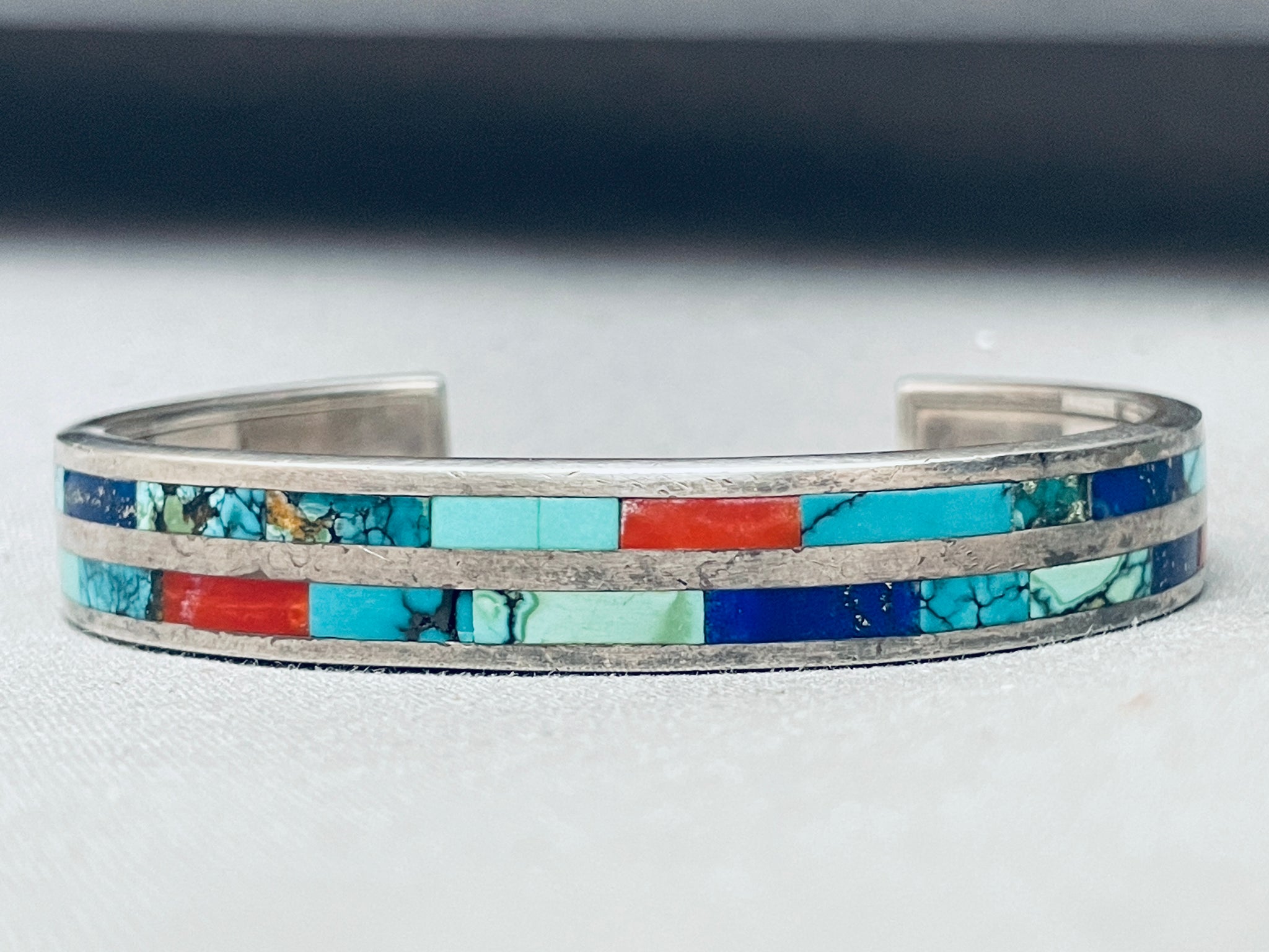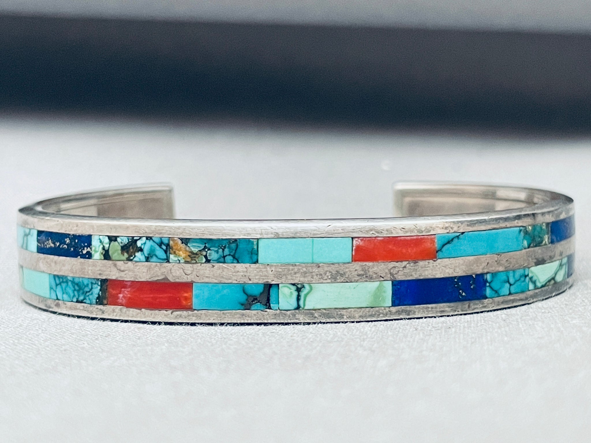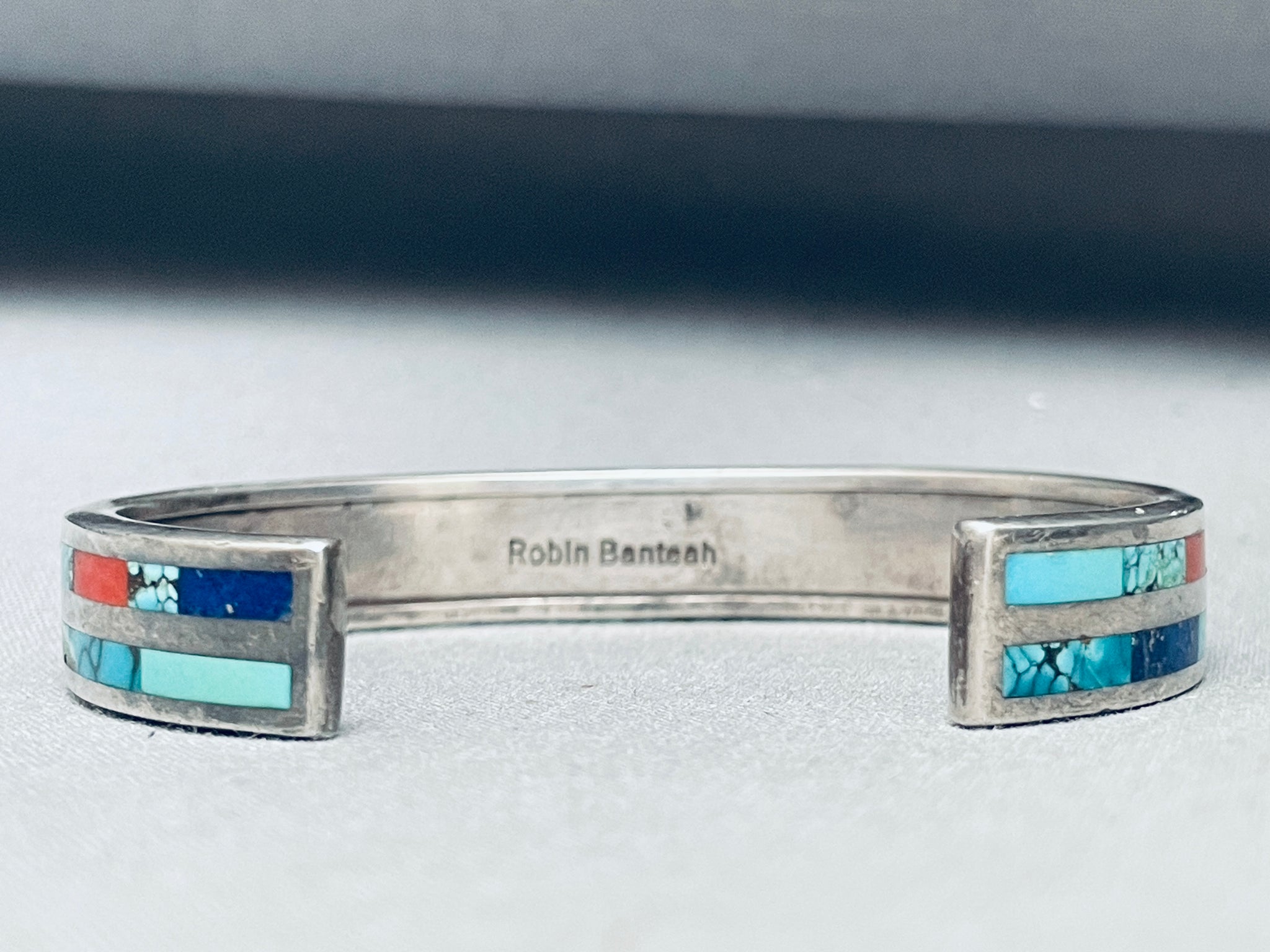 This is a superior vintage Zuni inlaid thick silver cuff bracelet. This remarkable bracelet contains two rows of beautiful inlaid stones and shells that consist of lapis, coral, Blue Gem turquoise, and Lone Mountain turquoise. The thickness of this bracelet is just fascinating. The way that the inlay completely wraps around the entire cuff is just marvelous. The width of the bracelet measures around 3/8". Signed by Zuni artist, Robin Banteah. Sterling silver. Cir. 1970's+. The inside end to end measures around 5-1/2" with an additional 1-1/4" gap. Sturdy 39 grams.