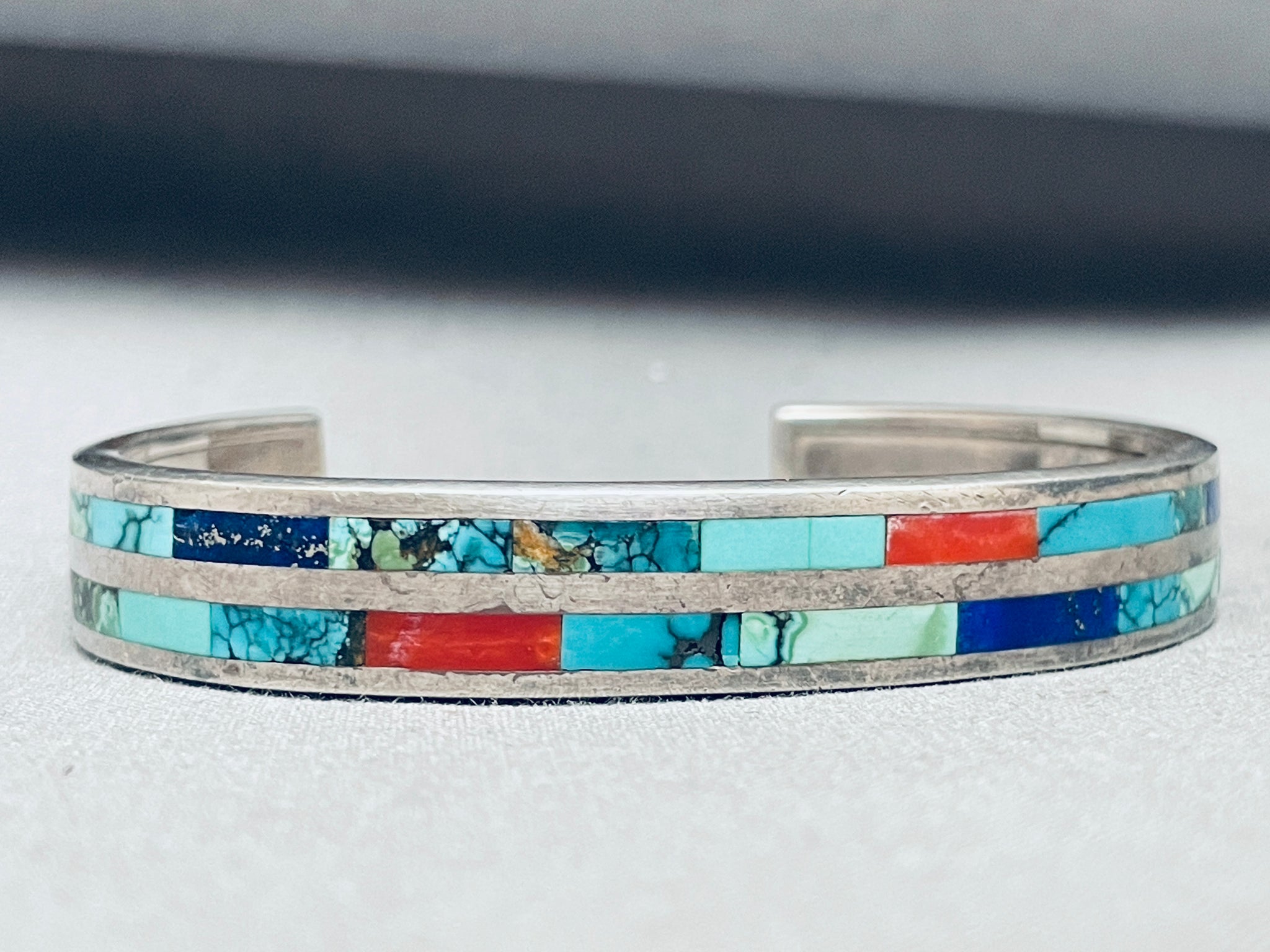 6.5 Inch Wrist Vintage Native American Zuni Turquoise Inlay Sterling Silver Bracelet