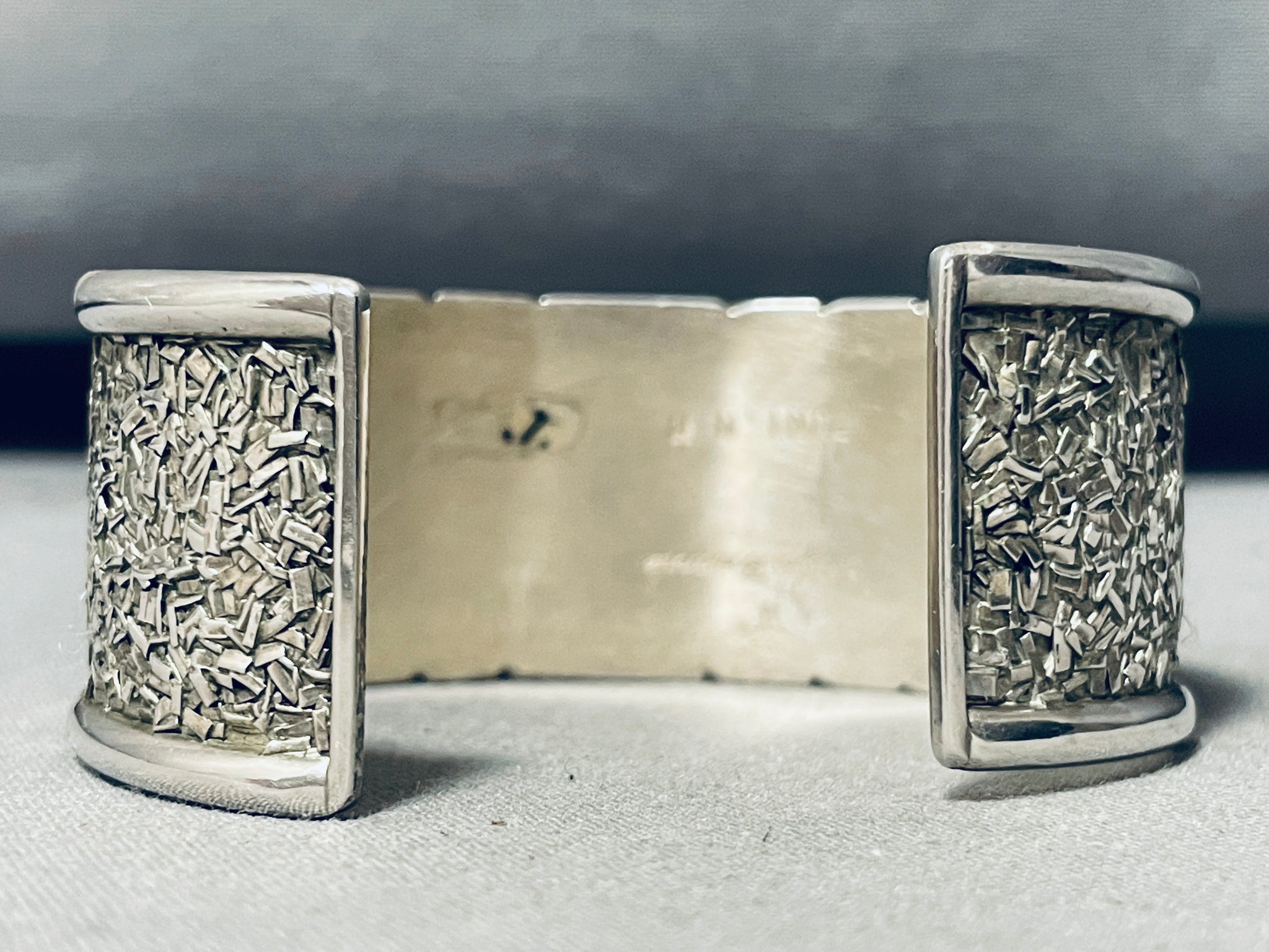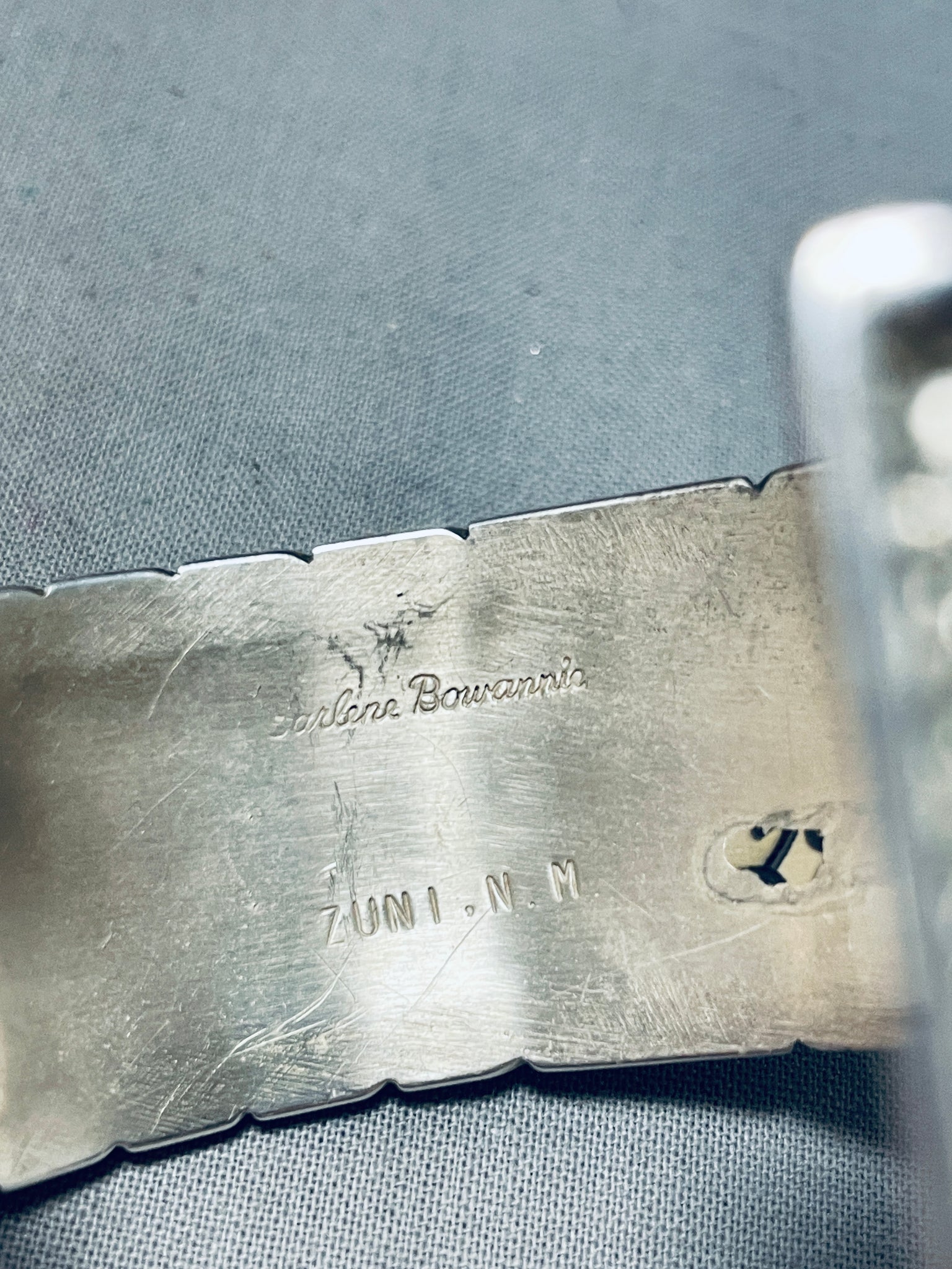 This is a breathtaking vintage Zuni inlaid thick silver cuff bracelet. This superior bracelet contains outstanding inlaid stones and shells that consist of yellow shell, onyx, turquoise, malachite, coral and spiny oyster. Bordering the thick and wide silver cuff are outstanding wave patterns. Running down the ends of the bracelet are remarkable textured silver pieces. The width of the bracelet measures around 1". Signed by Navajo artist, Earlene Bowannie. Sterling silver. Cir. 1970's+. The inside end to end measures around 5-1/2" with an additional 1" gap. Sturdy 41 grams.