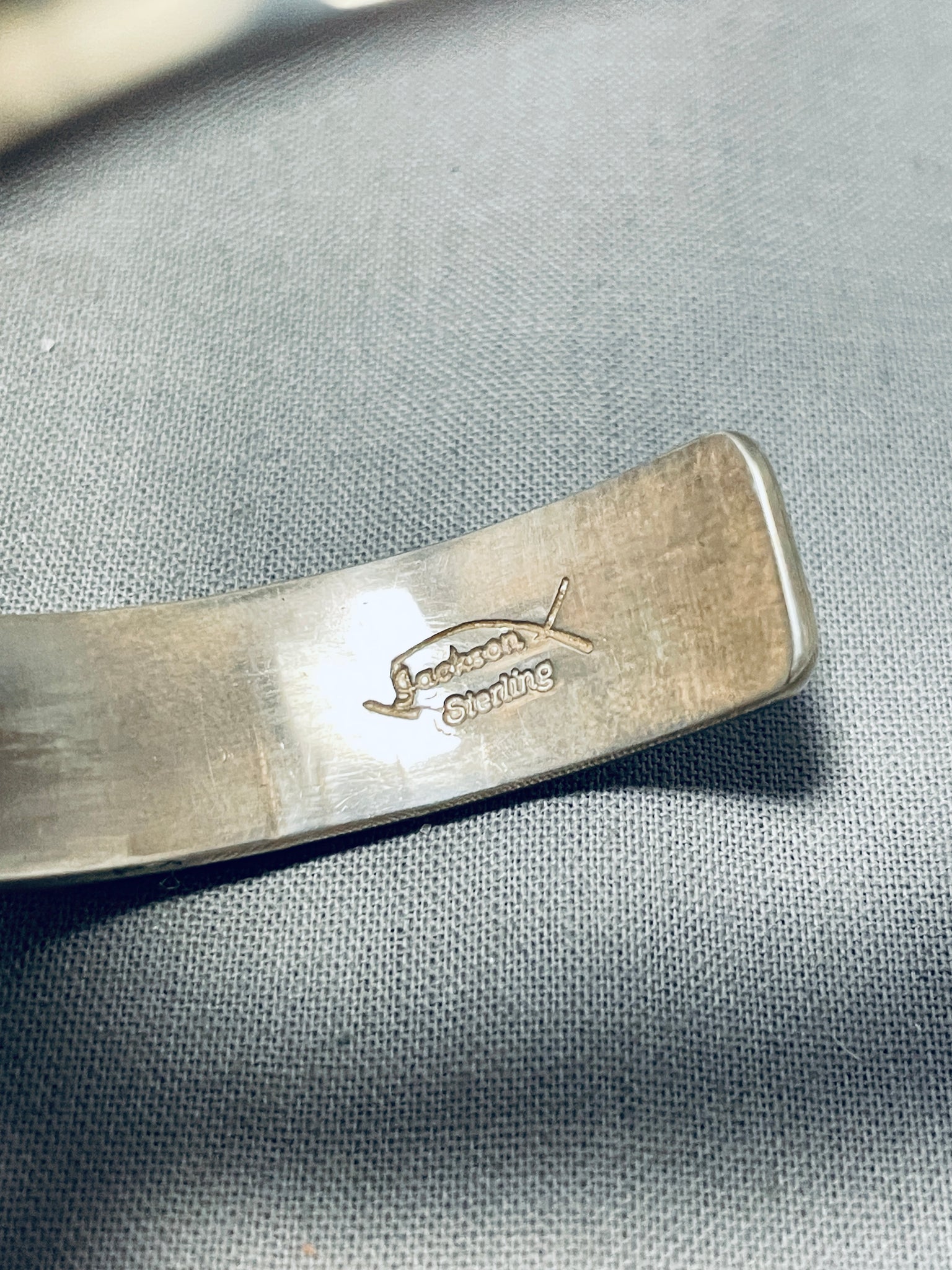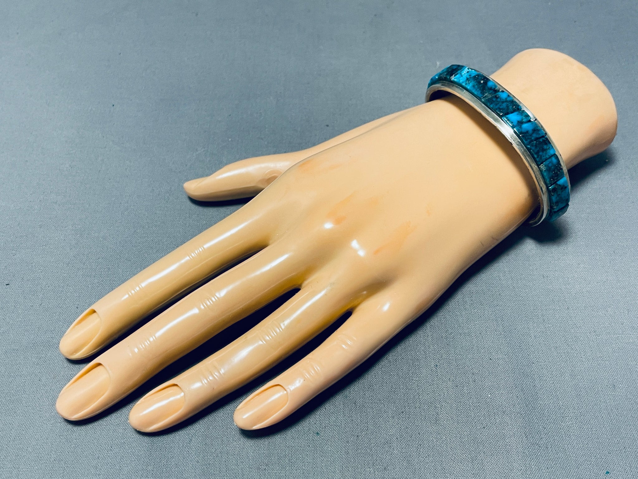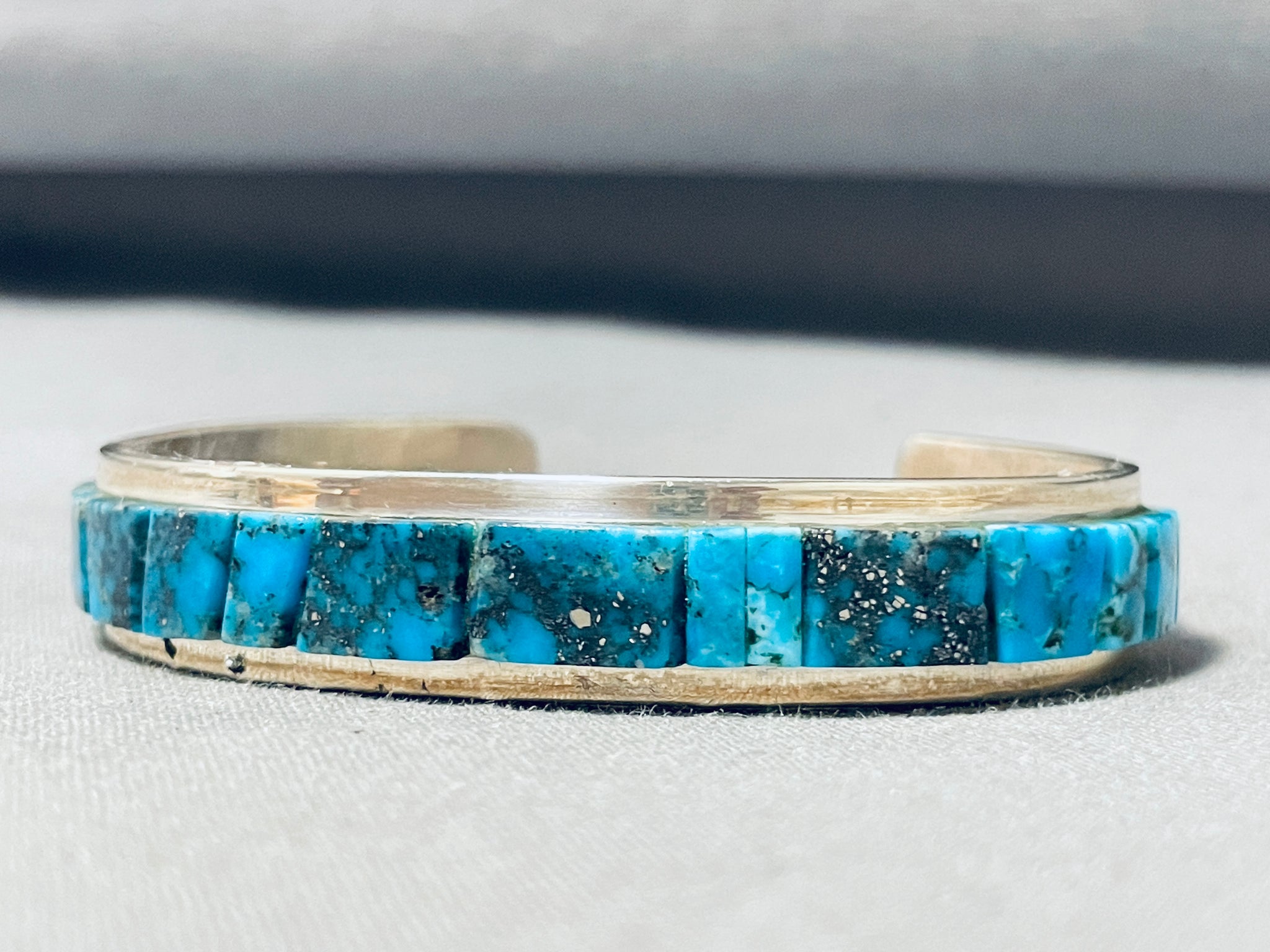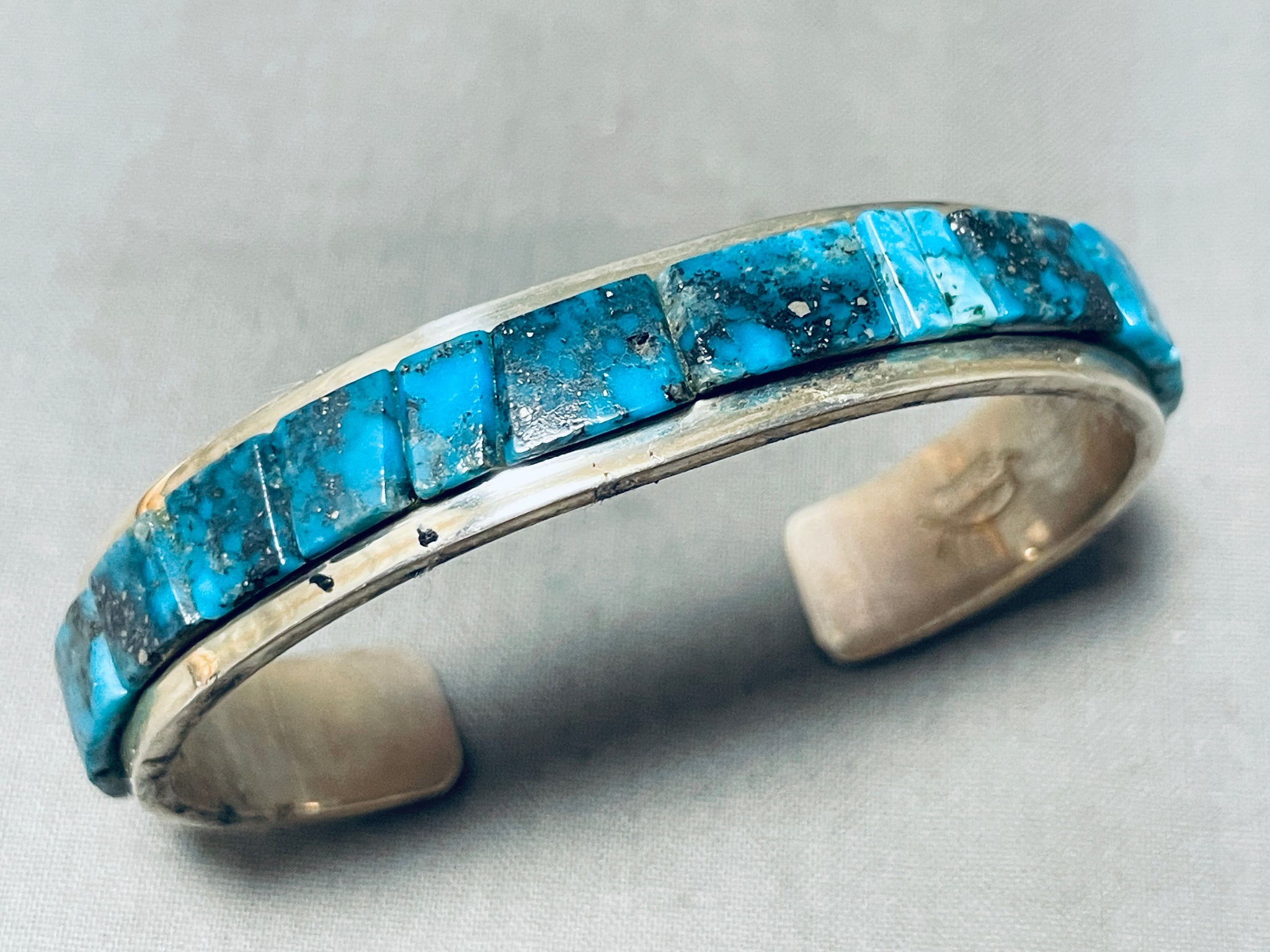 We are proud to offer this fabulous vintage Navajo silver bracelet. Wow! This notable bracelet is done in the unforgettable Cripple Creek turquoise! Reaching from side to side, the inlay stones burst forth from the cuff - making this quite the eye-catching piece! Stunning! Cripple Creek turquoise is a type of turquoise gemstone that comes from the Cripple Creek mine located near the town of Cripple Creek in Colorado, USA has been a significant source of turquoise since the late 1800s. This mine has produced turquoise with distinct characteristics that make it recognizable and sought after in the world of turquoise jewelry. Cripple Creek turquoise is known for its range of blue and green colors, often with golden-brown or reddish matrix. The turquoise from this mine has been used in Native American jewelry and has gained popularity among collectors. Cripple Creek turquoise is considered valuable and collectible, particularly for those who appreciate the distinct characteristics of this specific type of turquoise. The artist, Tommy Jackson is a well-known and highly regarded Navajo silversmith artist renowned for his exceptional craftsmanship and intricate jewelry designs. He has gained international recognition for his work, and his pieces are highly sought after by collectors and enthusiasts. He was born in 1958 in Arizona and belongs to the Navajo Nation. He comes from a family of silversmiths, and he learned the art of jewelry-making from his parents and siblings. He's known for his distinctive style that combines traditional Navajo designs with contemporary elements and his designs often pay homage to traditional Navajo art while showcasing his personal creative flair. The width of the bracelet measures around 1/2". Signed by Navajo artist, Tommy Jackson. Sterling silver, marked. The inside end to end measures around 5-3/4" with an additional 1" gap. Sturdy 36 grams.