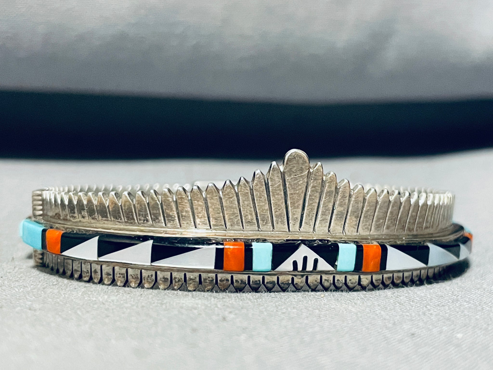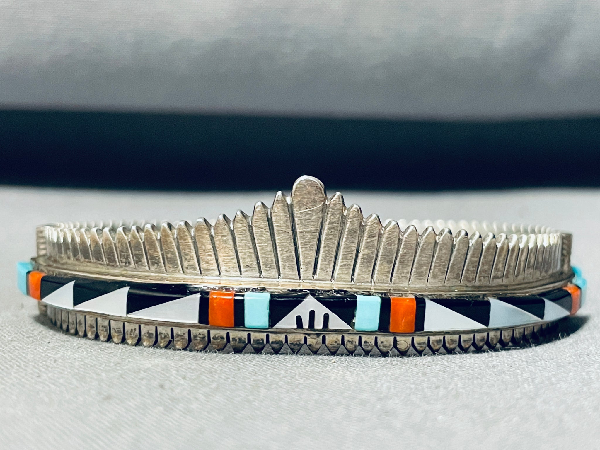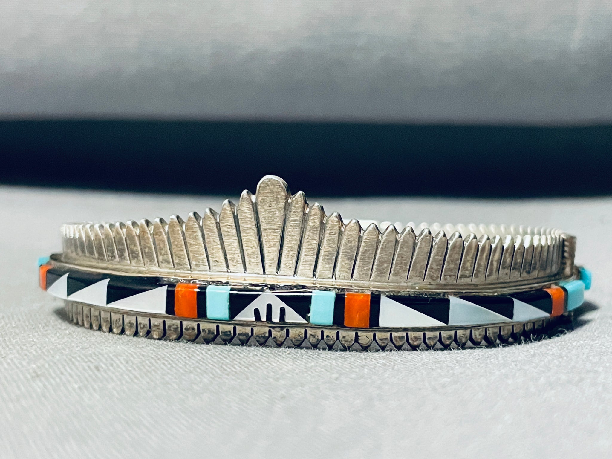 This is a superior vintage Zuni inlaid silver clasp bracelet. This fascinating bracelet contains an inlaid section that wraps nearly around the entire cuff. The inlaid stones and shells consist of coral, Sleeping Beauty turquoise, onyx and mother of pearl. I absolutely love the beautiful clasp on this bracelet. Bordering the crown shaped bracelet all the way from the ends to the center are stunning channel works. This bracelet can fit a wrist size of about 6-1/4". The width of the bracelet measures around 5/8". Signed by Zuni artist, Jay B. Sterling silver, marked. Cir. 1970's+. Sturdy 24 grams.