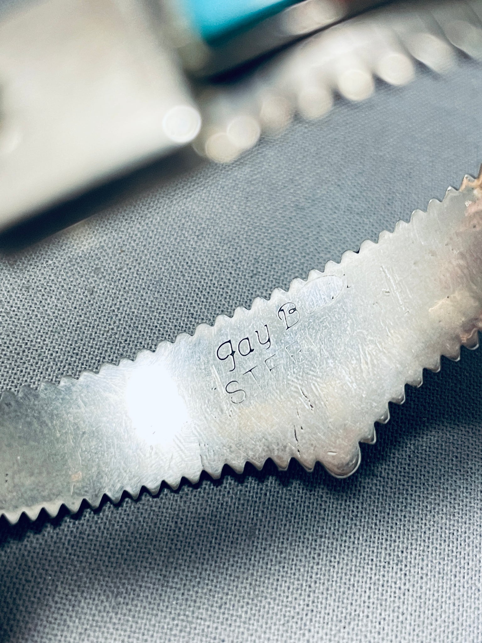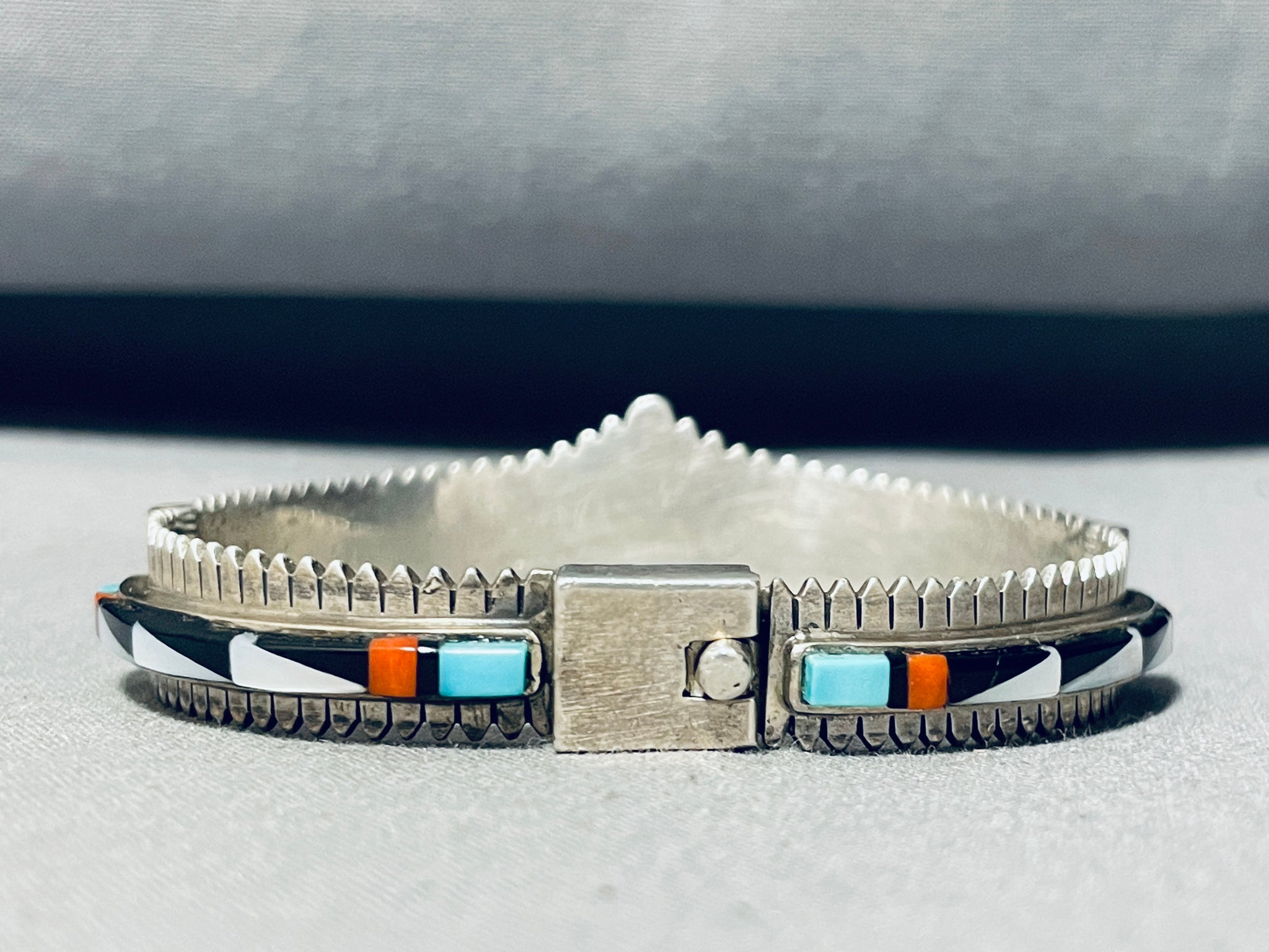 6 Inch Wrist Vintage Native American Zuni Turquoise Inlay Sterling Silver Clasp Bracelet