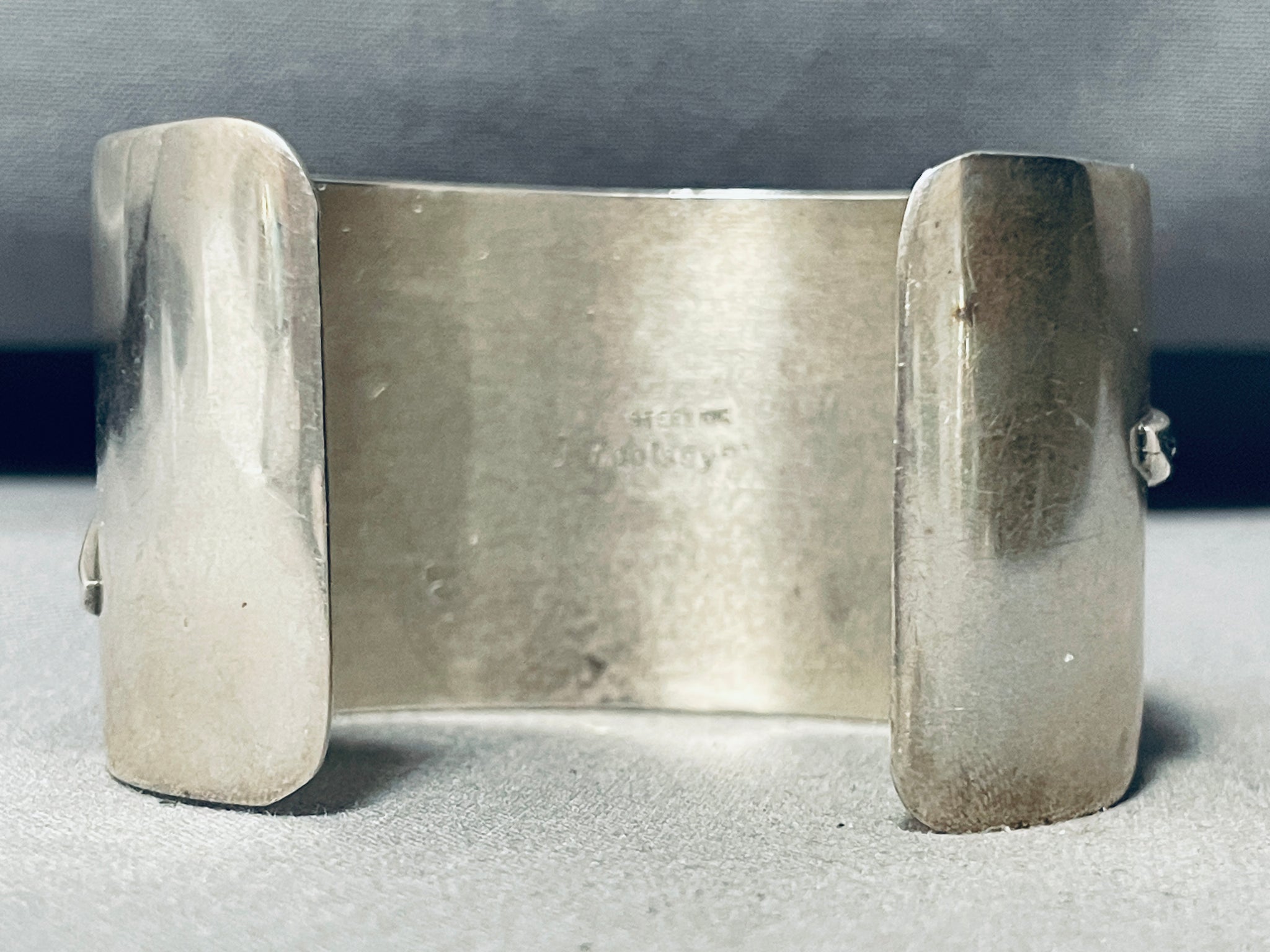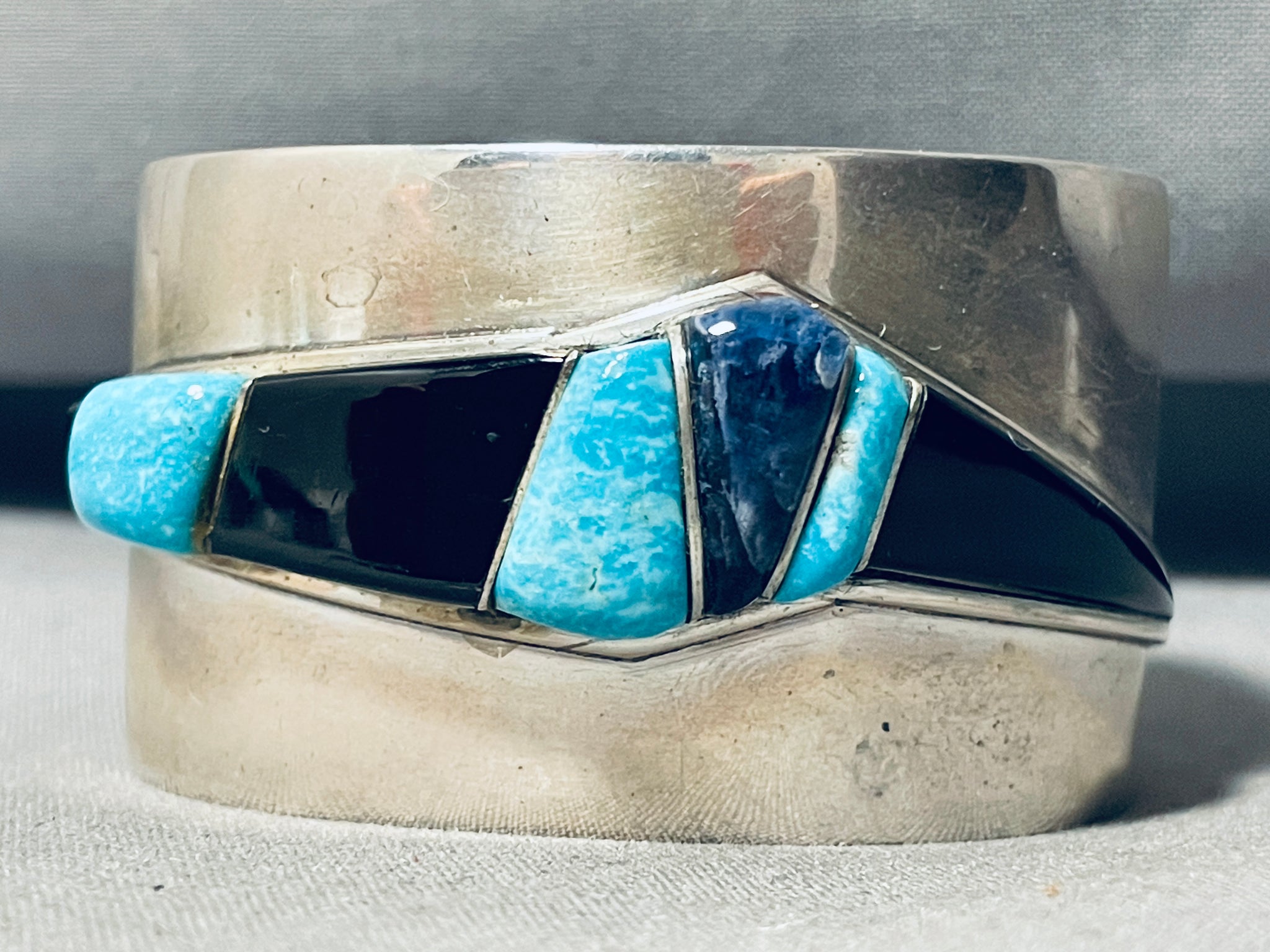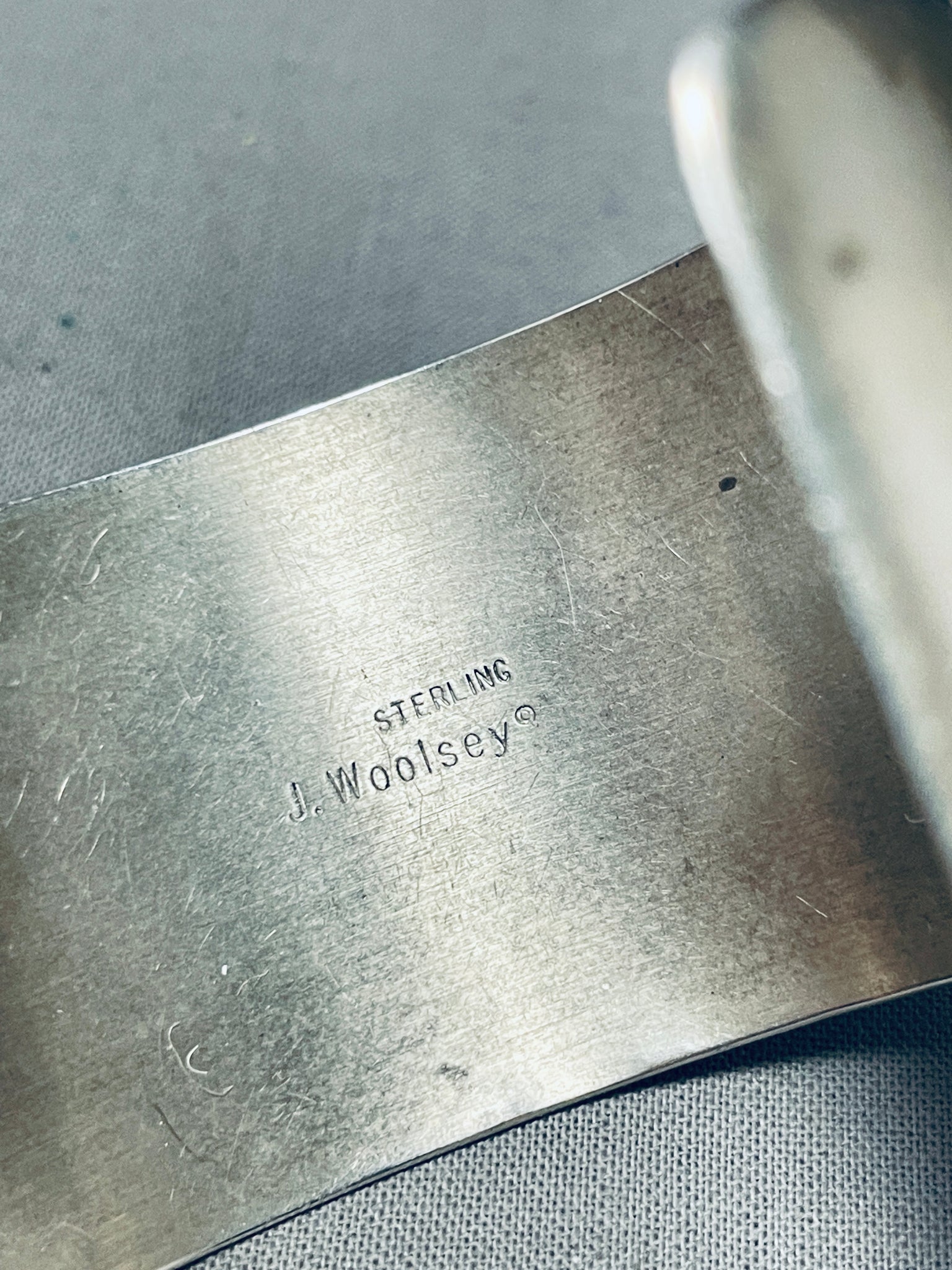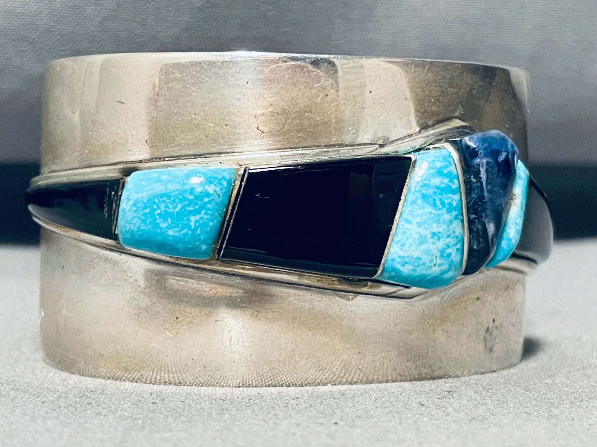 This is a superlative Navajo inlaid thick silver cuff bracelet. This fascinating bracelet contains beautiful protruding inlaid stones that consist of lapis, turquoise and onyx. The width of the cuff is wide and so amazing. I absolutely love the simplicity of this bracelet but yet the complex design of the protruding inlaid stones. The width of the bracelet measures around 1-1/4". Signed by Navajo artist, J Woolsey. Sterling silver, marked. Cir. 1970's+. The inside end to end measures around 5" with an additional 1" gap. Sturdy 46 grams.