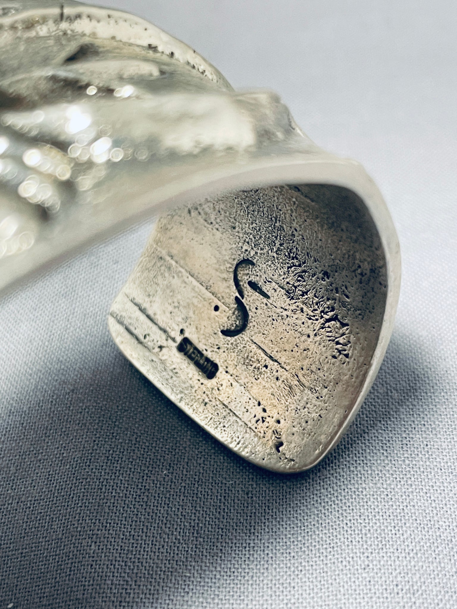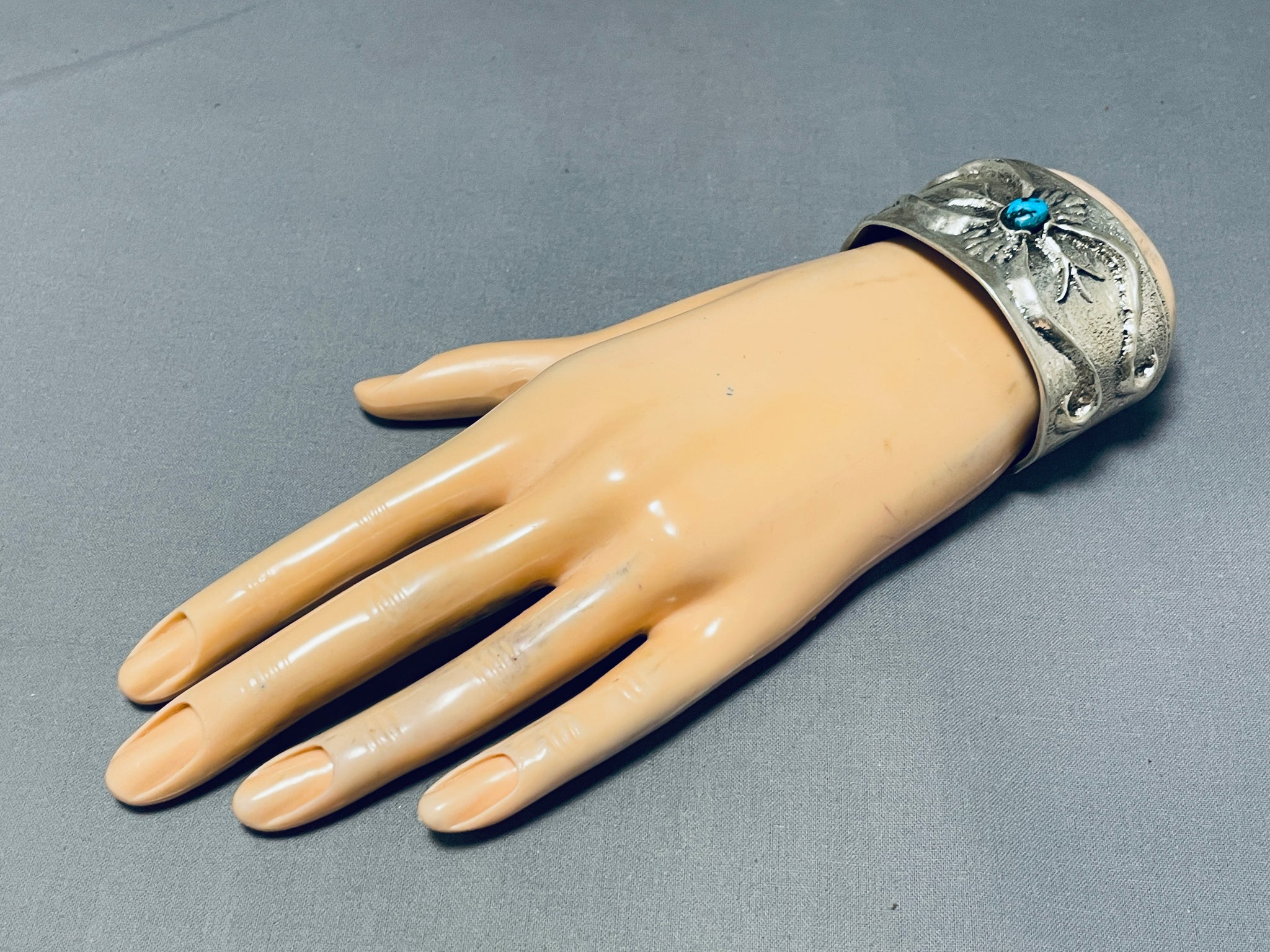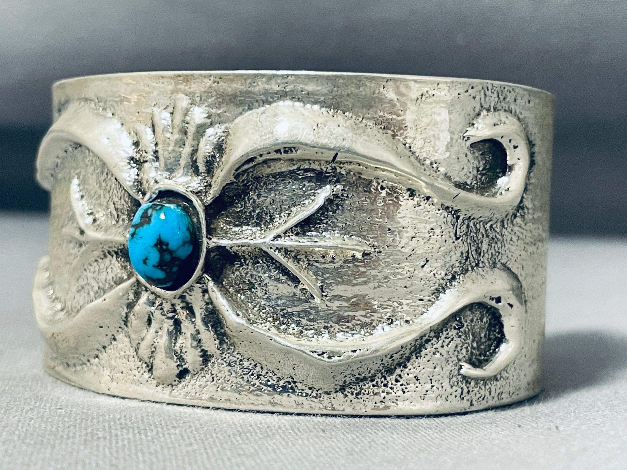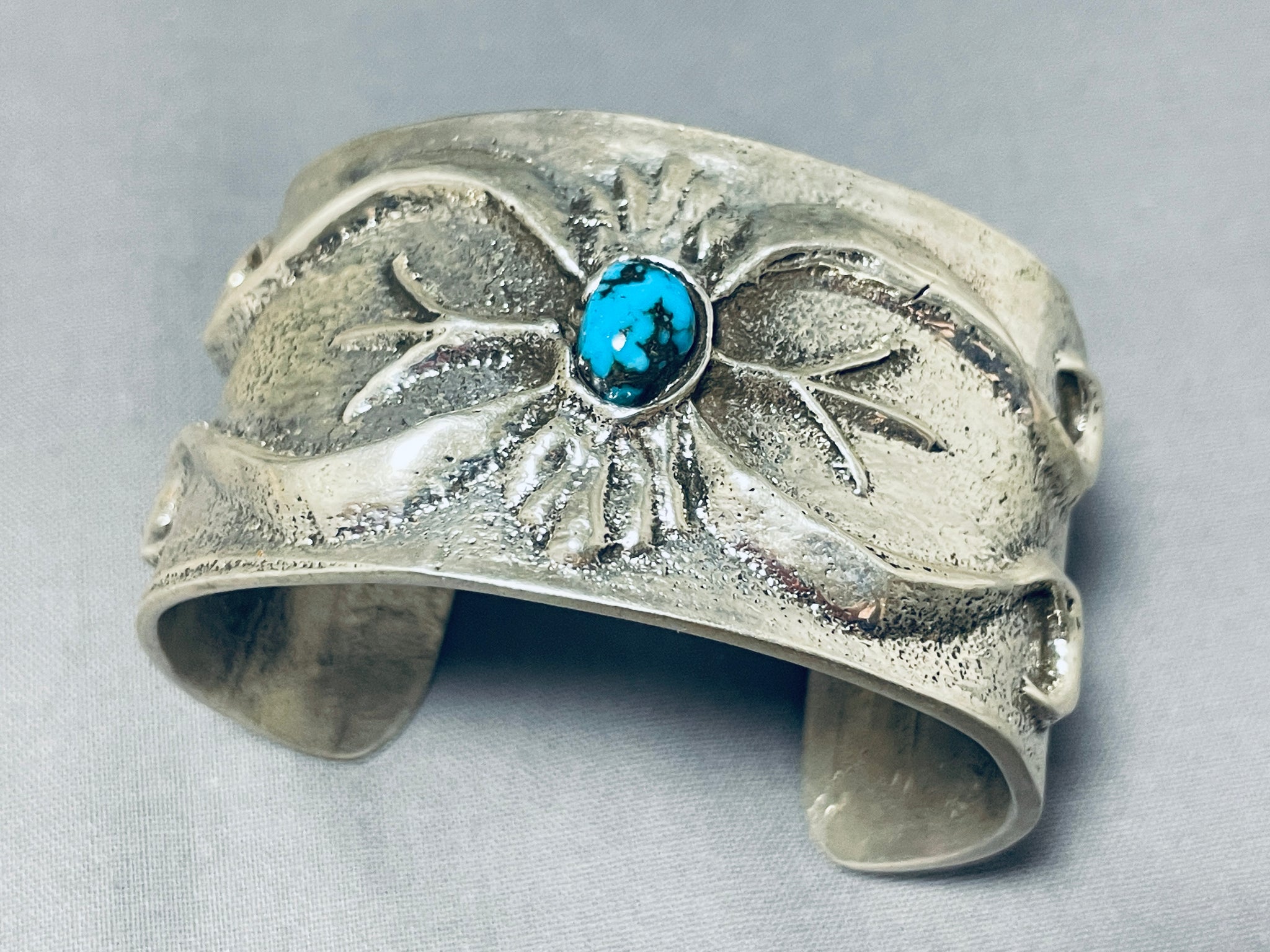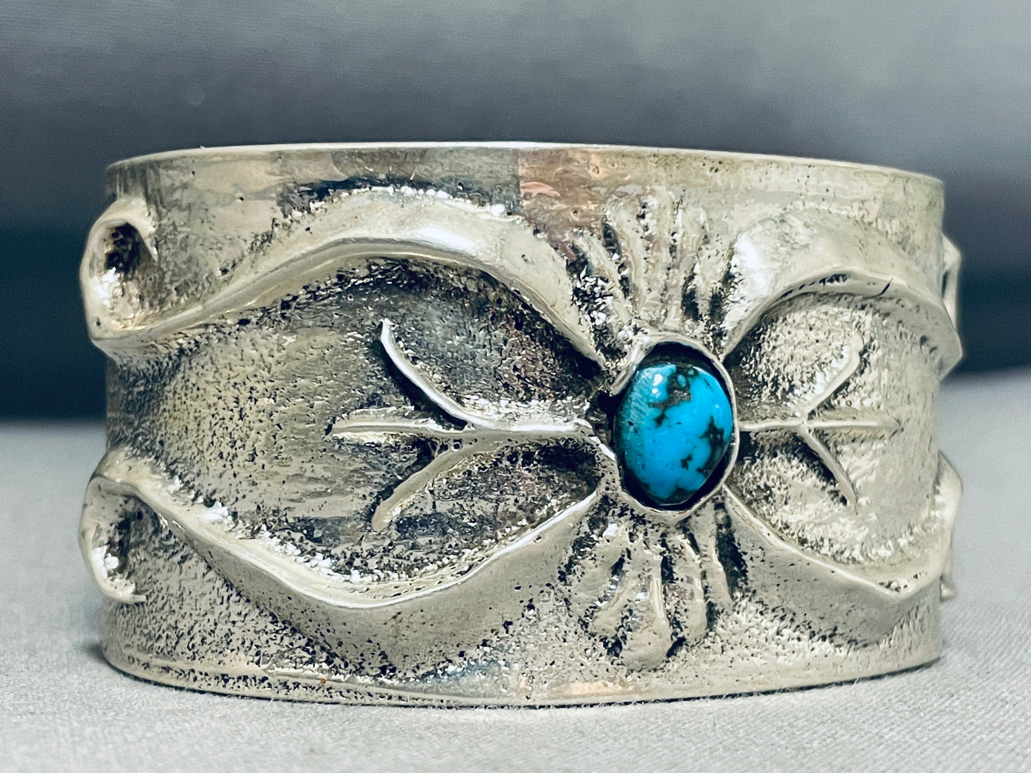 This is an exquisite Navajo single stone silver cuff bracelet. This wonderful bracelet contains a center Bisbee turquoise stone that is surrounded by amazing silver works. The entire cuff is beautifully tufa casted and very thick. I absolutely love the surrounding thorn and plant patterns that surround the center stone. The center stone measures around 3/8" x 1/4". The width of the bracelet measures around 1-1/4". Signed by Navajo artist, Stu Billie . Sterling silver, marked. Cir. 1970's+. The inside end to end measures around 5" with an additional 1" gap. Sturdy 80 grams.